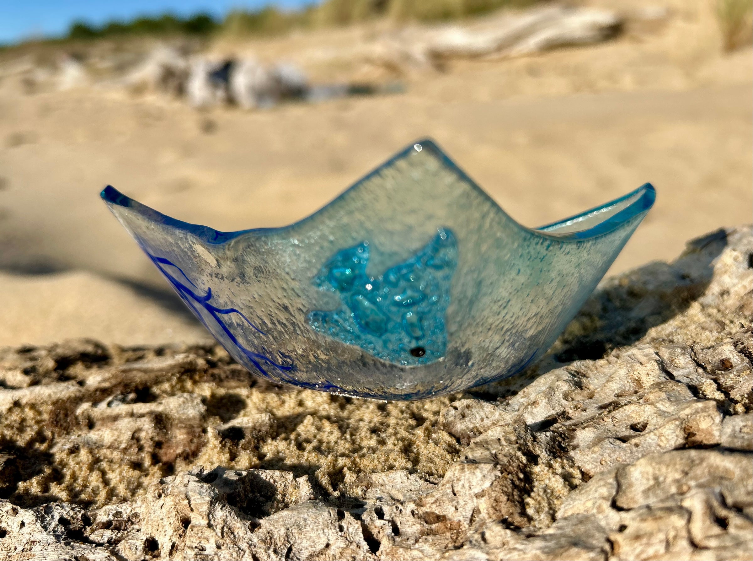 Sur chaque coupelle, un poisson turquoise en relief semble nager le long d’un motif de corail bleu marine, créant une petite scène sous-marine pleine de poésie. La transparence du verre et ses innombrables petites bulles capturent la lumière comme de l’eau en mouvement.