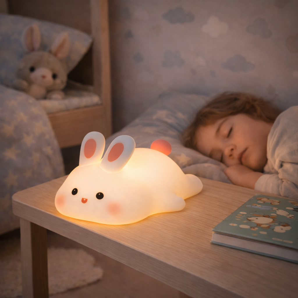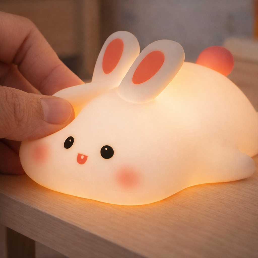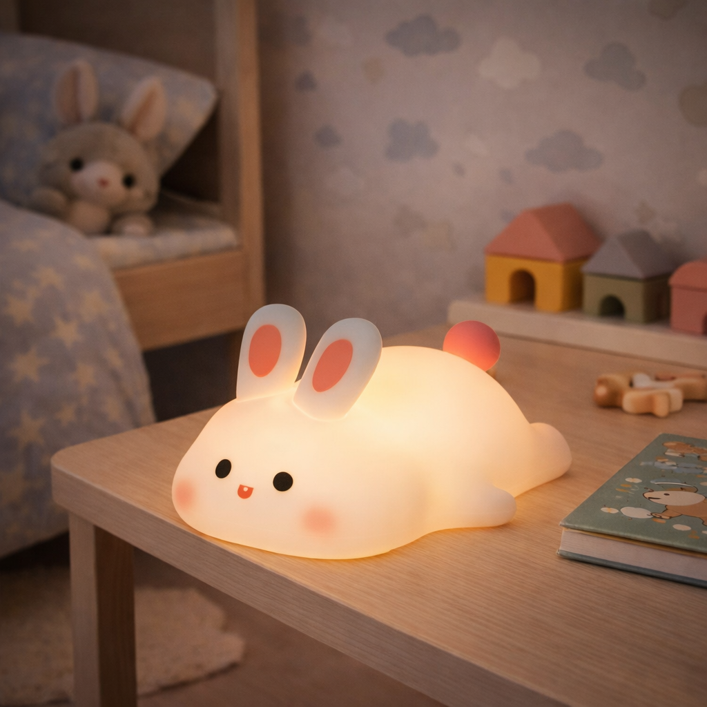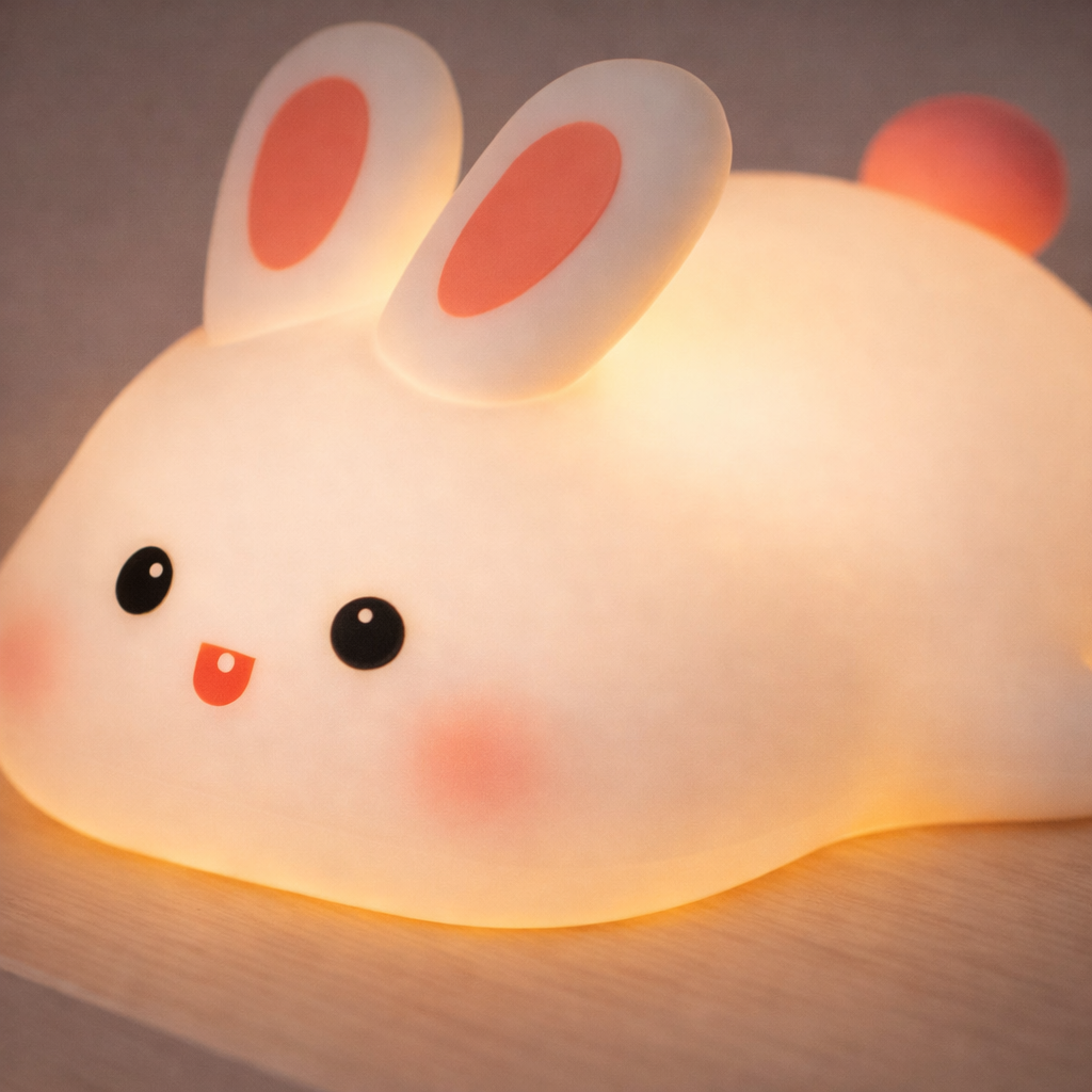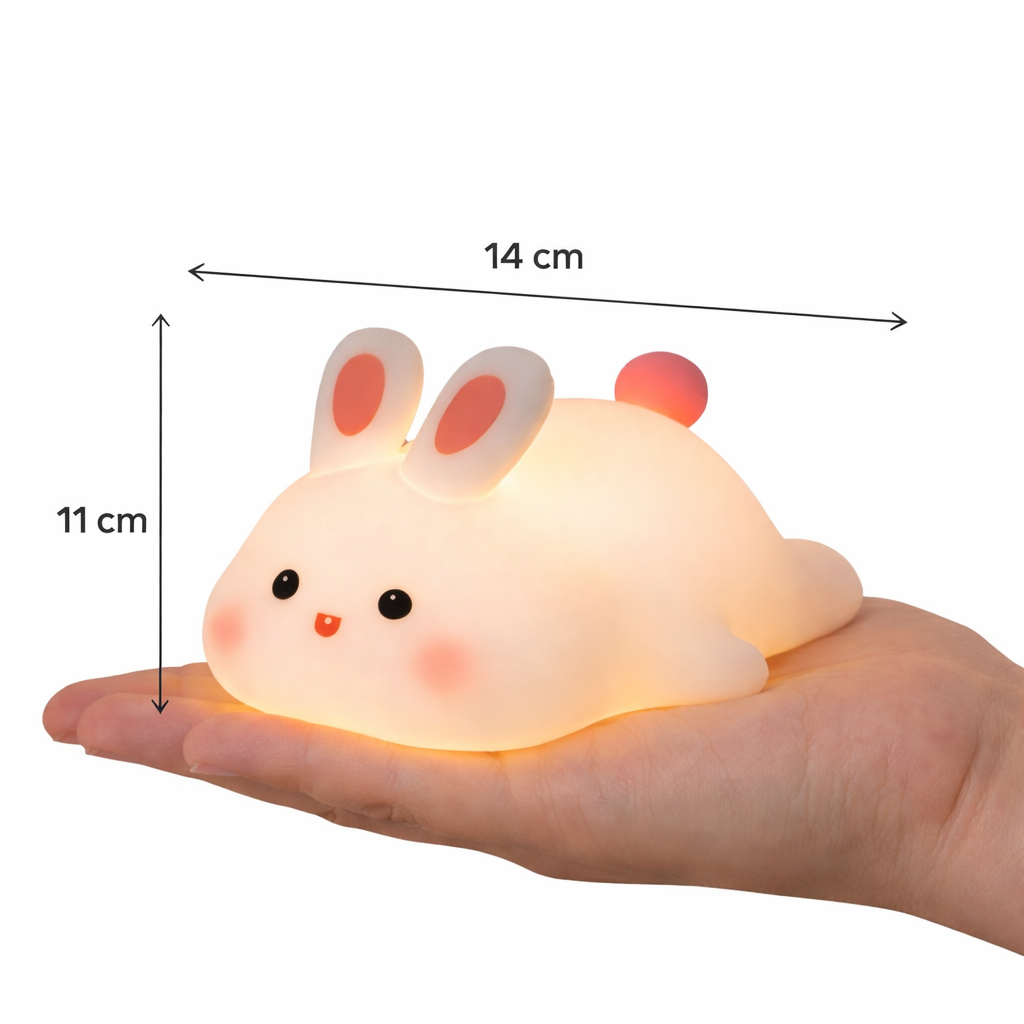 Conçue en silicone souple avec base en ABS (plastique), cette veilleuse offre une matière agréable au toucher, parfaitement adaptée aux petites mains. Son design ludique, agrémenté d’un délicat détail vert clair, en fait un véritable objet déco pour les univers puériculture et chambre bébé.