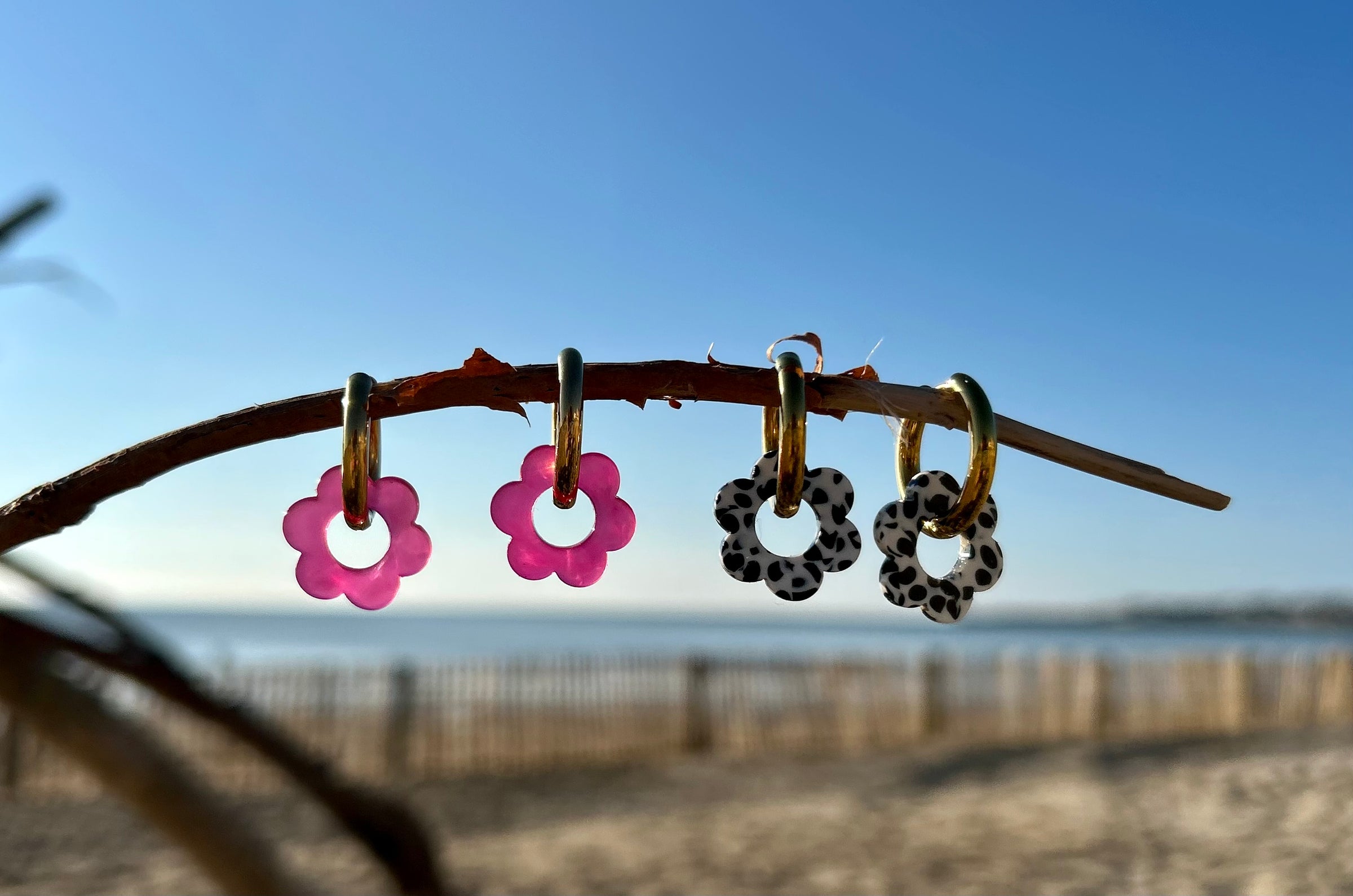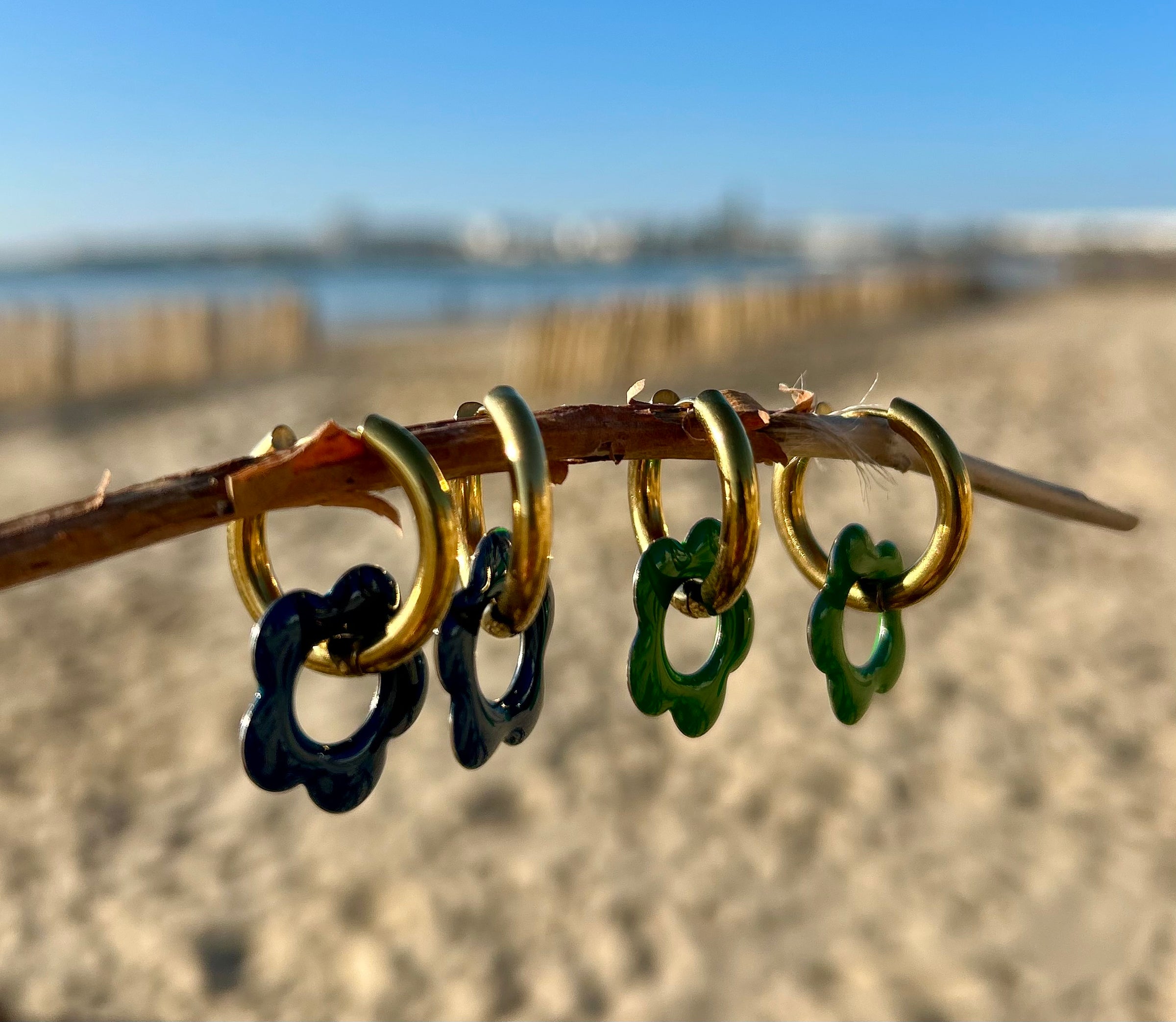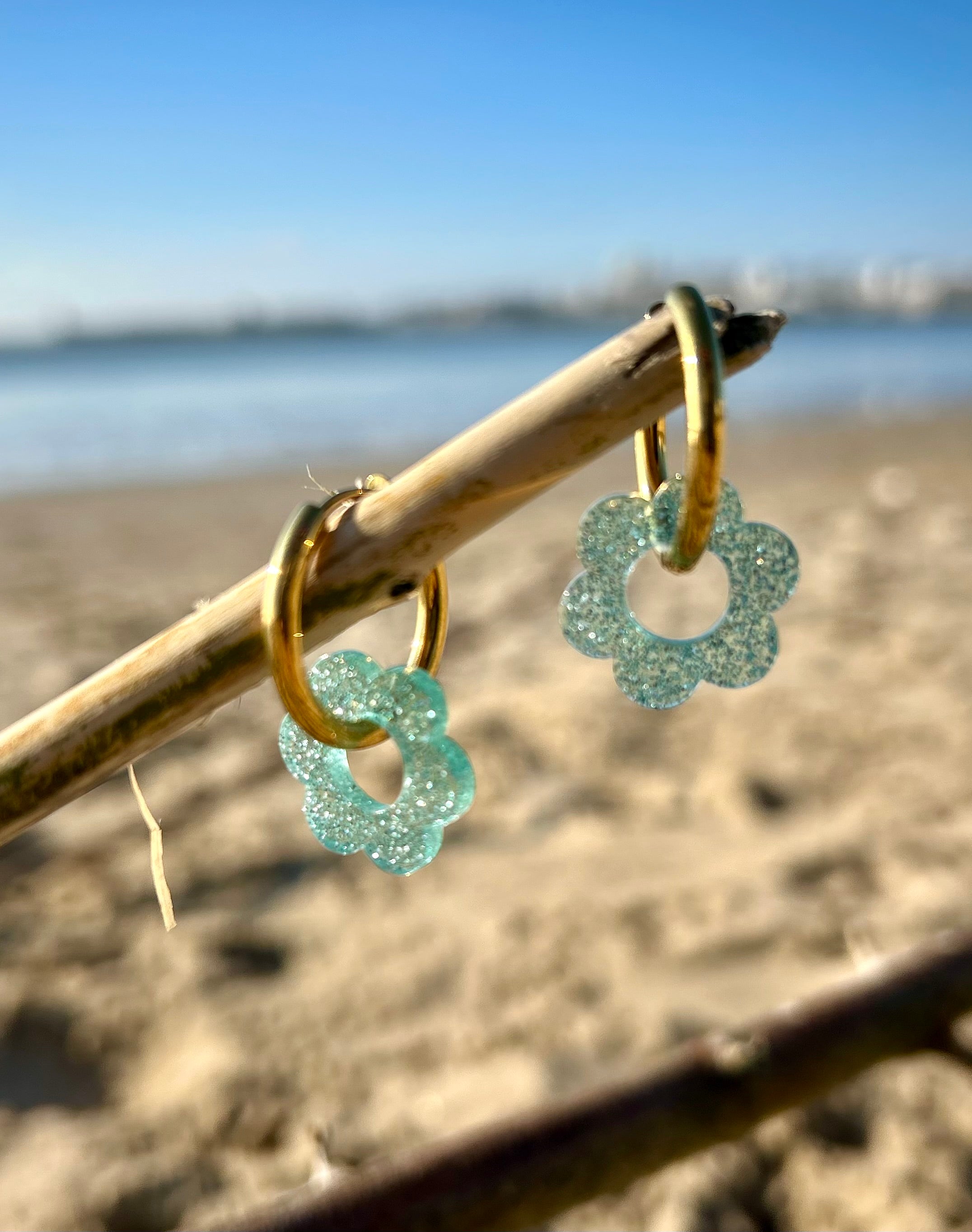 Les fleurs en résine, délicatement façonnées, jouent avec la transparence, les paillettes et les effets bicolores ou unis, évoquant les reflets de l’eau, du sable et du soleil. Montées sur de fines créoles, elles apportent une touche lumineuse et joyeuse à toutes vos tenues.