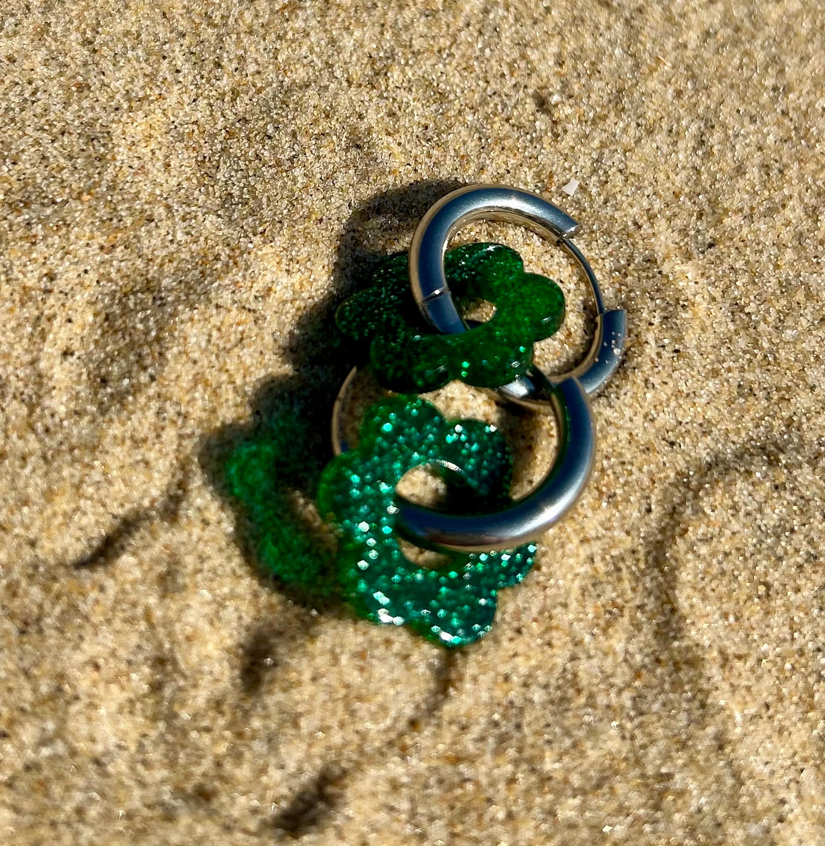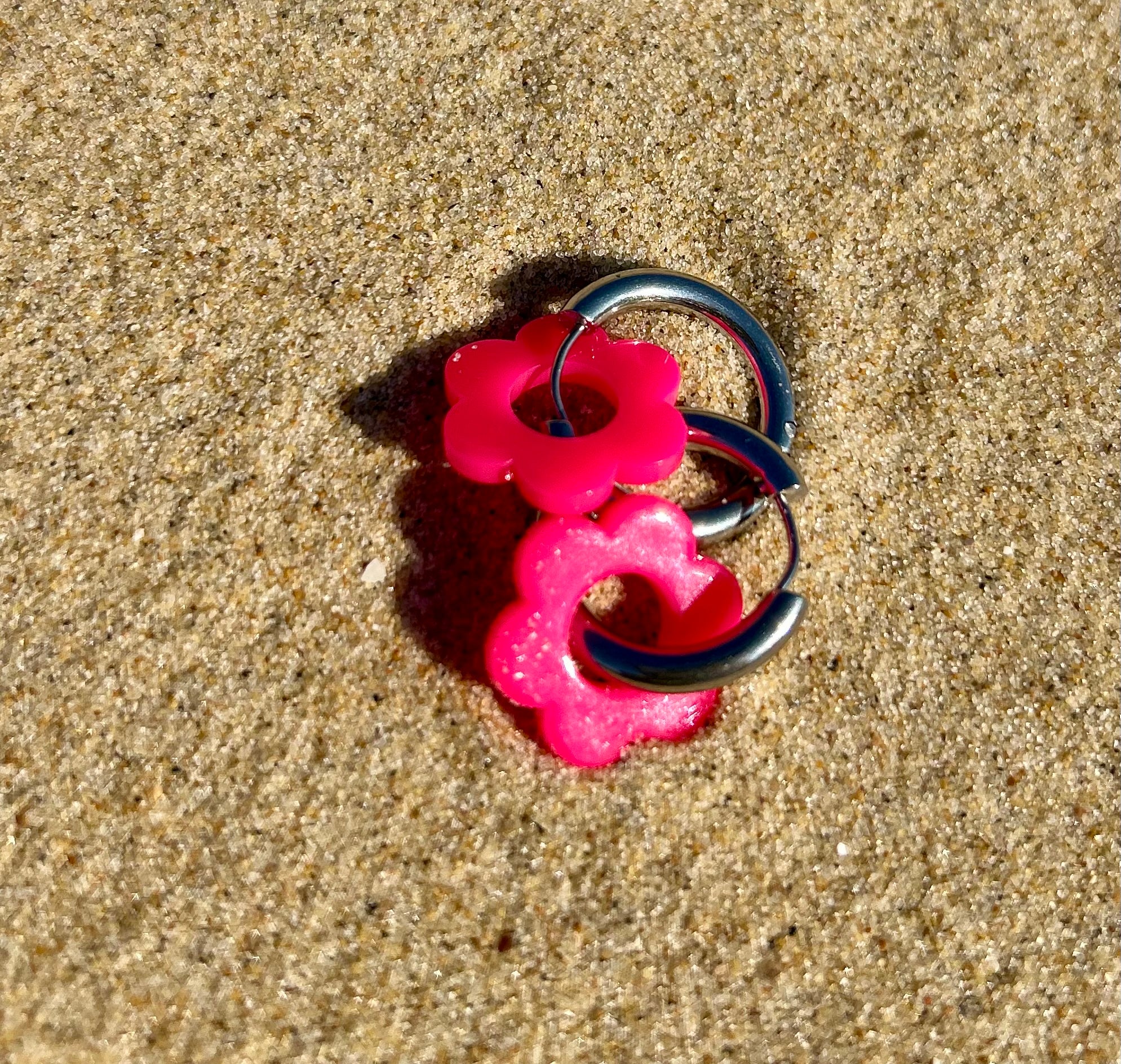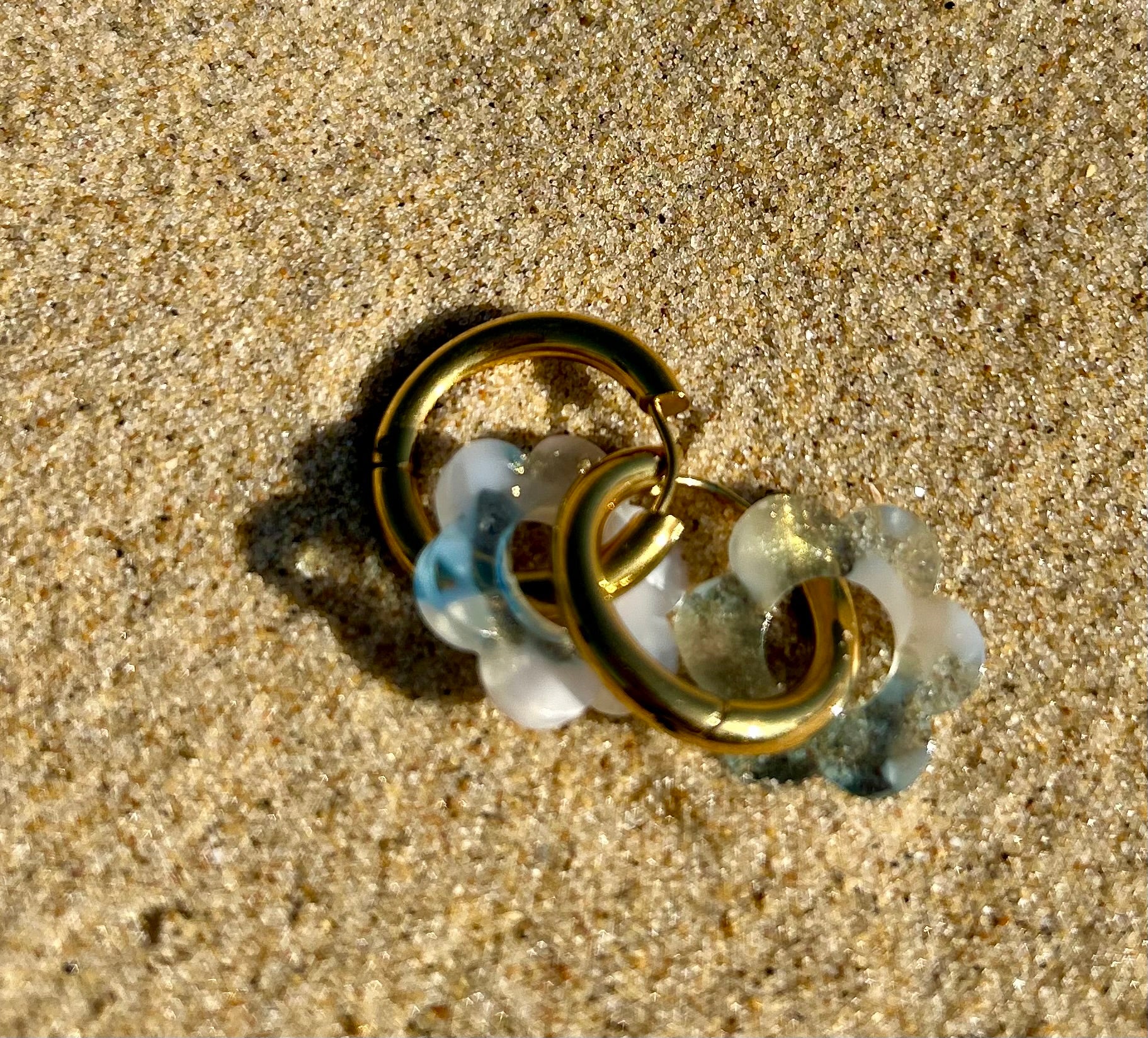 Les fleurs en résine, délicatement façonnées, jouent avec la transparence, les paillettes et les effets bicolores ou unis, évoquant les reflets de l’eau, du sable et du soleil. Montées sur de fines créoles, elles apportent une touche lumineuse et joyeuse à toutes vos tenues.