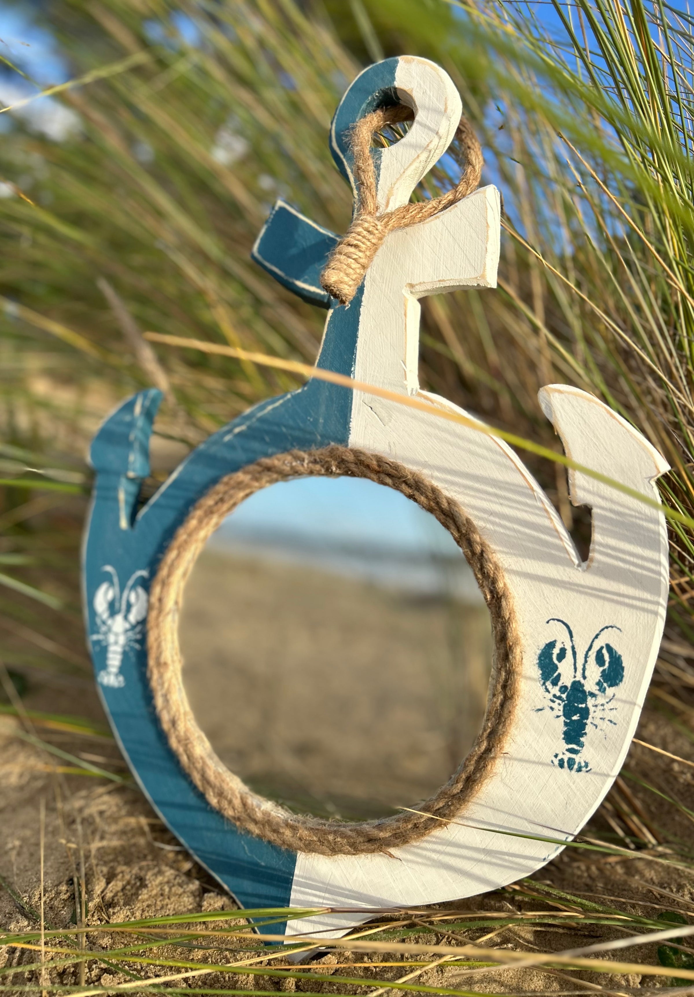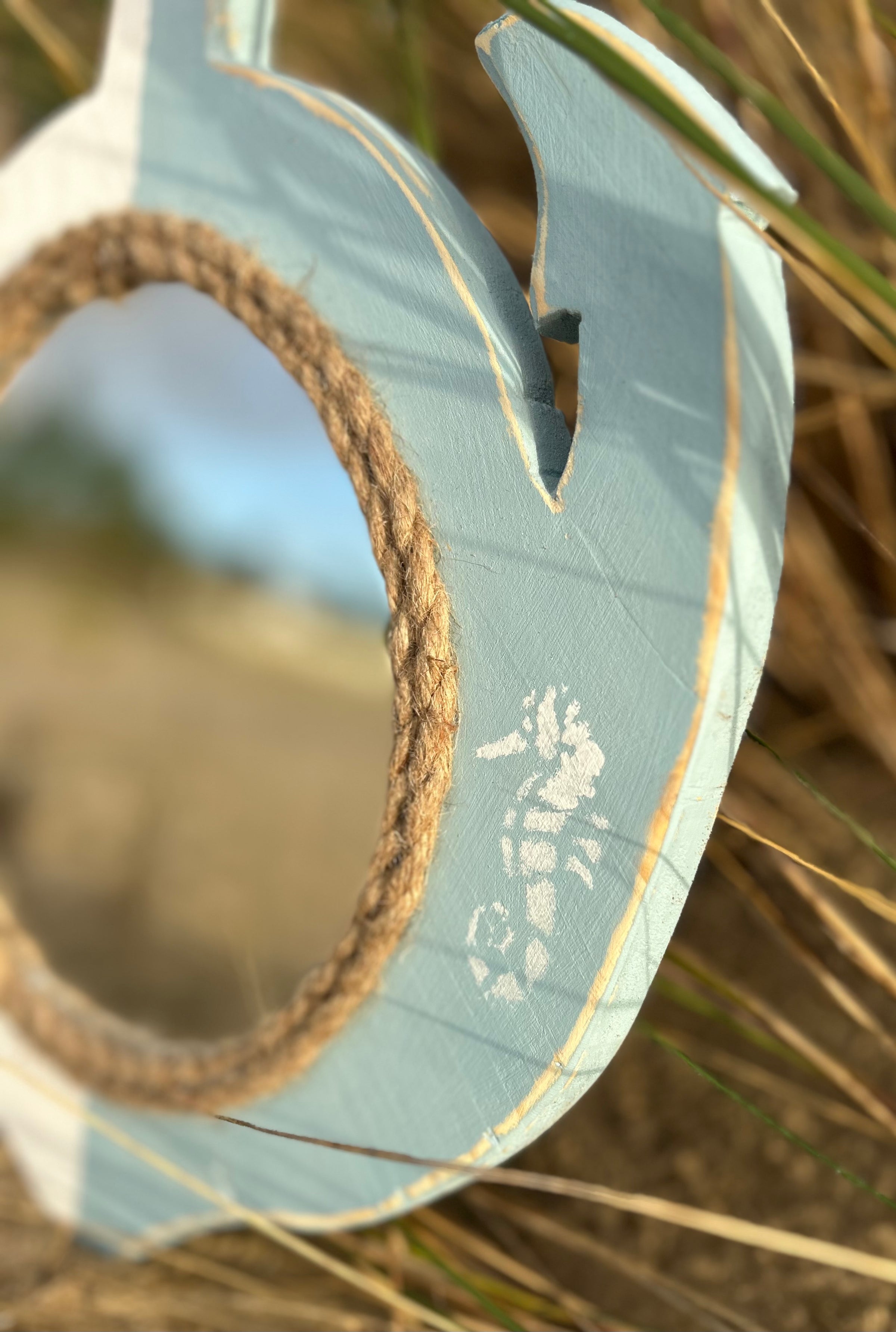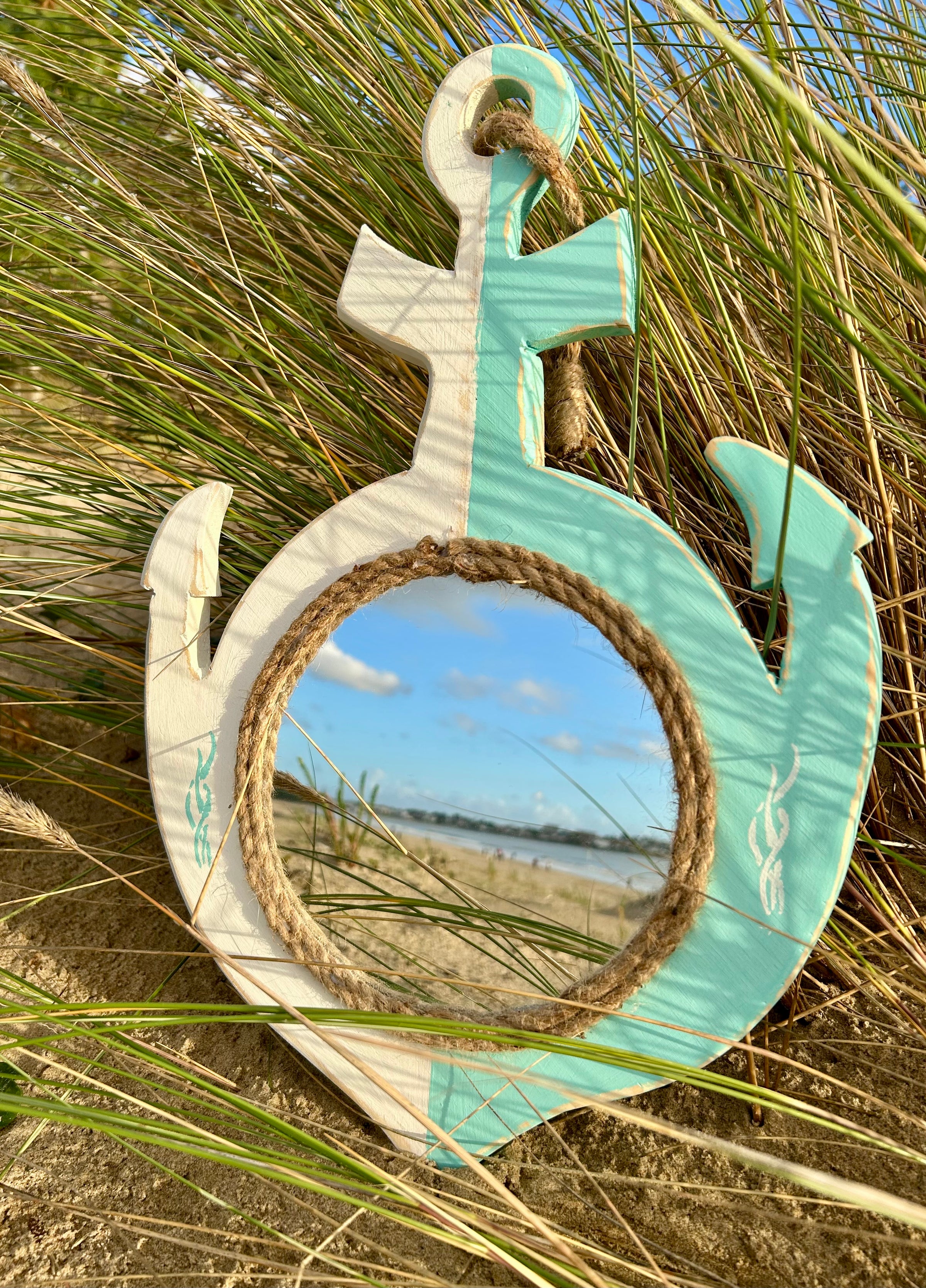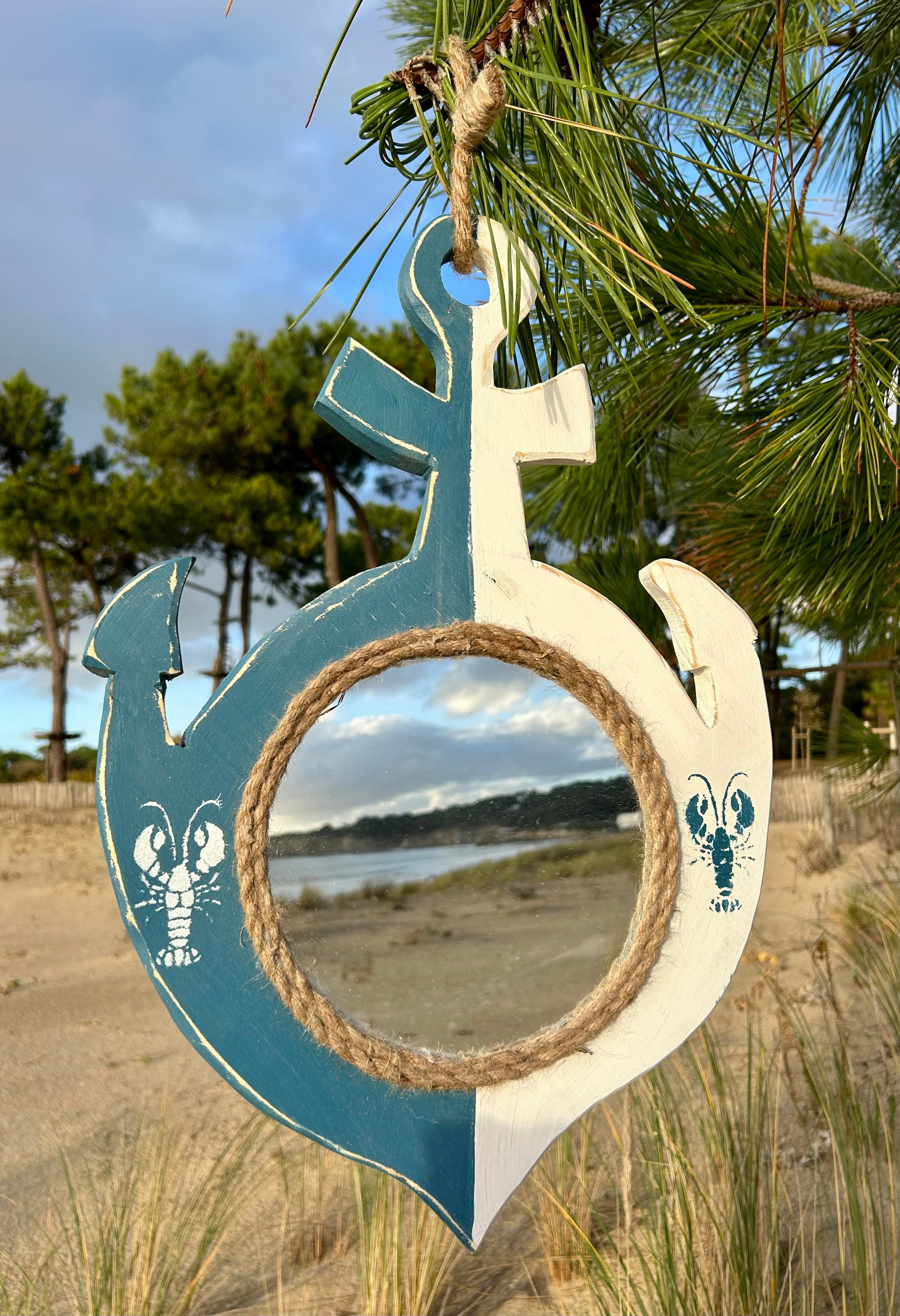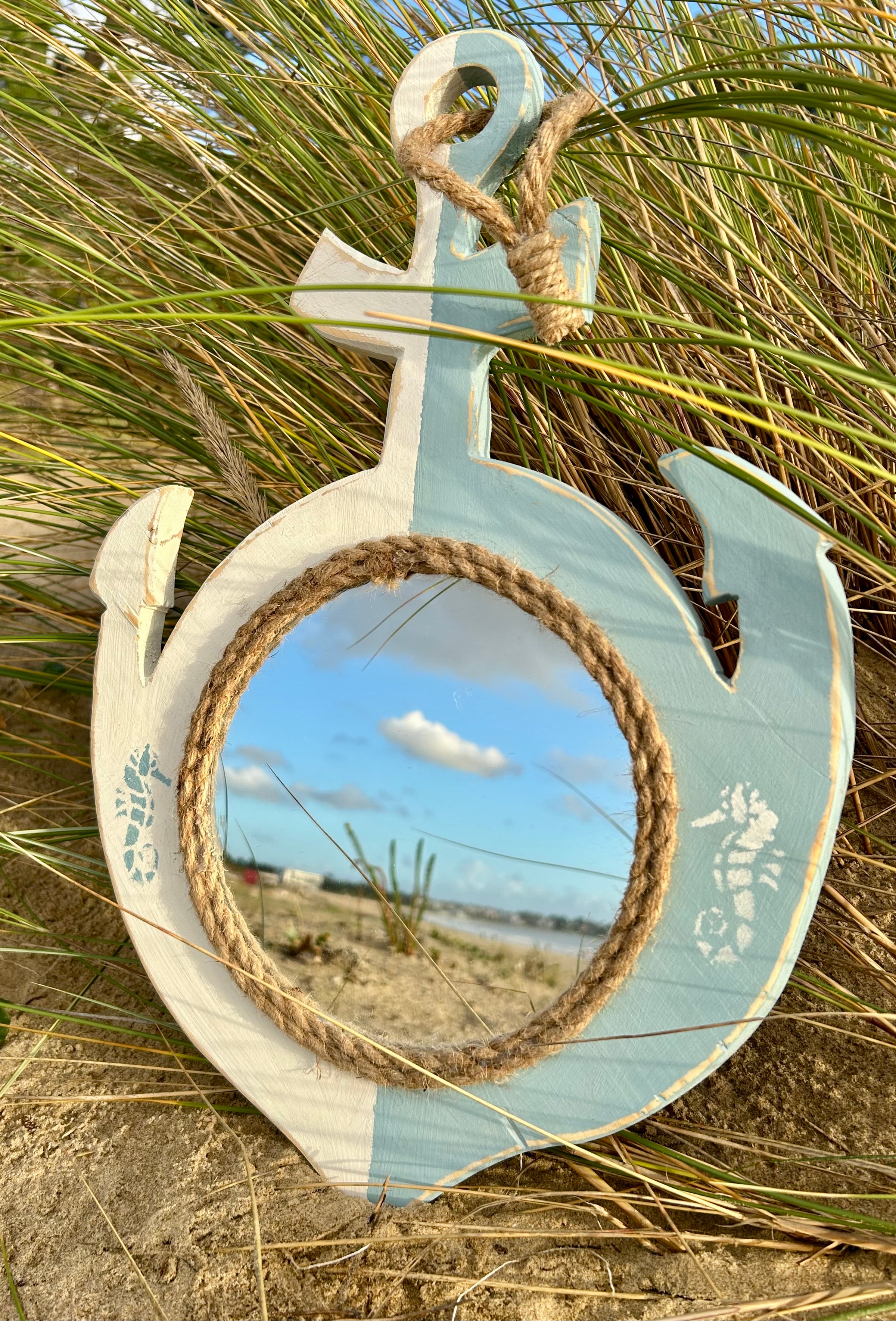 Laissez entrer l’esprit de l’océan dans votre intérieur avec ce miroir ancre marine en bois, une création artisanale signée Les Créations de Marie. Sculpté et peint à la main, il capture toute la poésie du littoral atlantique : le sable doré, la brise salée, la lumière changeante des dunes et le bleu profond de la mer.