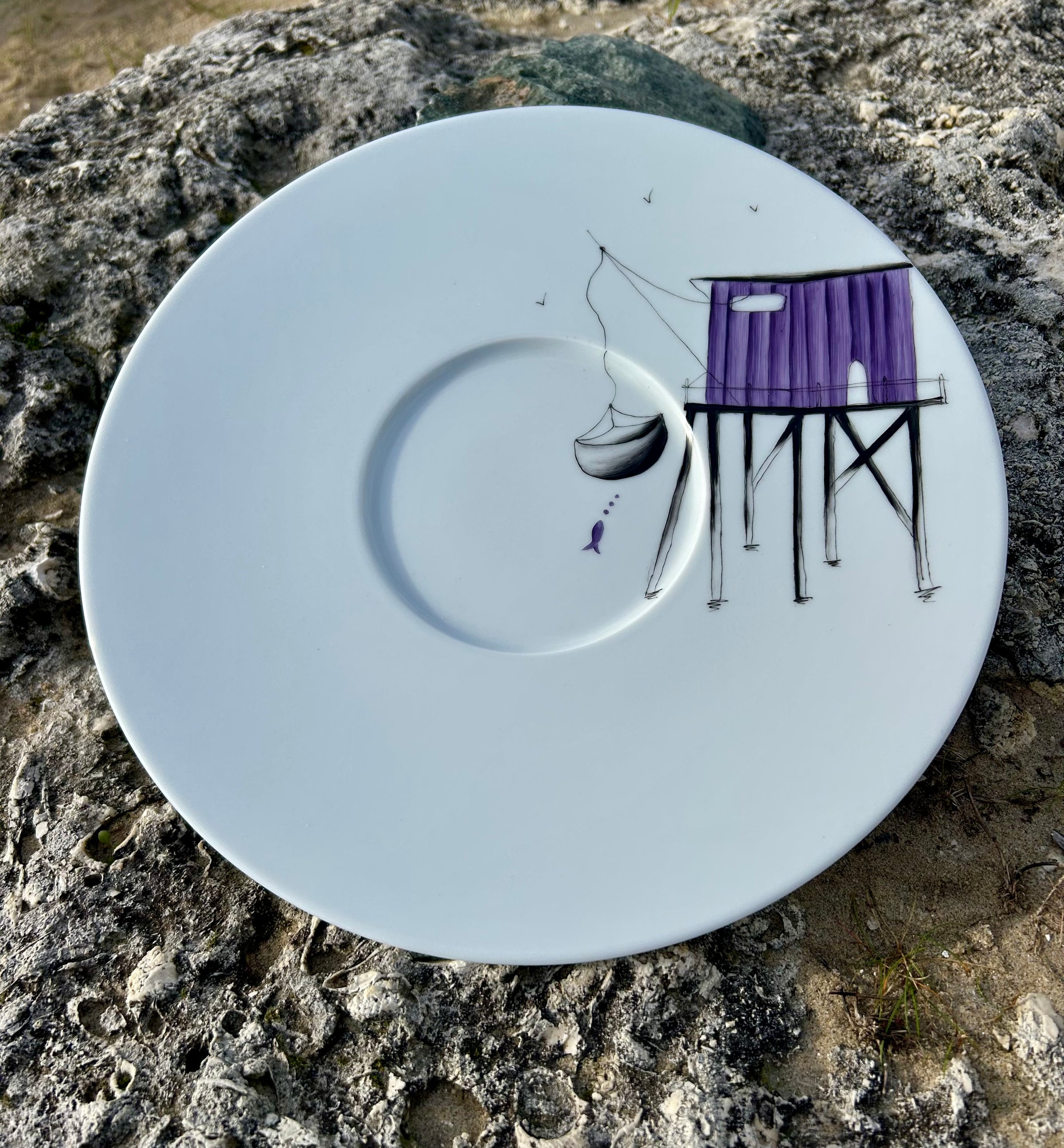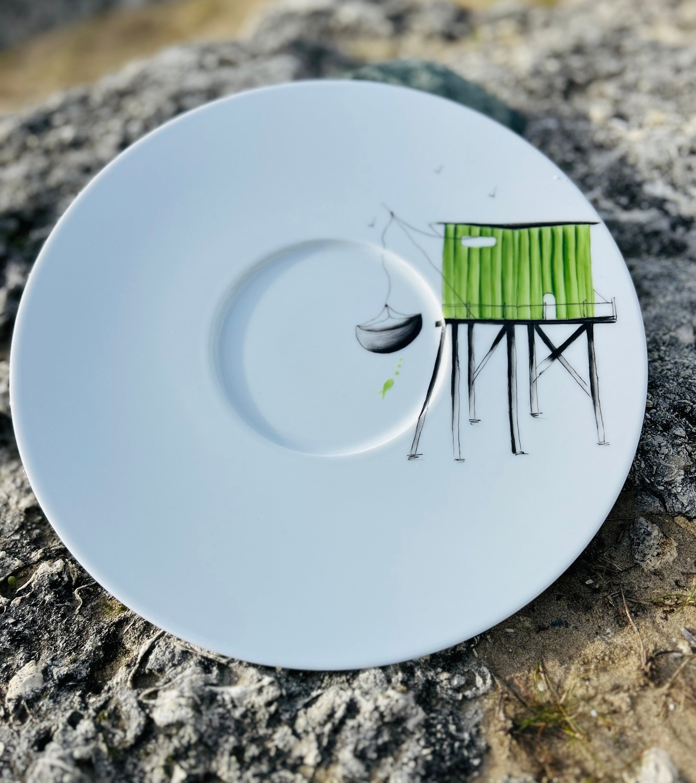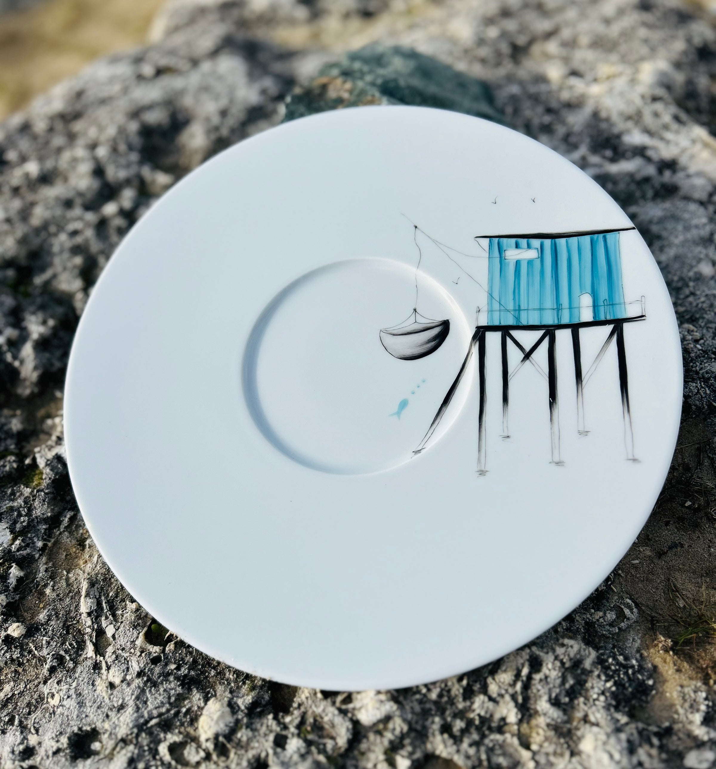 Sublimez votre table avec ces grandes assiettes en porcelaine, illustrées d’un carrelet emblématique de nos côtes, signé Alibabeth & les 40 couleurs. Chaque pièce est peinte à la main, faisant de chaque assiette une création unique qui allie savoir-faire artisanal et esthétisme contemporain.