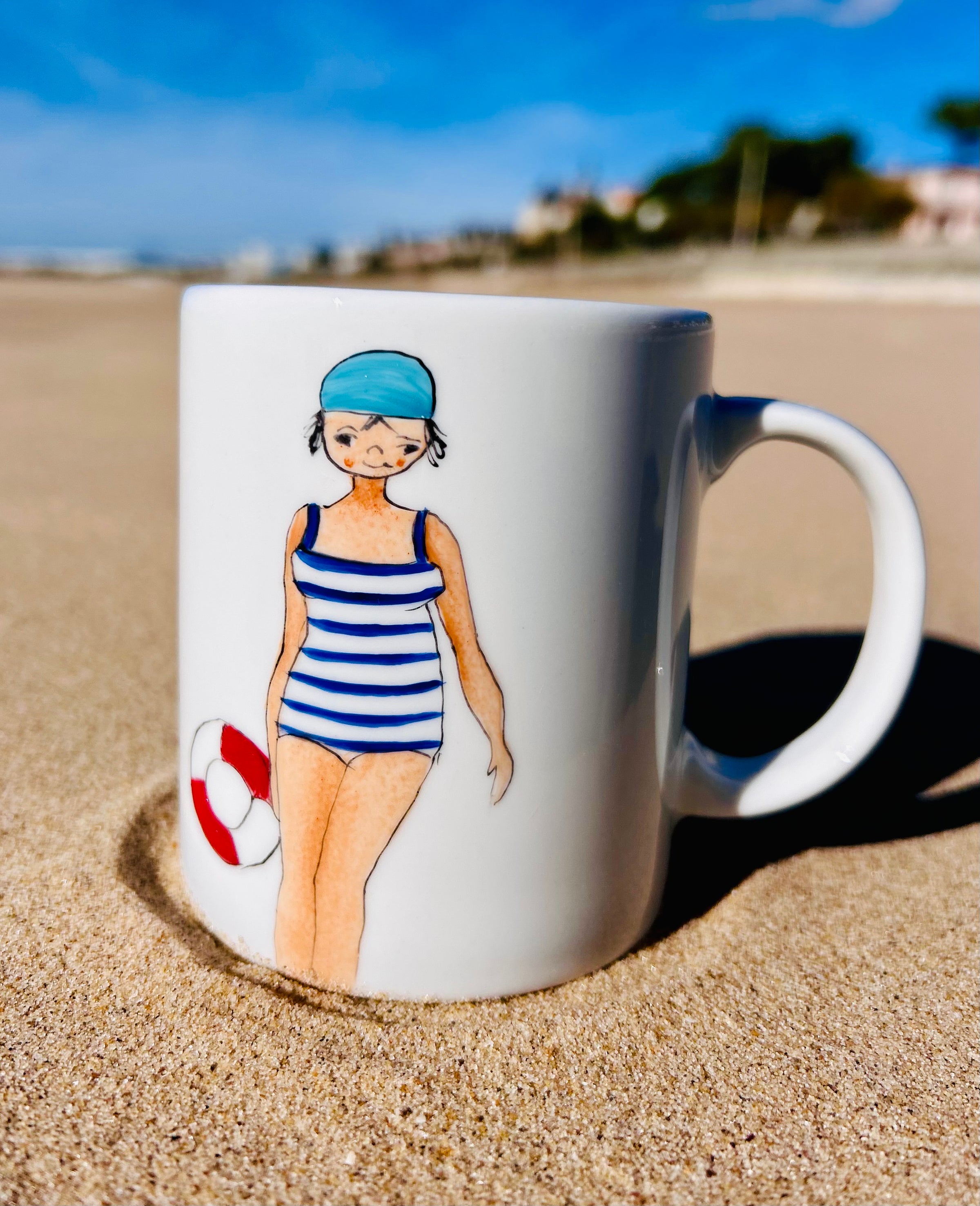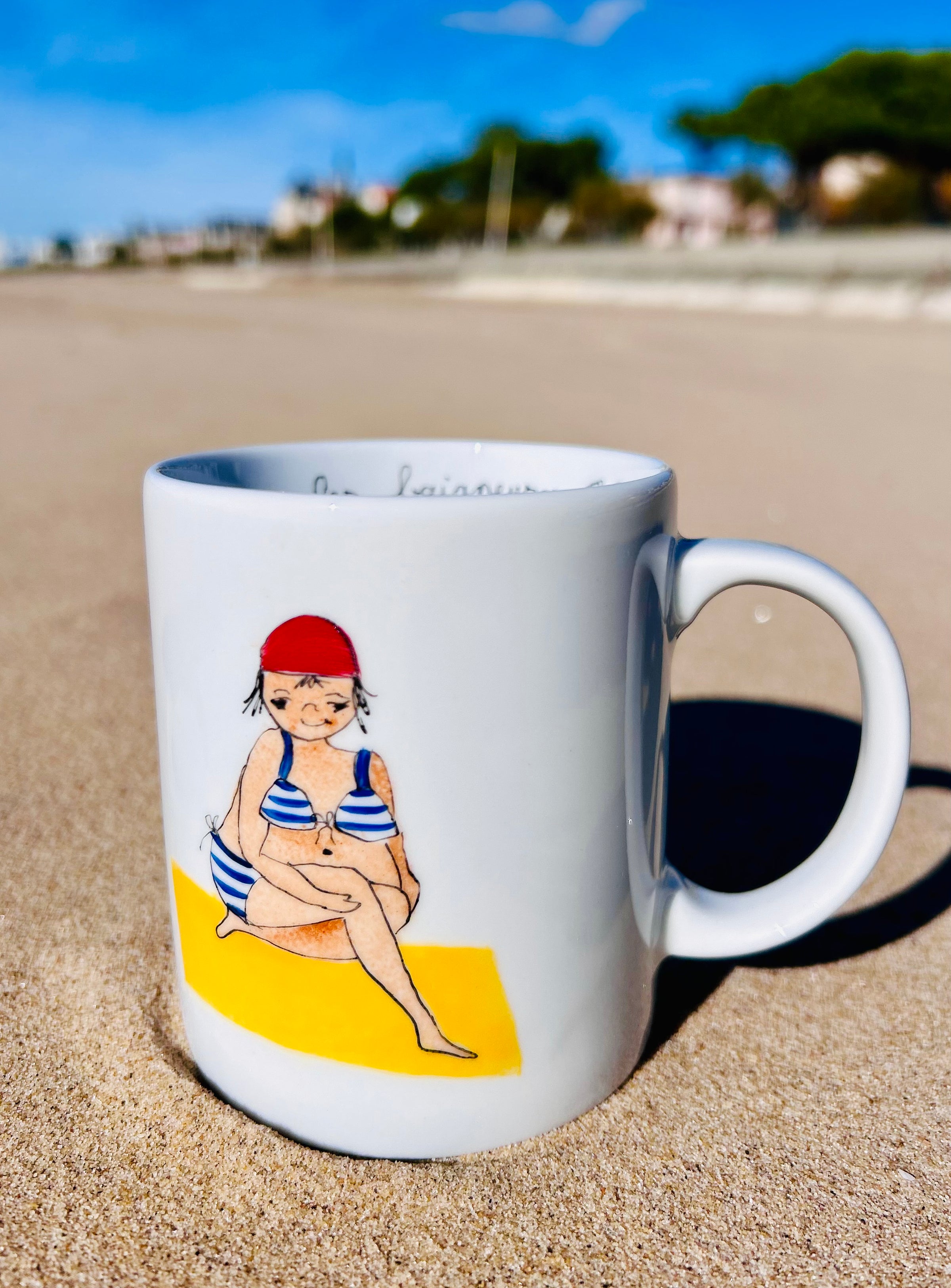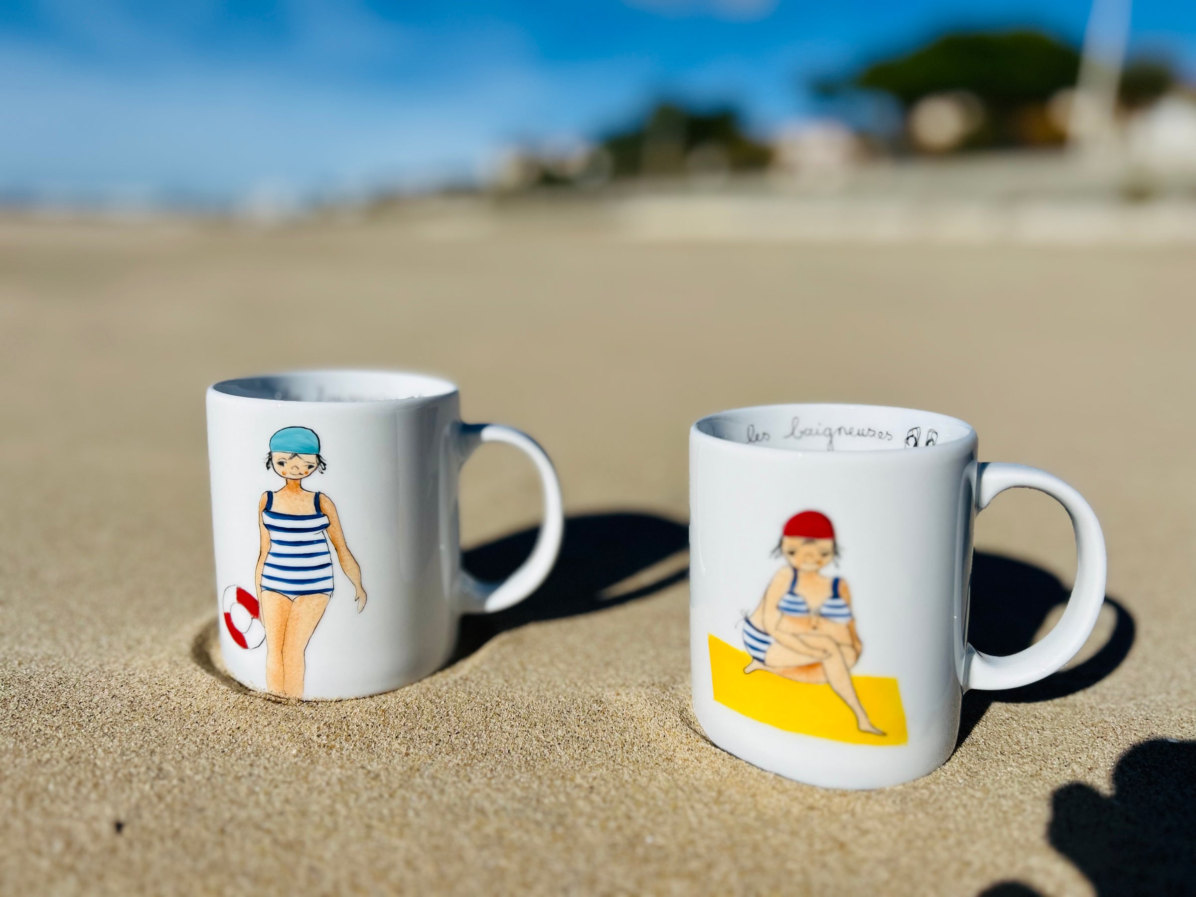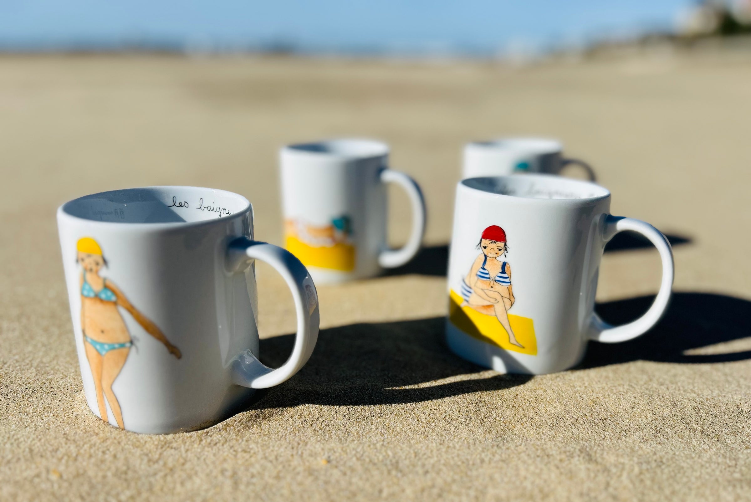 Ces mugs en porcelaine artisanale célèbrent l’élégance intemporelle des années balnéaires : maillots rayés, bonnets de bain colorés et sourires d’été. Chaque modèle capture un instant de légèreté, une scène de plage empreinte de nostalgie et de douceur.