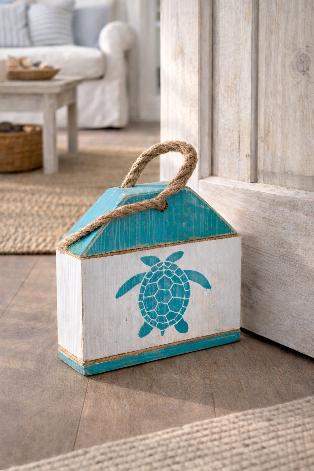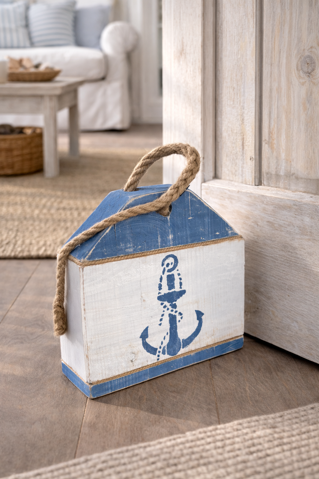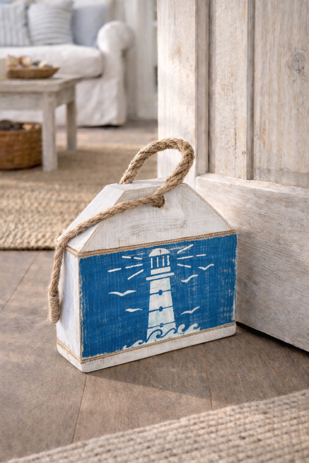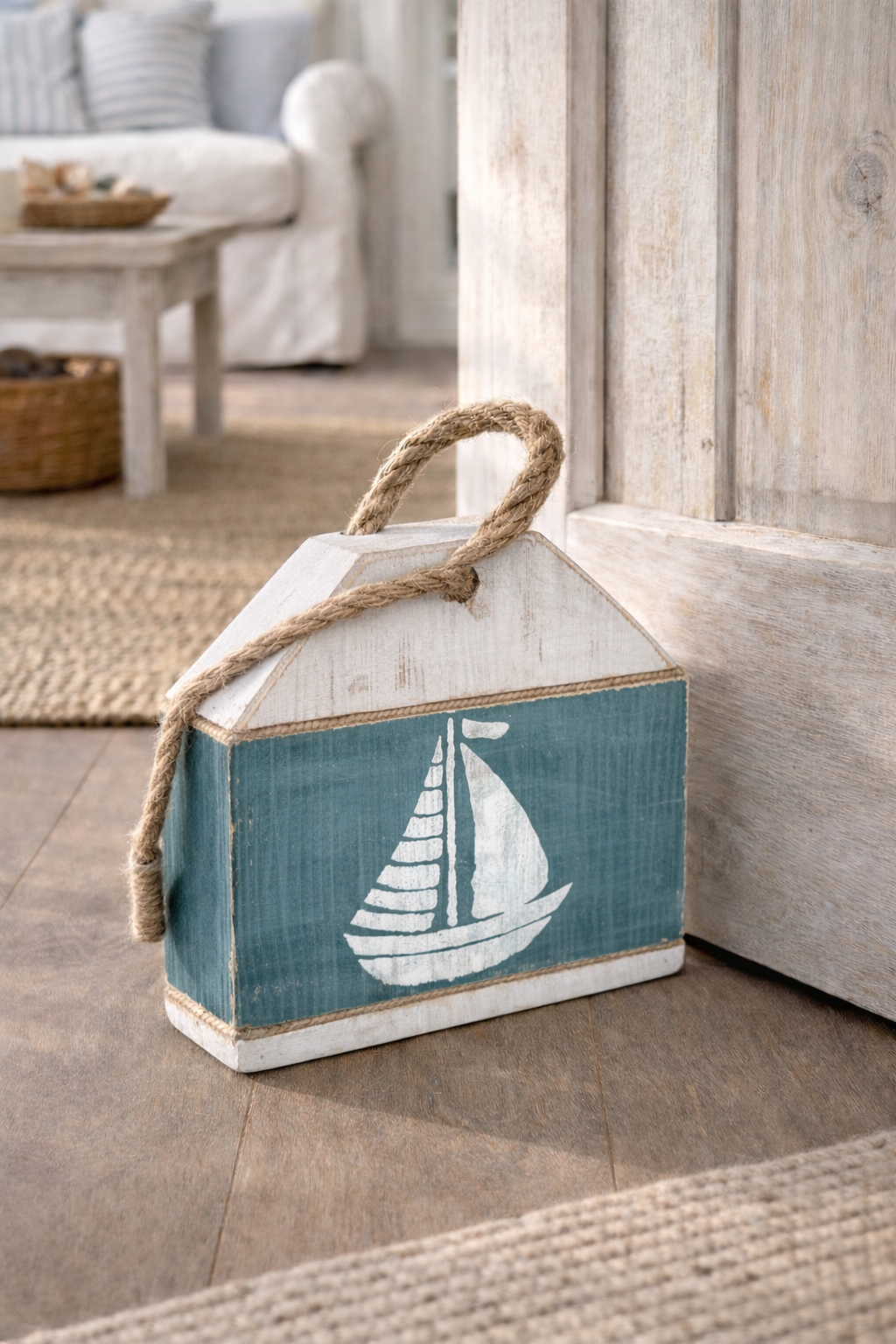 Réalisés en bois et décorés de cordage, ces cale-portes s’inspirent de l’univers nautique : voilier, ancre, phare, tortue… Chaque modèle est peint et patiné avec soin pour un rendu unique, au style “maison de vacances” et esprit littoral.