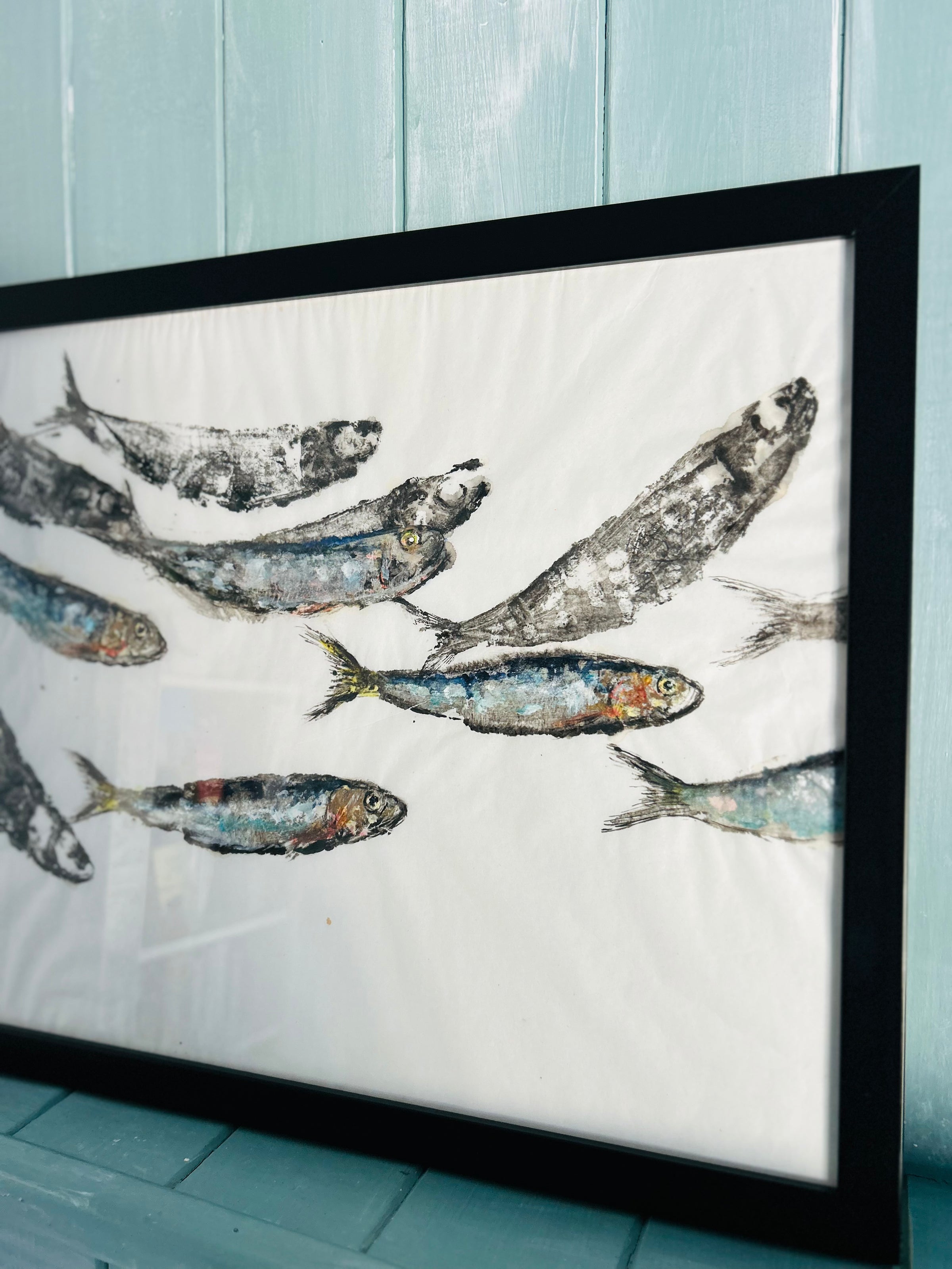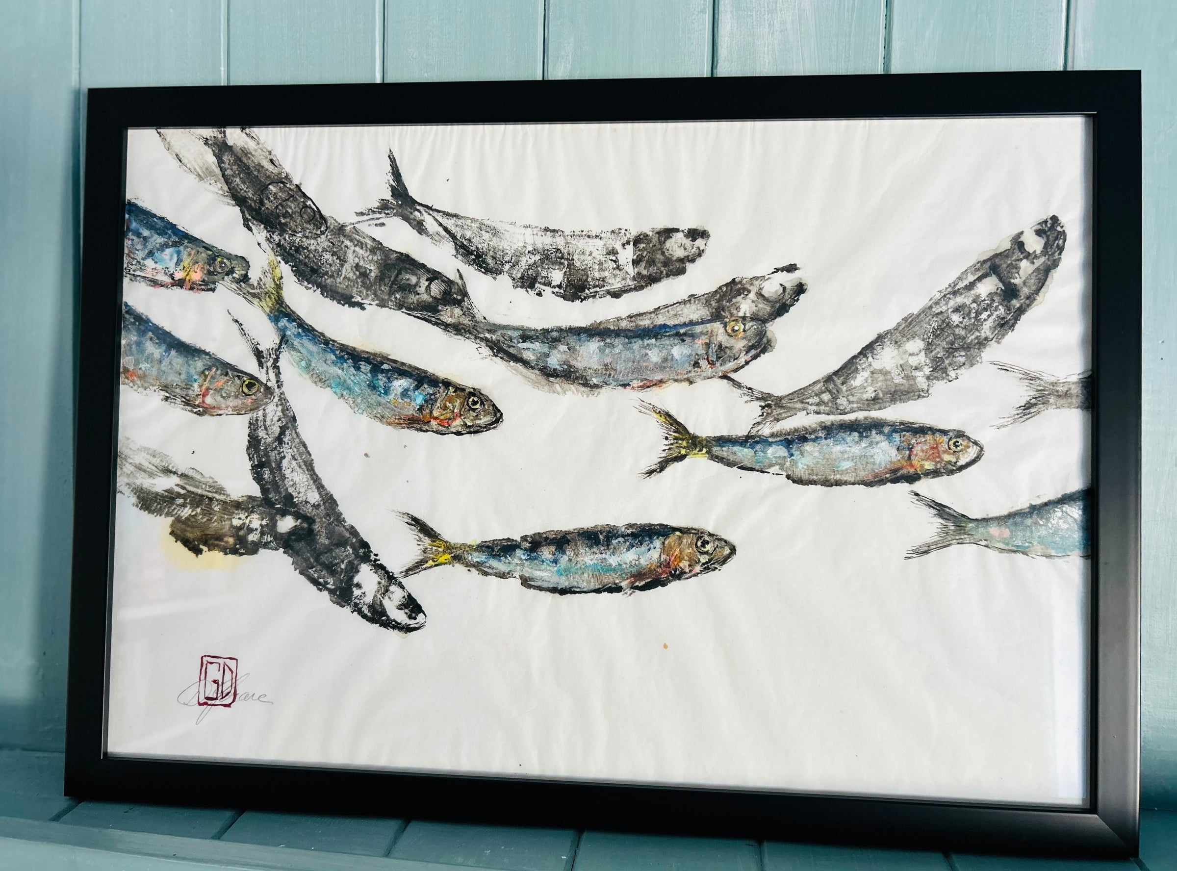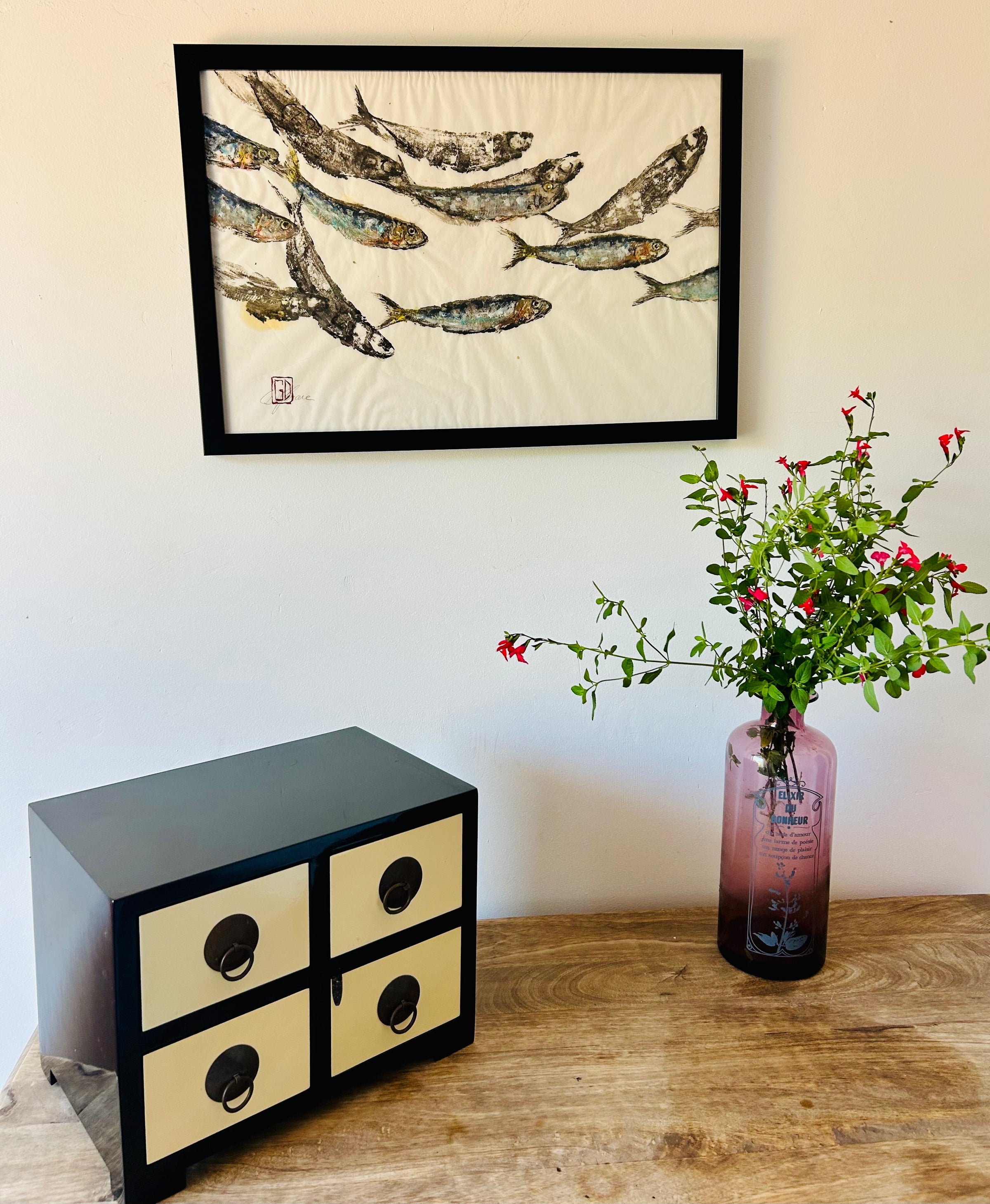 Banc de sardines réalisé selon la technique du Gyotaku, signée Didier Grare