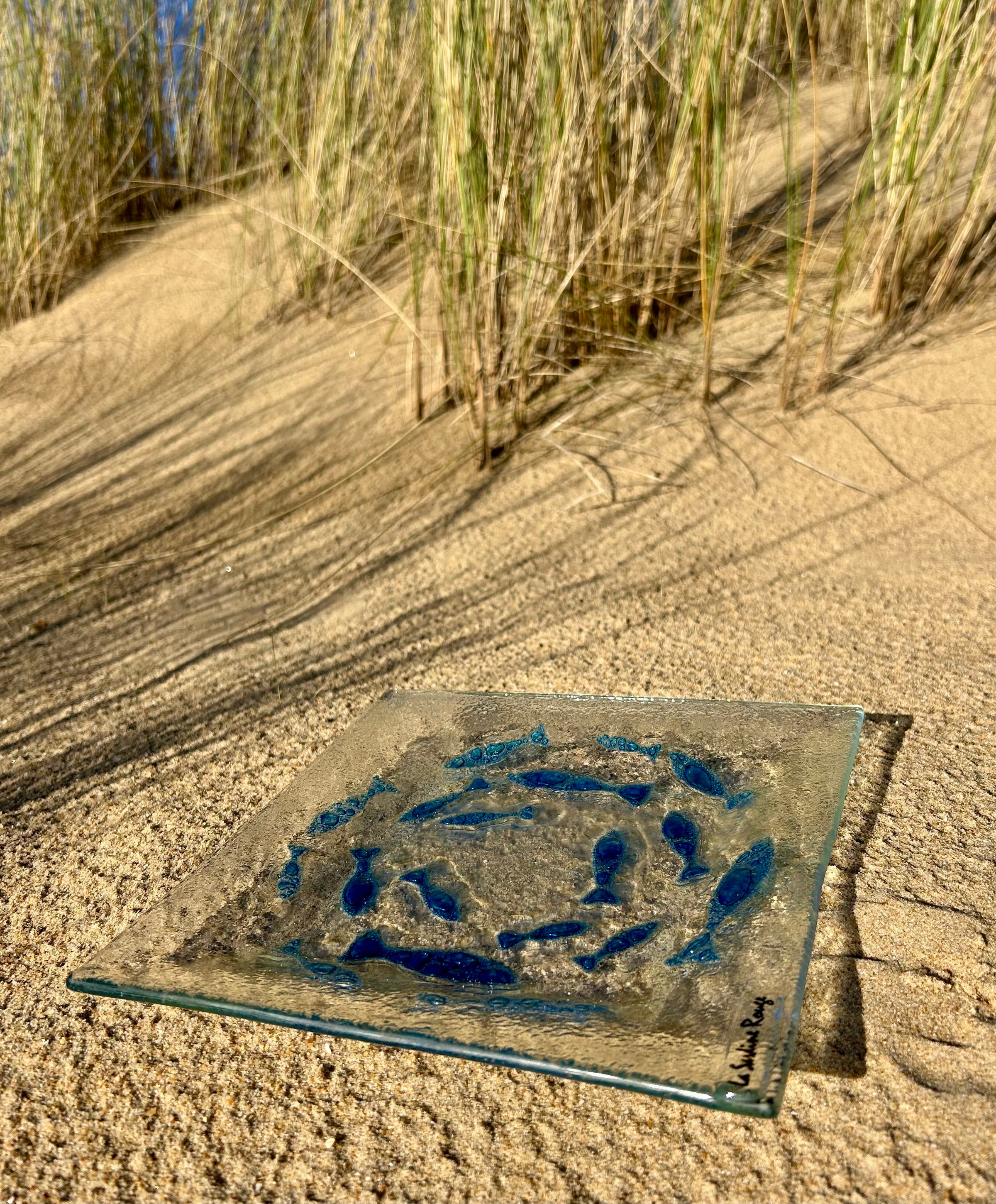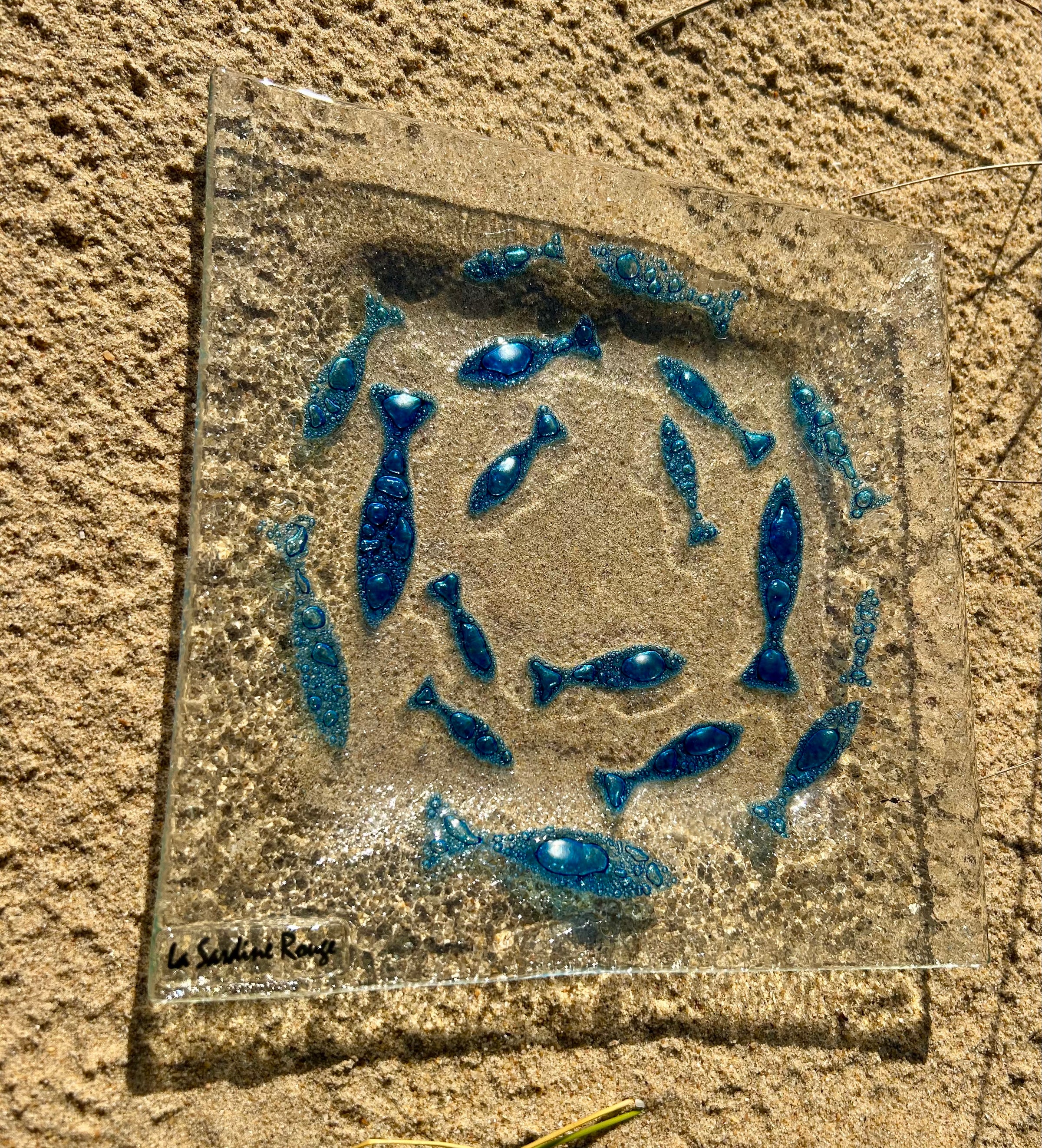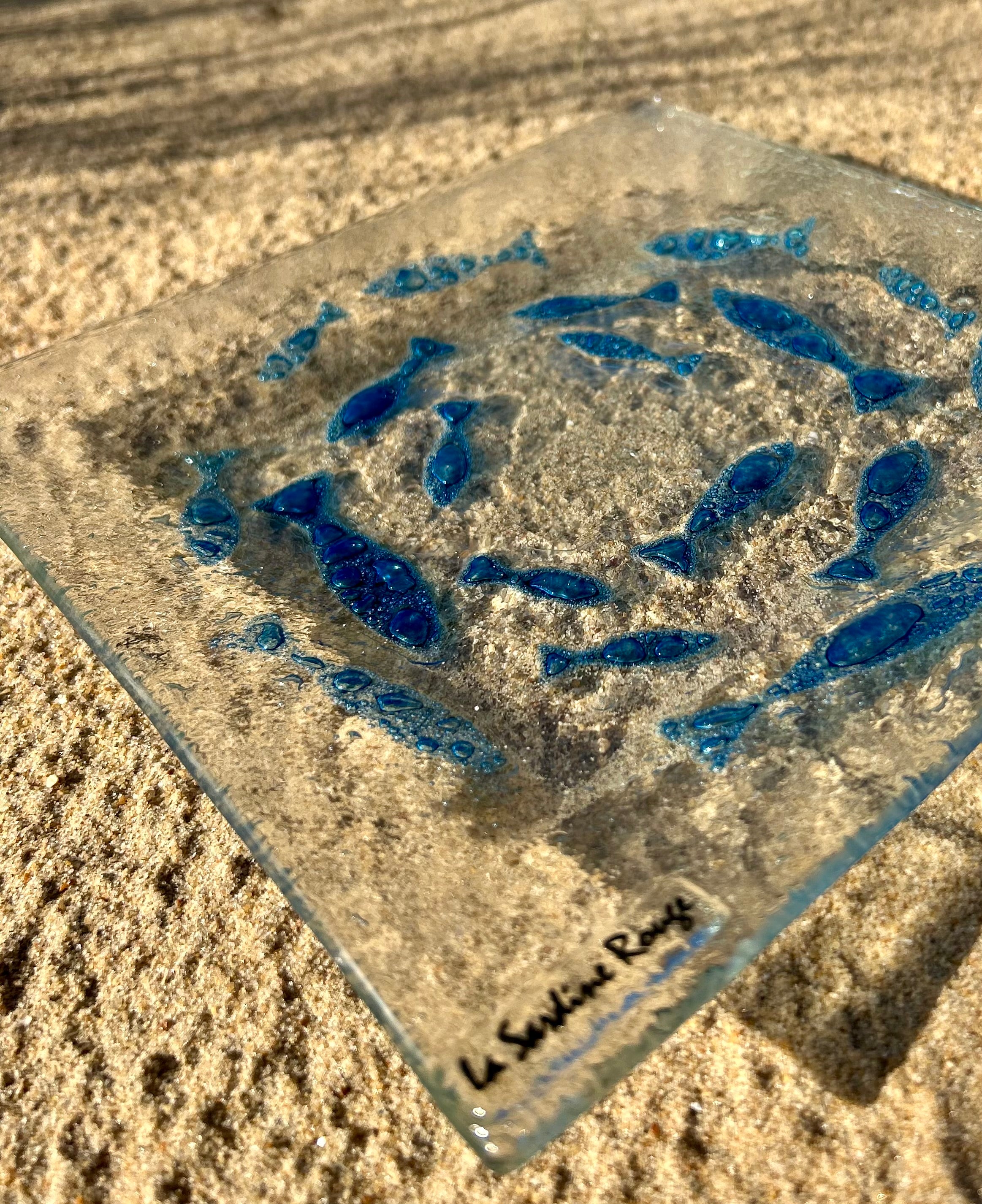 Découvrez cette assiette carrée en verre de fusion, entièrement façonnée et décorée à la main dans l’atelier La Sardine Rouge. Sa surface translucide dévoile un magnifique banc de poissons turquoise en relief, disposés en cercle comme s’ils tournaient doucement dans un courant marin. La lumière traverse le verre et illumine les silhouettes des poissons, créant un effet spectaculaire et vivant.