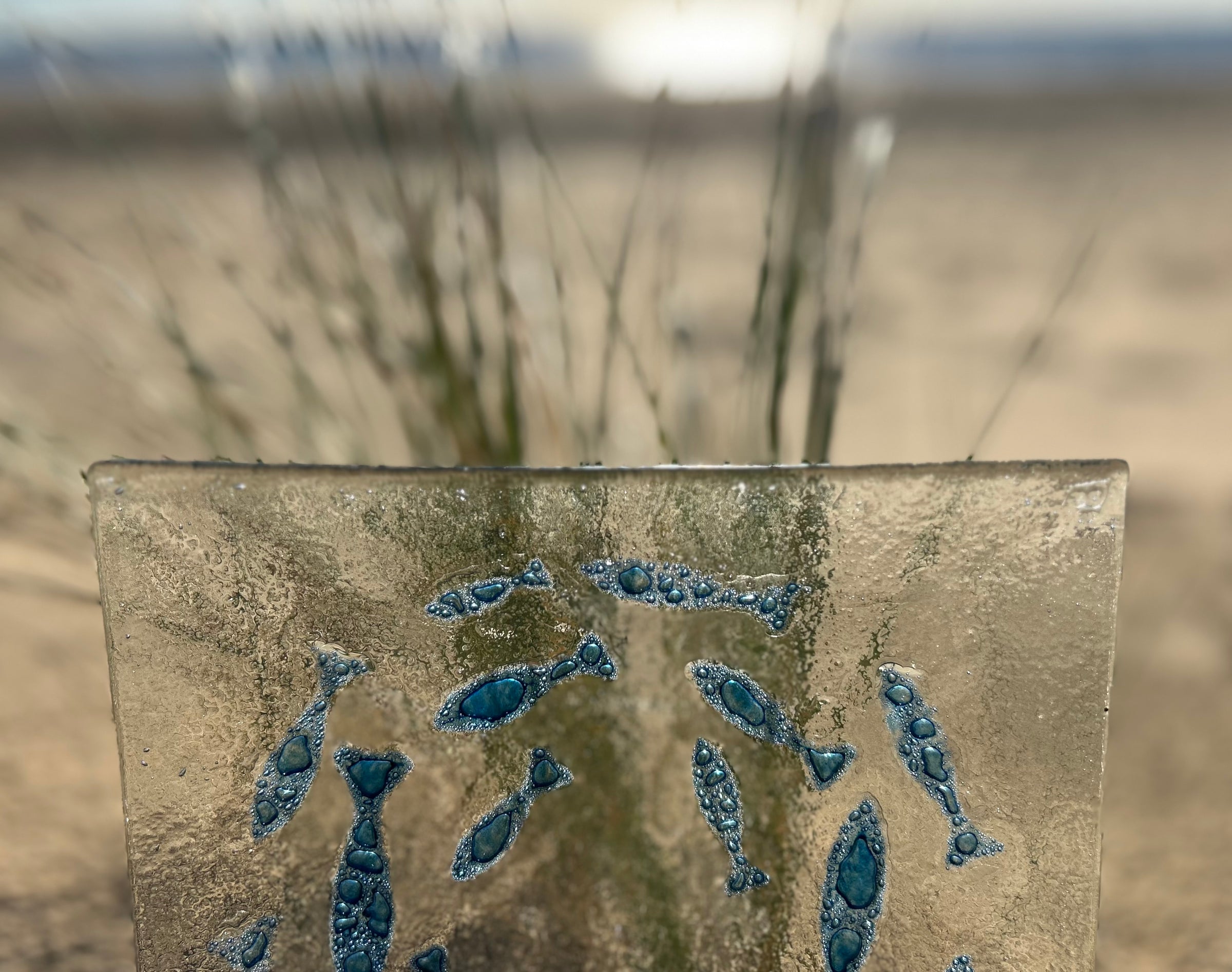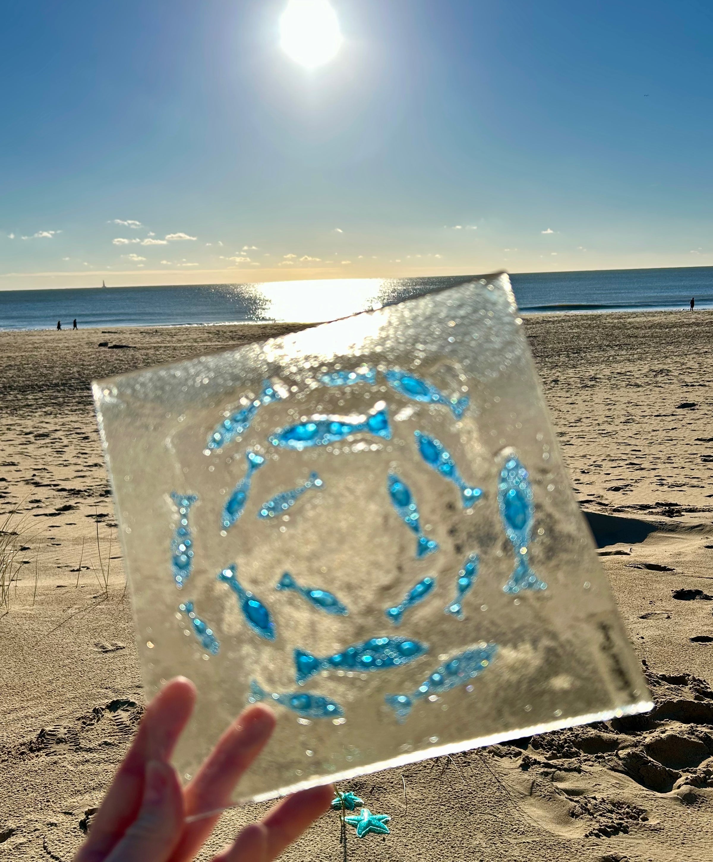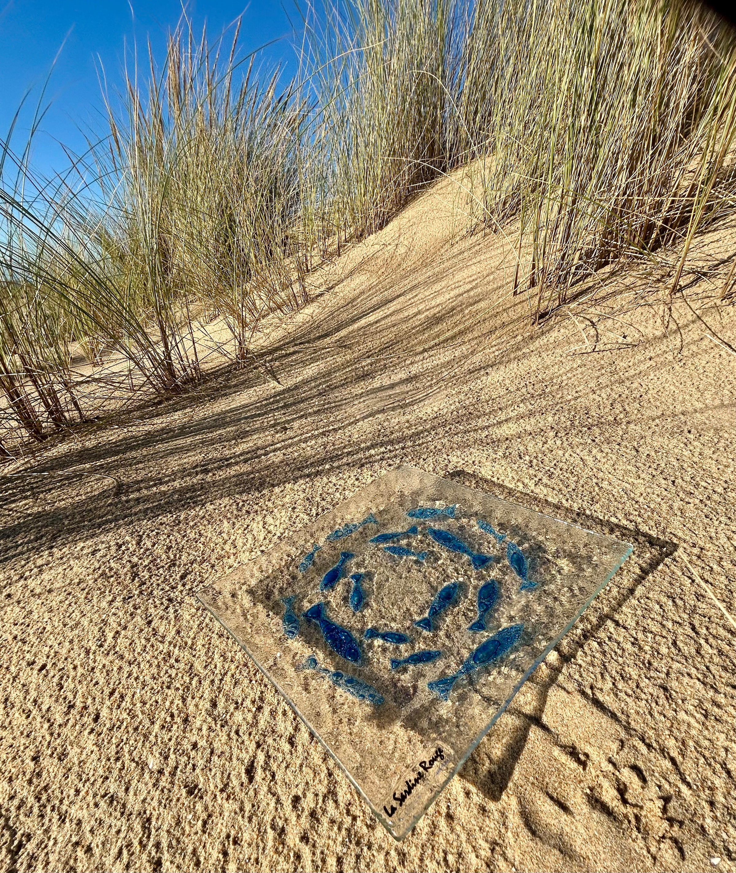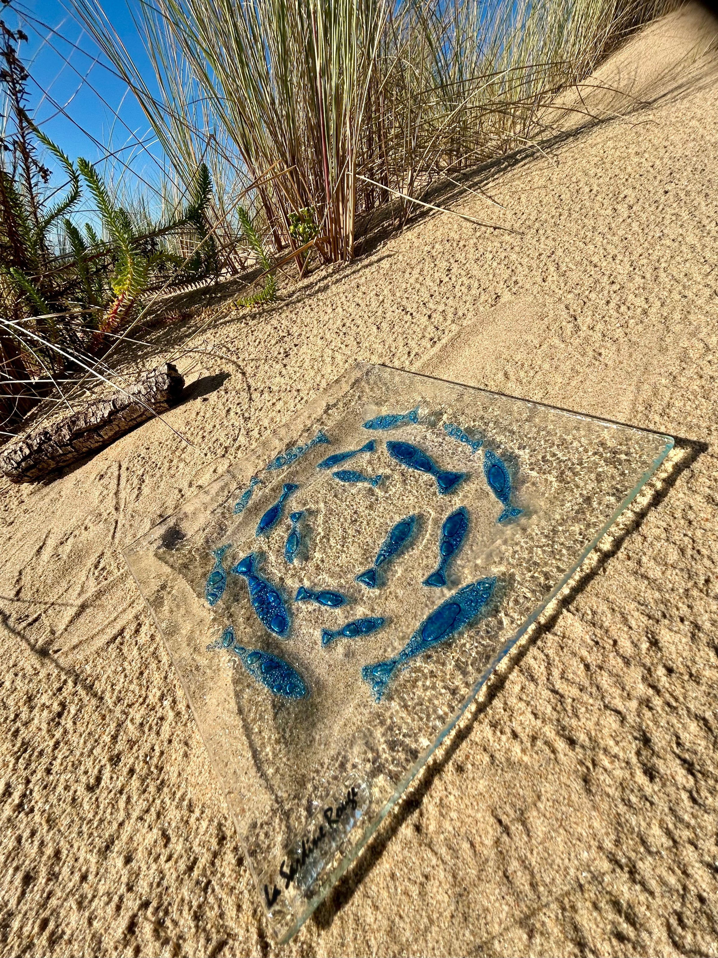 Découvrez cette assiette carrée en verre de fusion, entièrement façonnée et décorée à la main dans l’atelier La Sardine Rouge. Sa surface translucide dévoile un magnifique banc de poissons turquoise en relief, disposés en cercle comme s’ils tournaient doucement dans un courant marin. La lumière traverse le verre et illumine les silhouettes des poissons, créant un effet spectaculaire et vivant.