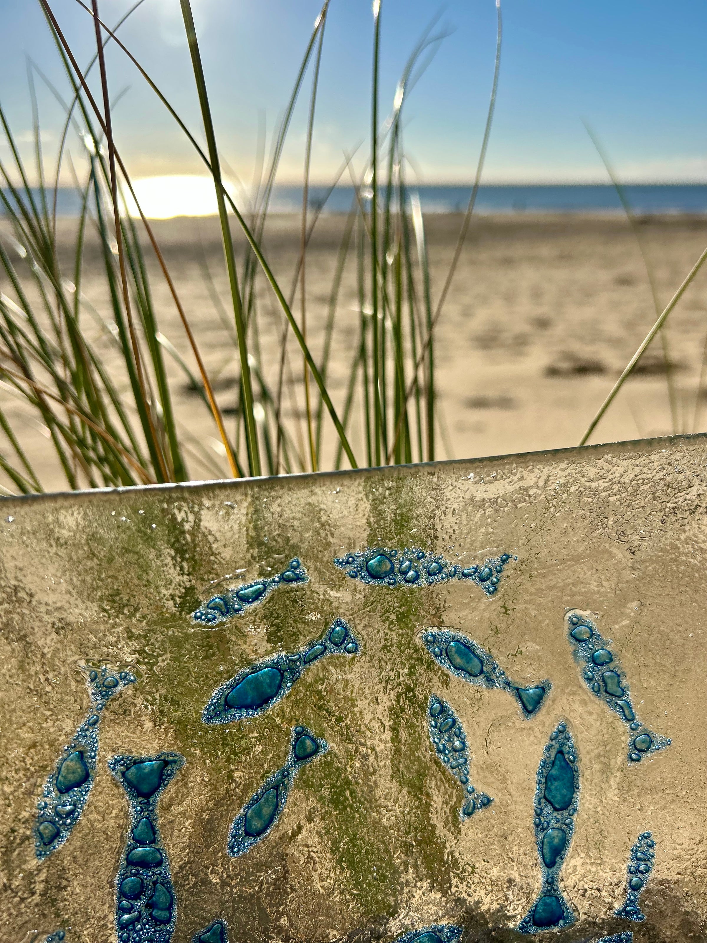 Chaque pièce offre de subtiles variations de texture, de bulles et de transparence, rendant l’assiette aussi décorative qu’unique. Par son esthétique marine et contemporaine, elle peut être utilisée comme porte savon, vide-poches artistique, plateau décoratif ou simplement exposée pour mettre en valeur son jeu de lumière naturel.
