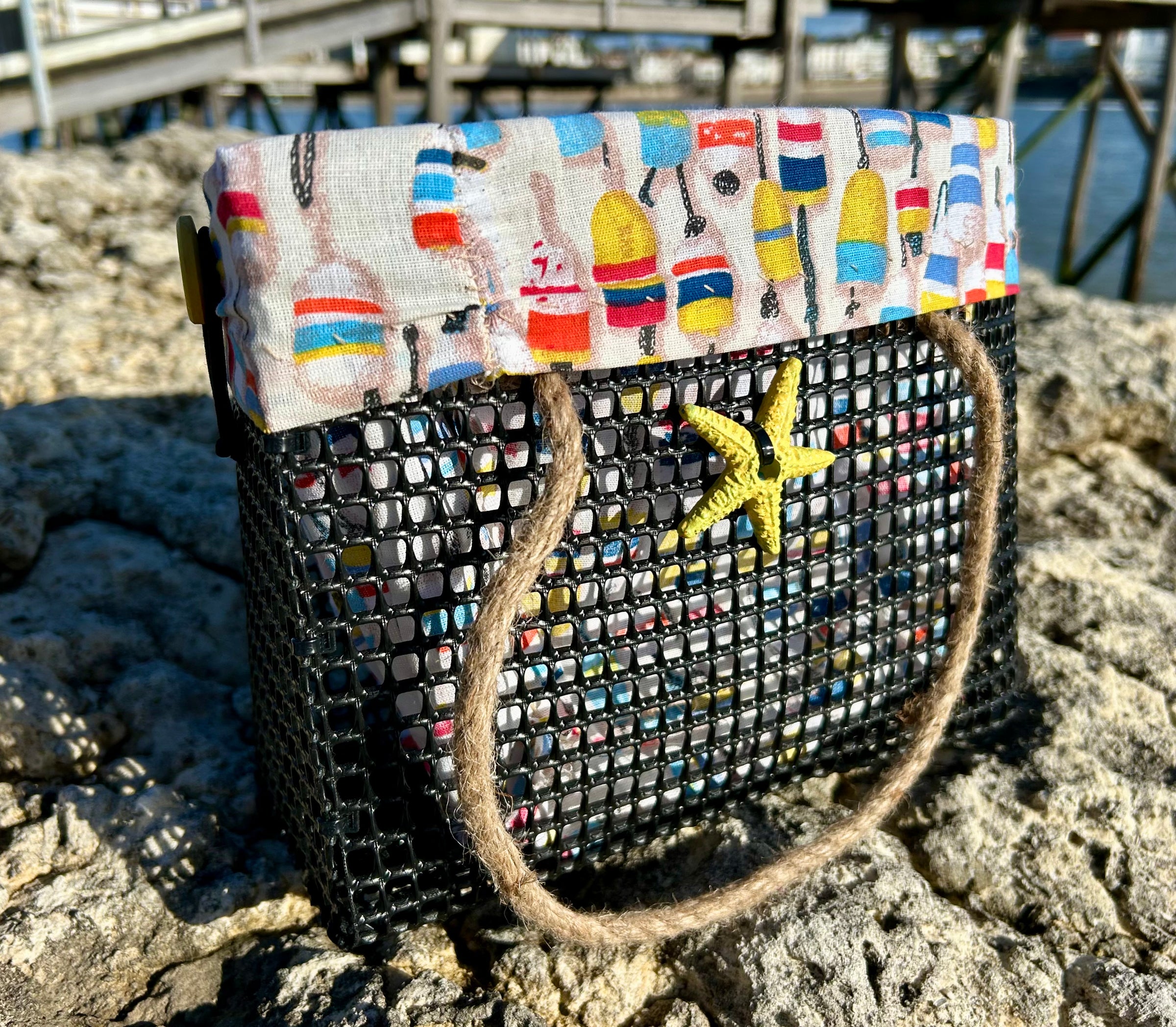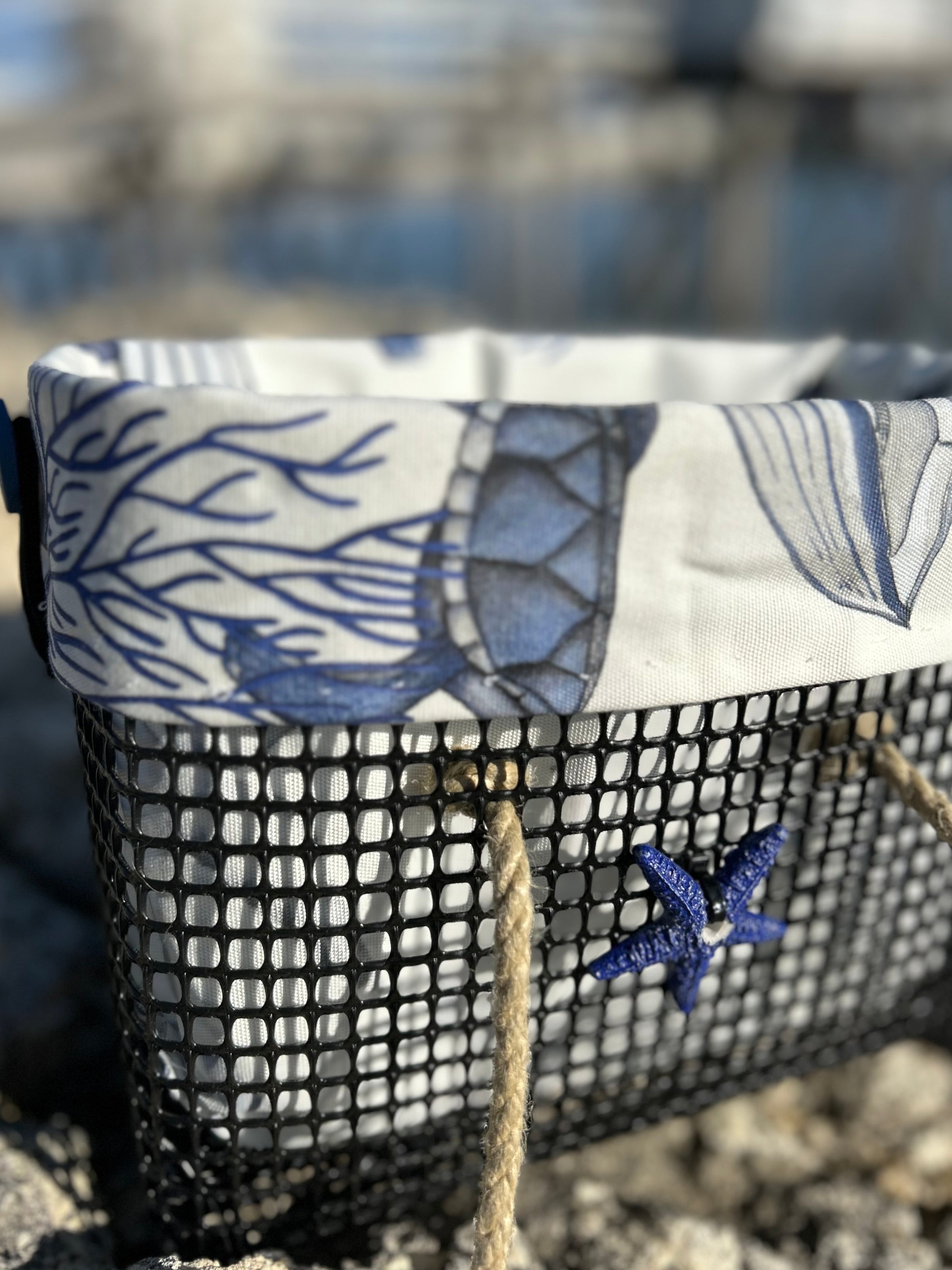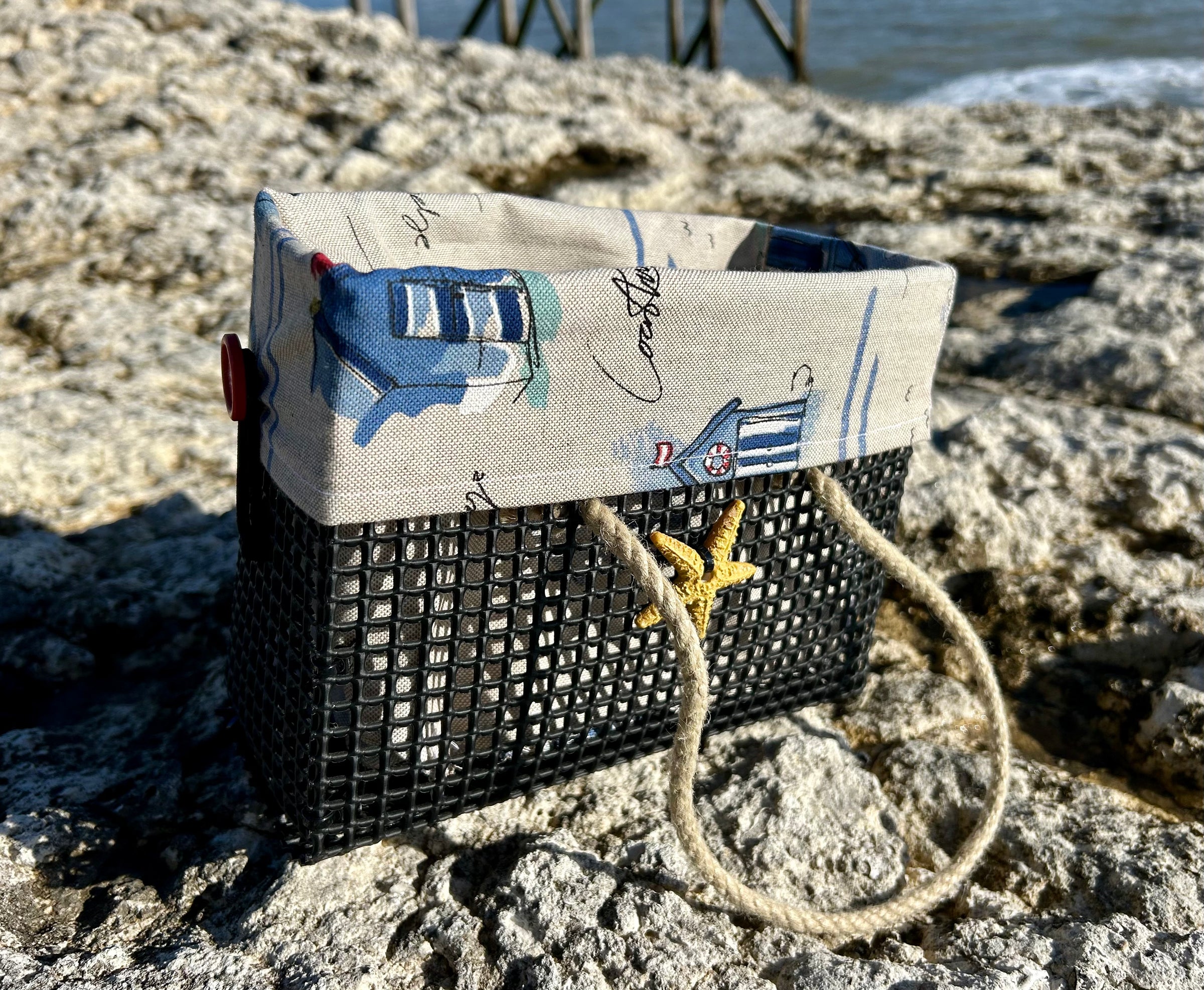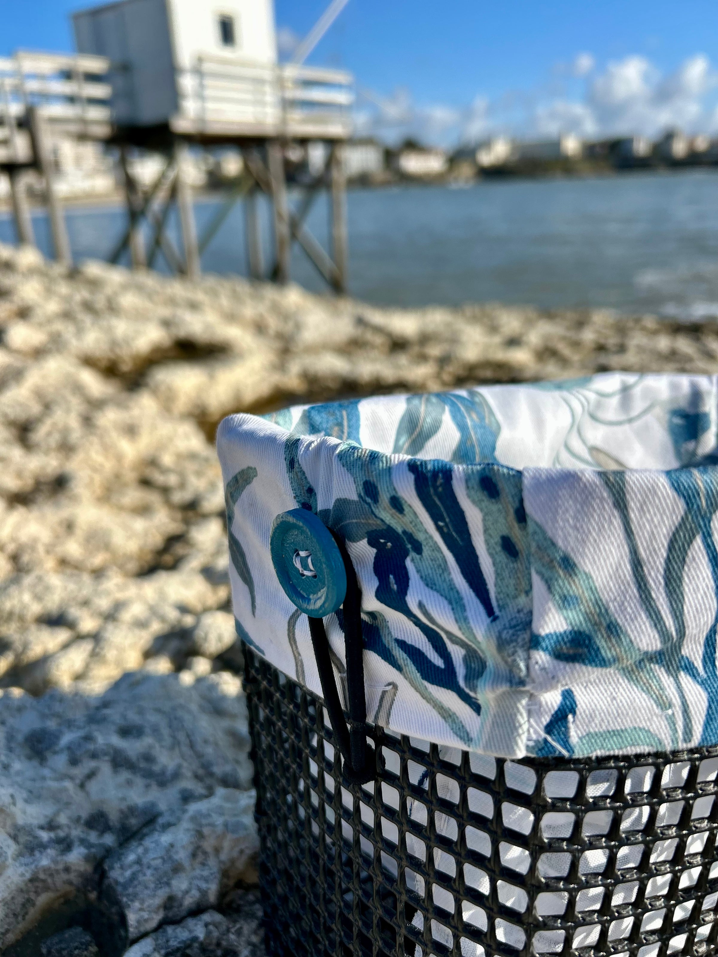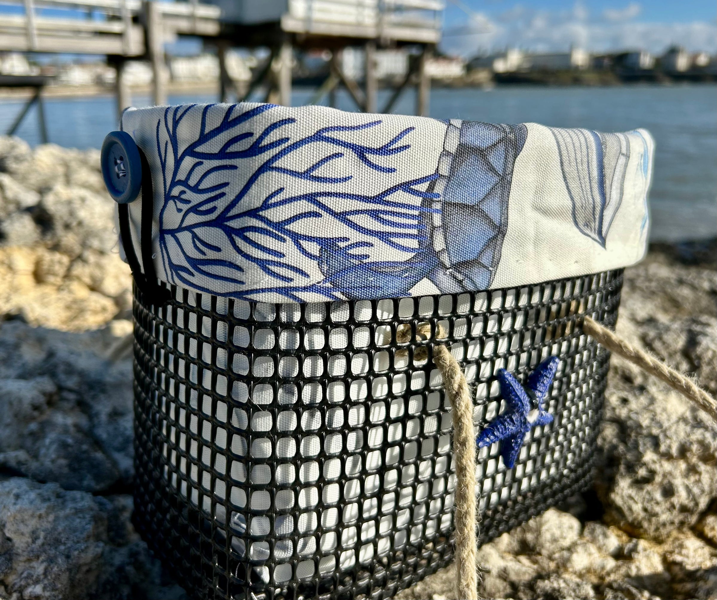 Ce petit panier est réalisé à la main à partir de poche ostréicole, et délicatement habillé d’un tissu coloré à rayures ou motifs marins. Le bouton décoratif n’est pas qu’un détail esthétique : il sert également à maintenir le tissu parfaitement en place.