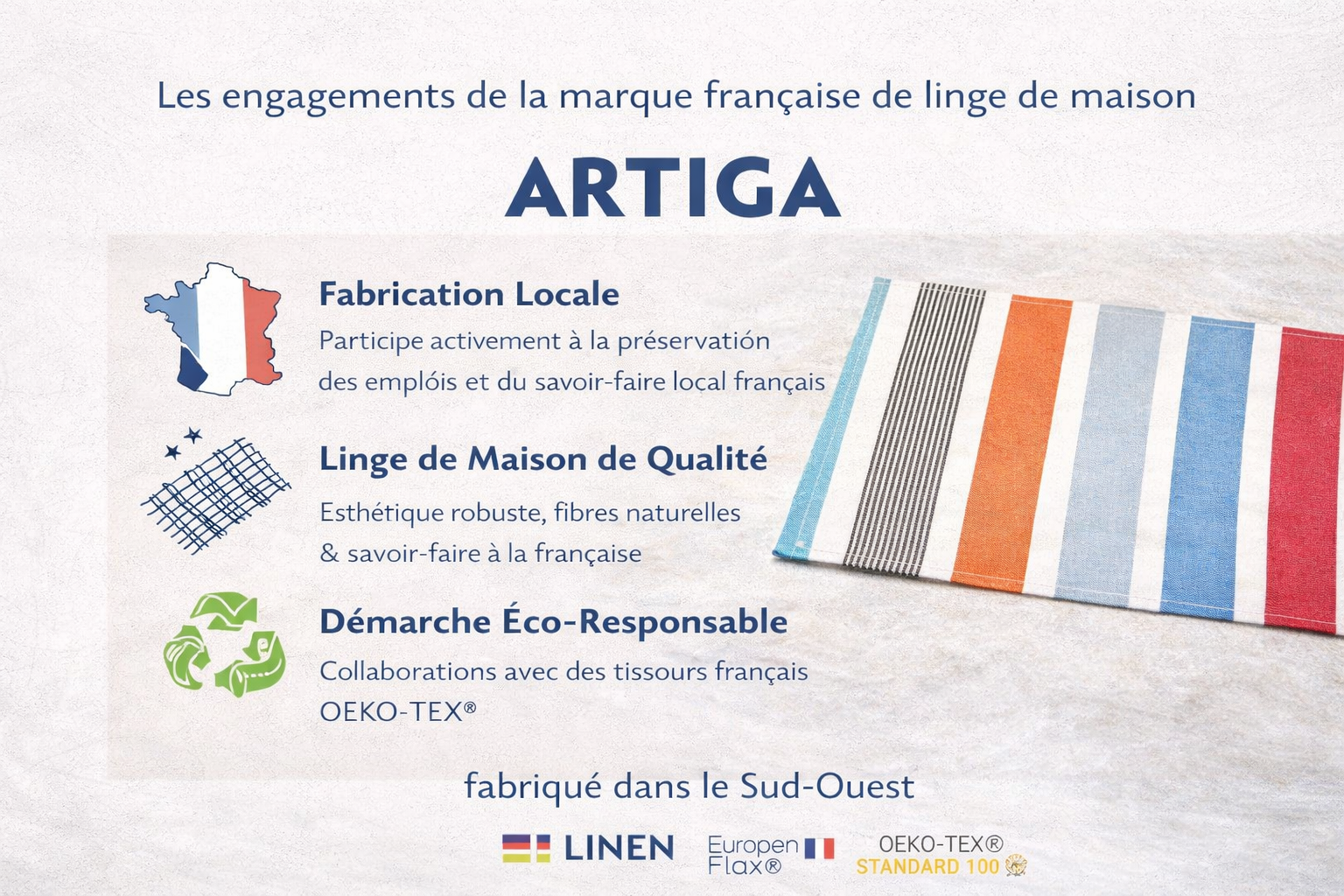 - Un linge de maison de qualité, autant par son esthétique que par sa robustesse. C’est pourquoi, la marque privilégie des fibres textiles résistantes comme le coton issu de l’agriculture biologique, le lin certifié European Flax* et bientôt le chanvre. Un linge de maison de qualité, c’est aussi un vrai savoir-faire et une fabrication artisanale contrôlée.