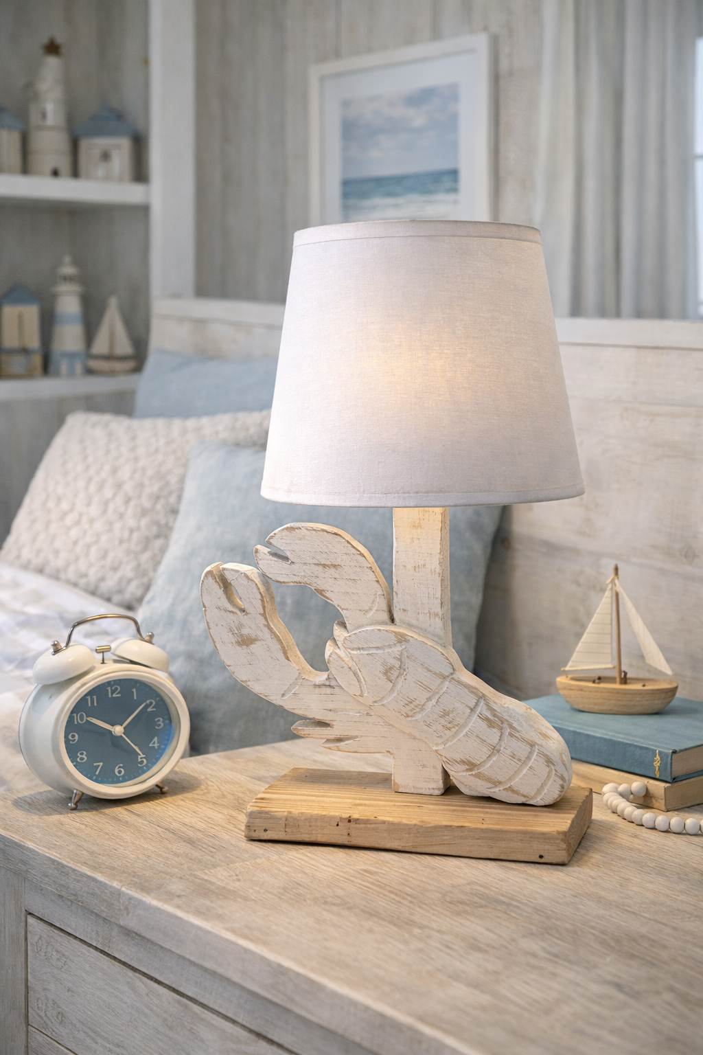 Réalisée en bois et entièrement façonnée à la main, cette lampe décorative devient un véritable objet de décoration. Son motif écrevisse, à la fois ludique et élégant, s’intègre parfaitement dans une chambre au style bord de mer, naturel ou bohème.