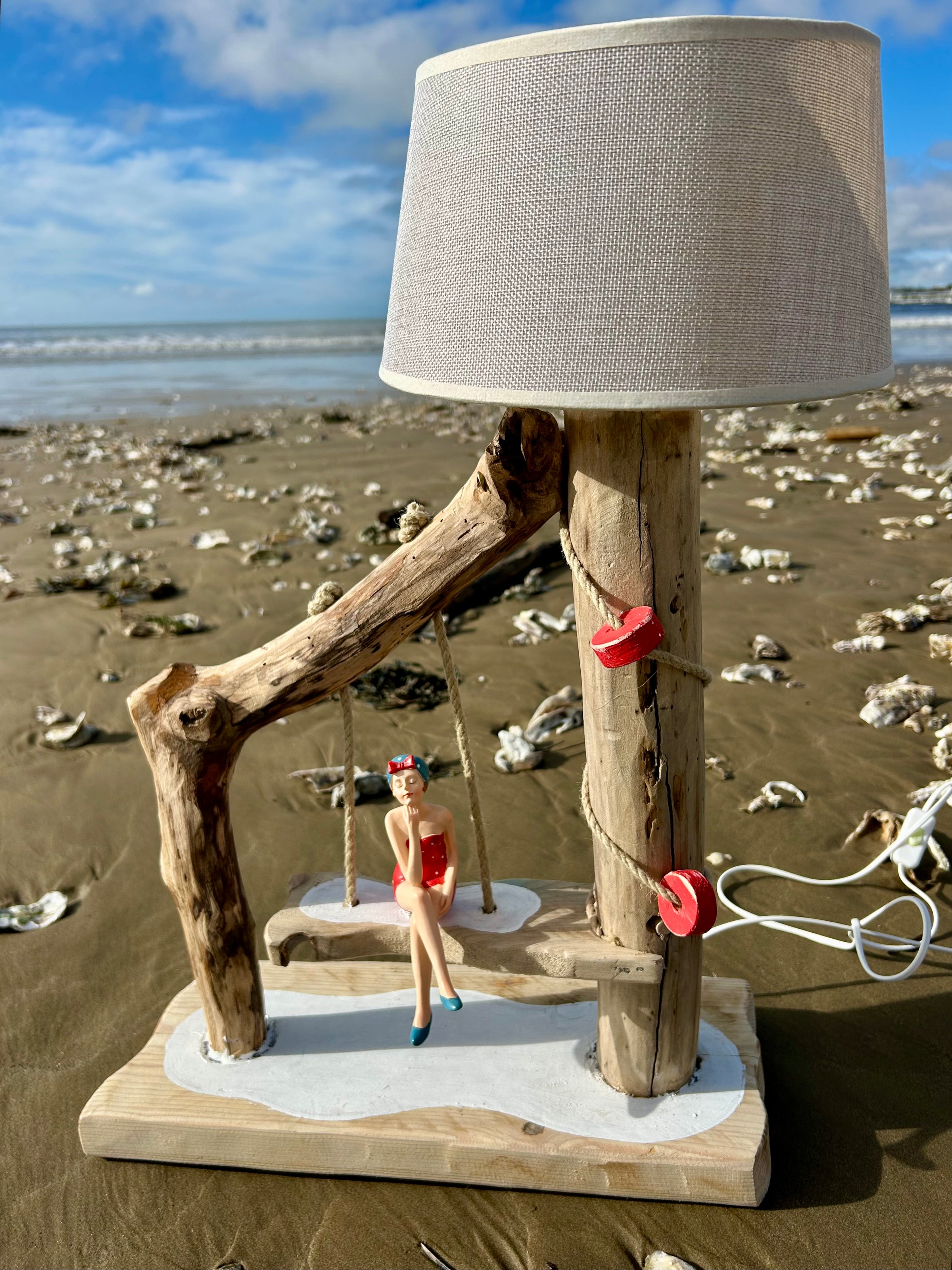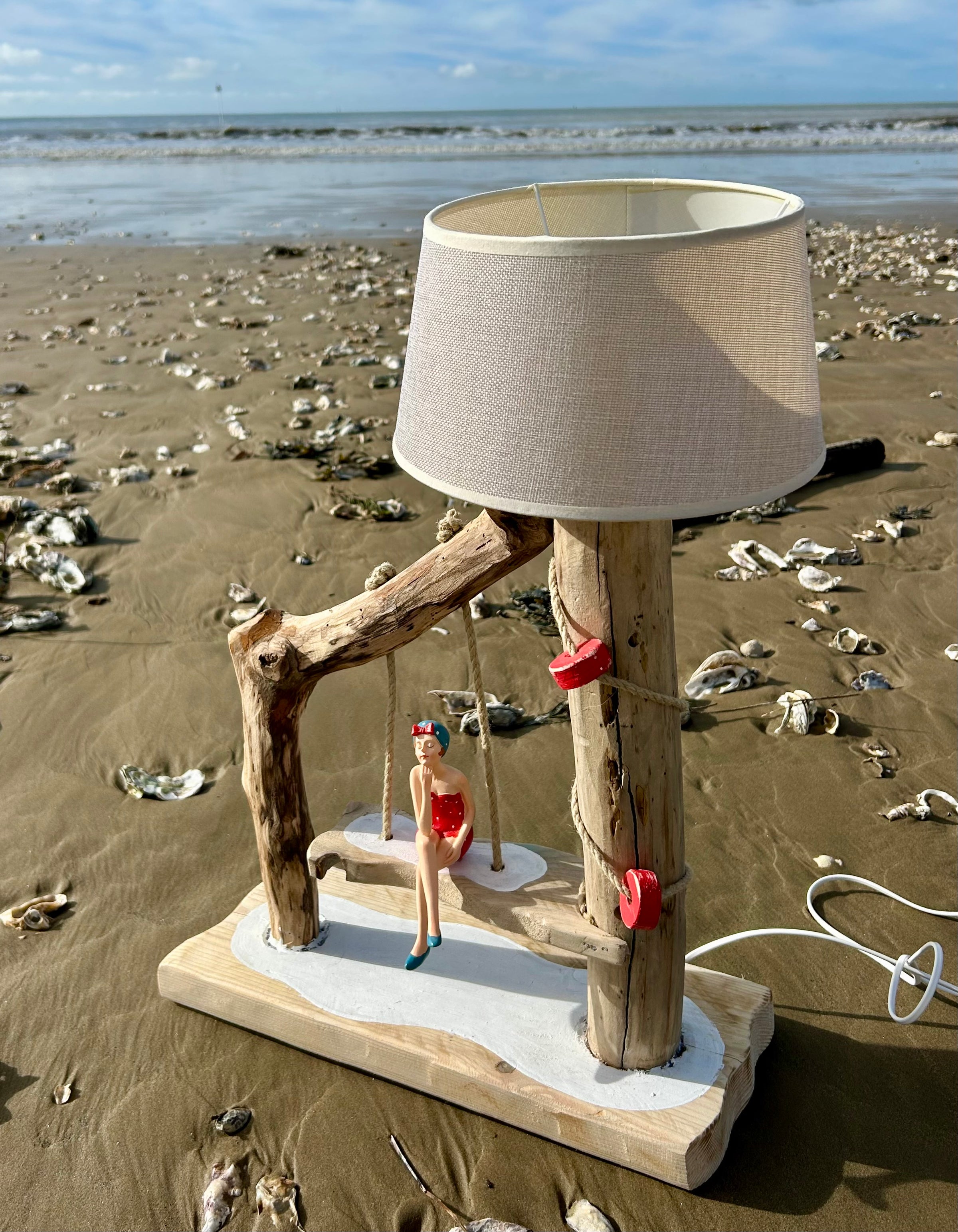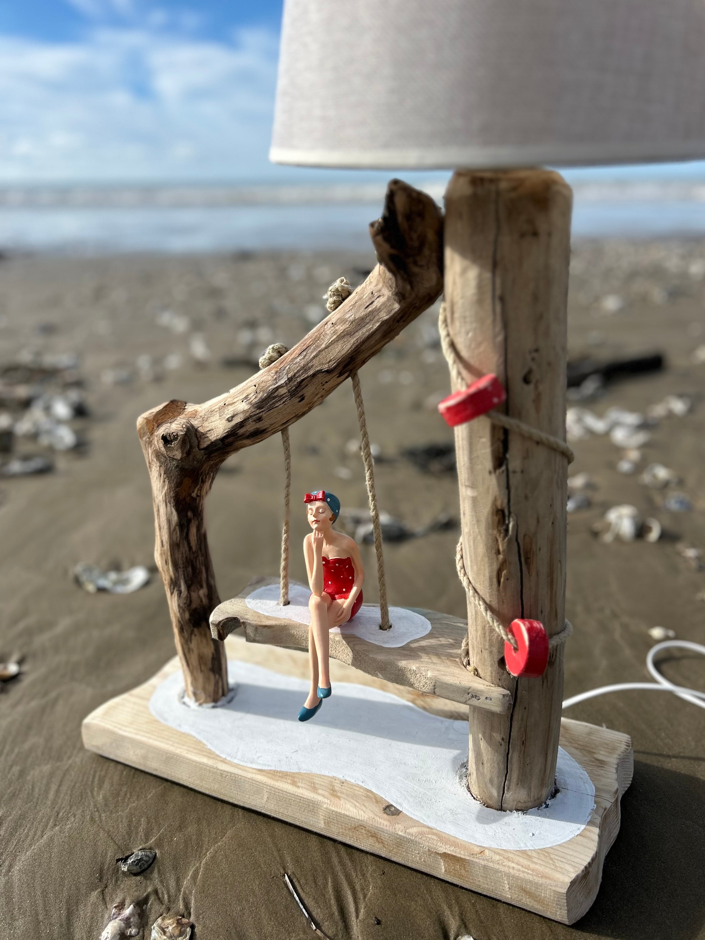 Son abat-jour en tissu clair diffuse une lumière douce et chaleureuse, parfaite pour créer une ambiance cosy dans un salon, une chambre ou une maison de bord de mer. Mais le détail qui fait toute la différence, c’est sa figurine de baigneuse vintage en maillot rouge, délicatement installée sur une balançoire suspendue, comme un moment suspendu au rythme des vagues.