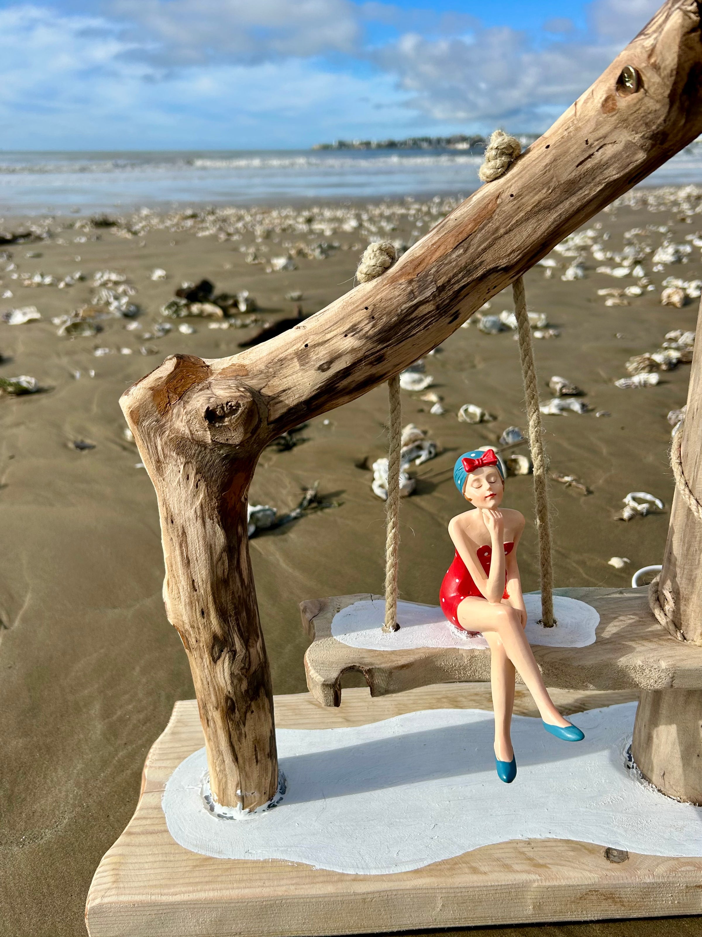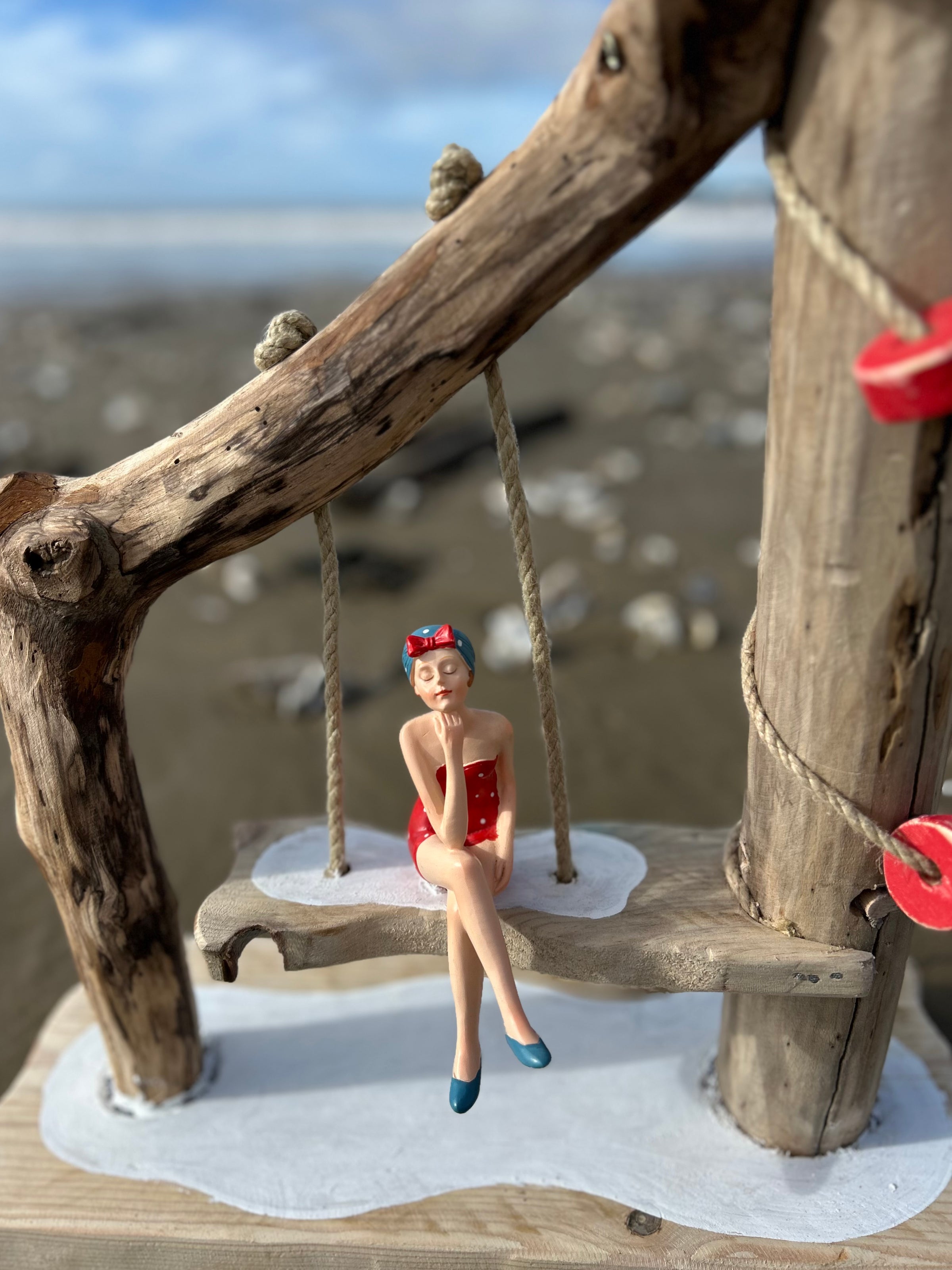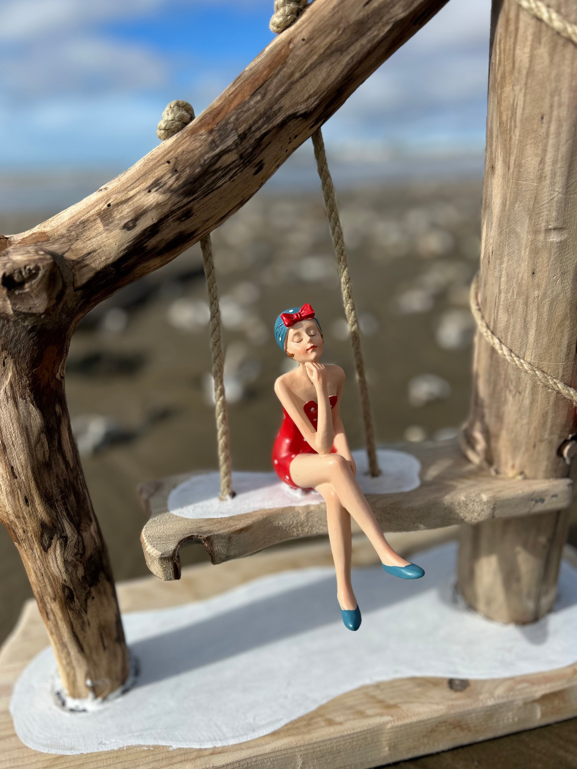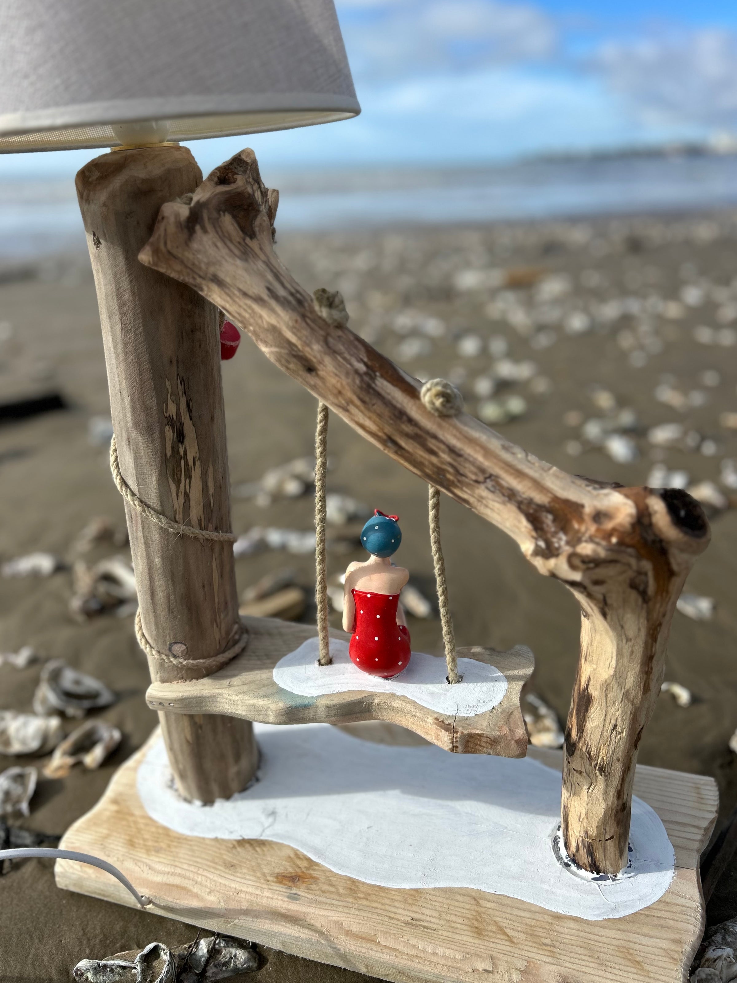 Son abat-jour en tissu clair diffuse une lumière douce et chaleureuse, parfaite pour créer une ambiance cosy dans un salon, une chambre ou une maison de bord de mer. Mais le détail qui fait toute la différence, c’est sa figurine de baigneuse vintage en maillot rouge, délicatement installée sur une balançoire suspendue, comme un moment suspendu au rythme des vagues.