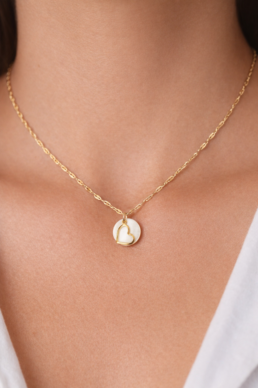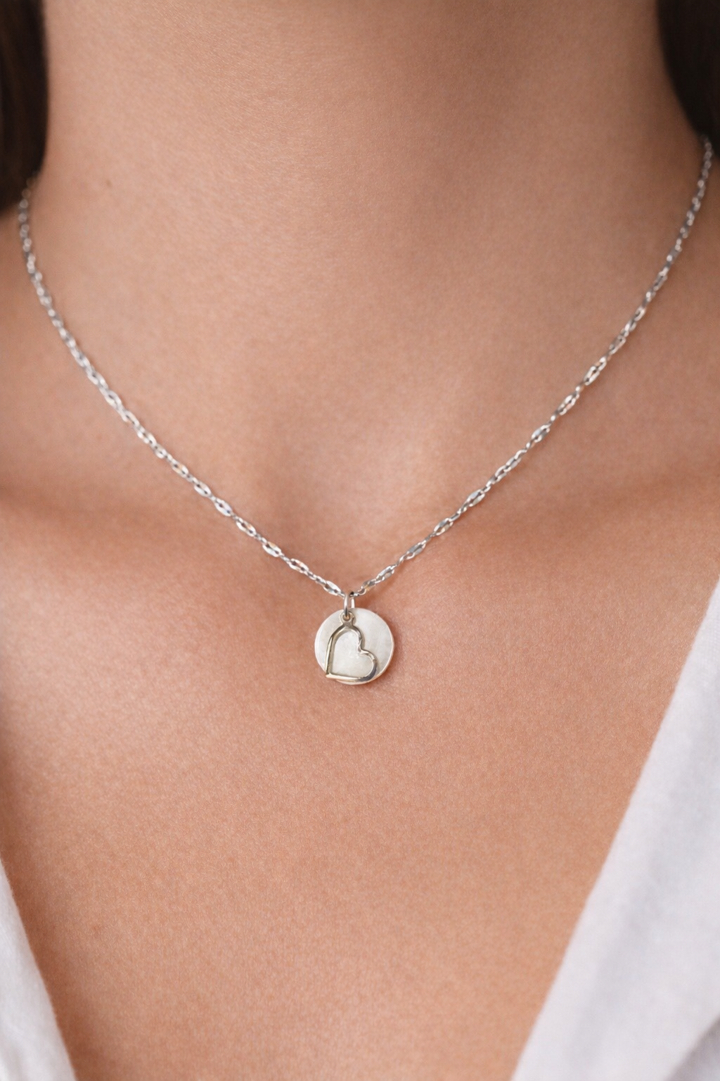 Délicat et lumineux, ce collier artisanal met en valeur une fine médaille ronde en nacre ornée d’un cœur ajouré. La nacre capte subtilement la lumière et révèle de doux reflets naturels, tandis que le cœur apporte une touche symbolique et élégante.