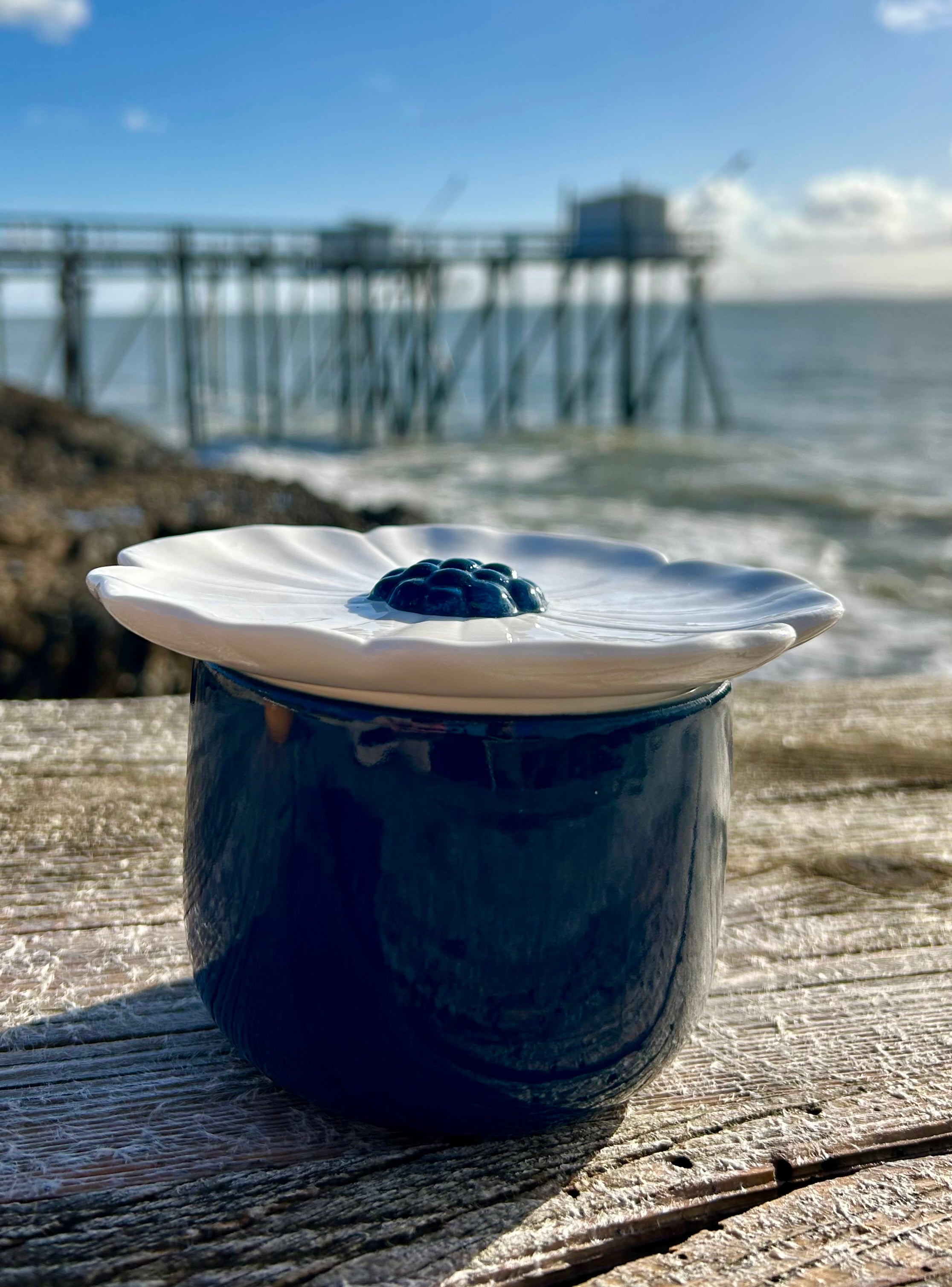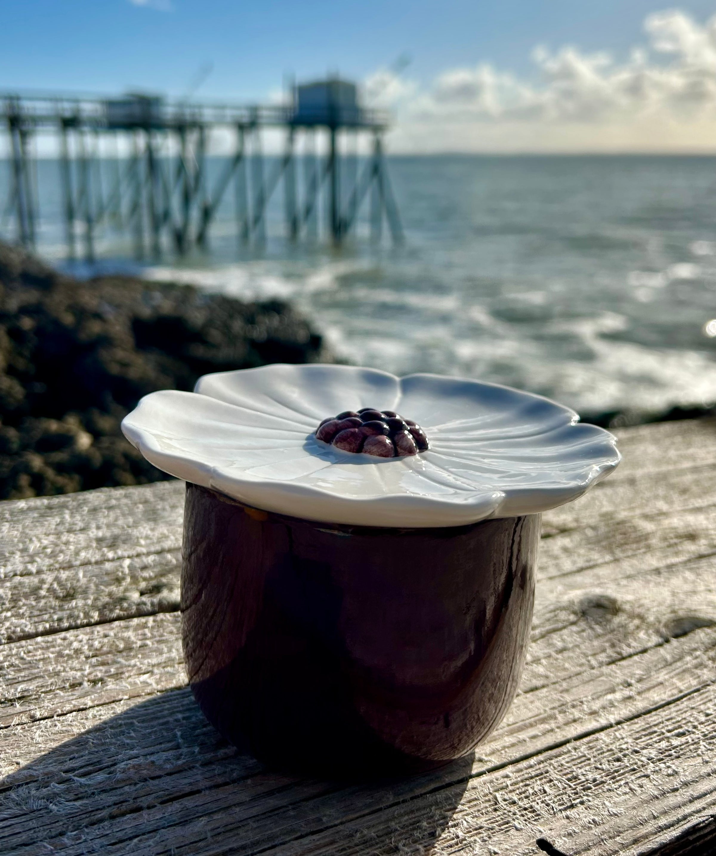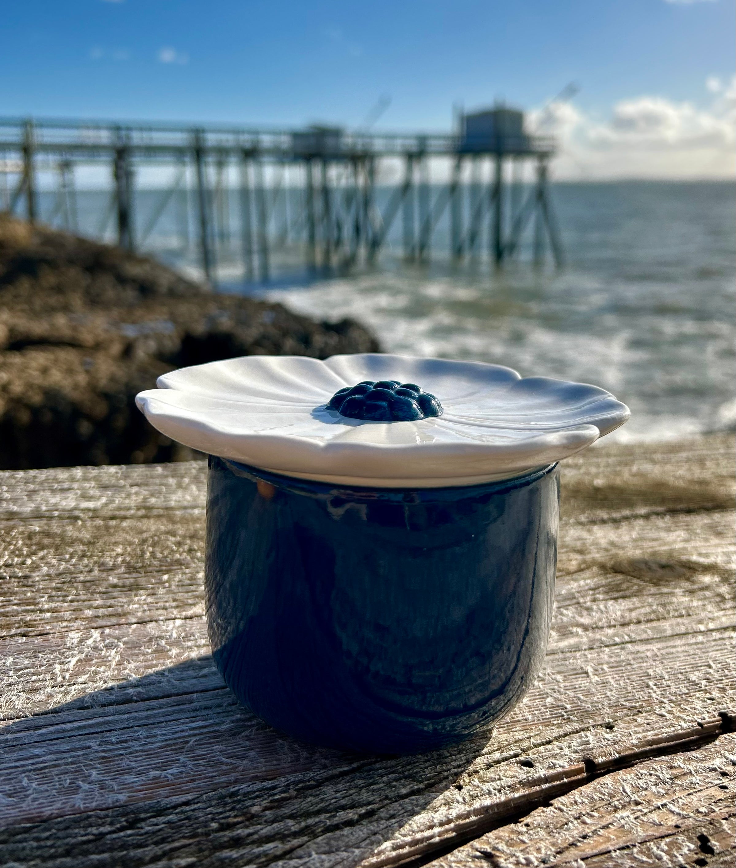 Dimensions : Diamètre du couvercle fleur : 13 cm / diamètre d’ouverture de la boîte : 9 cm / hauteur : 8 cm