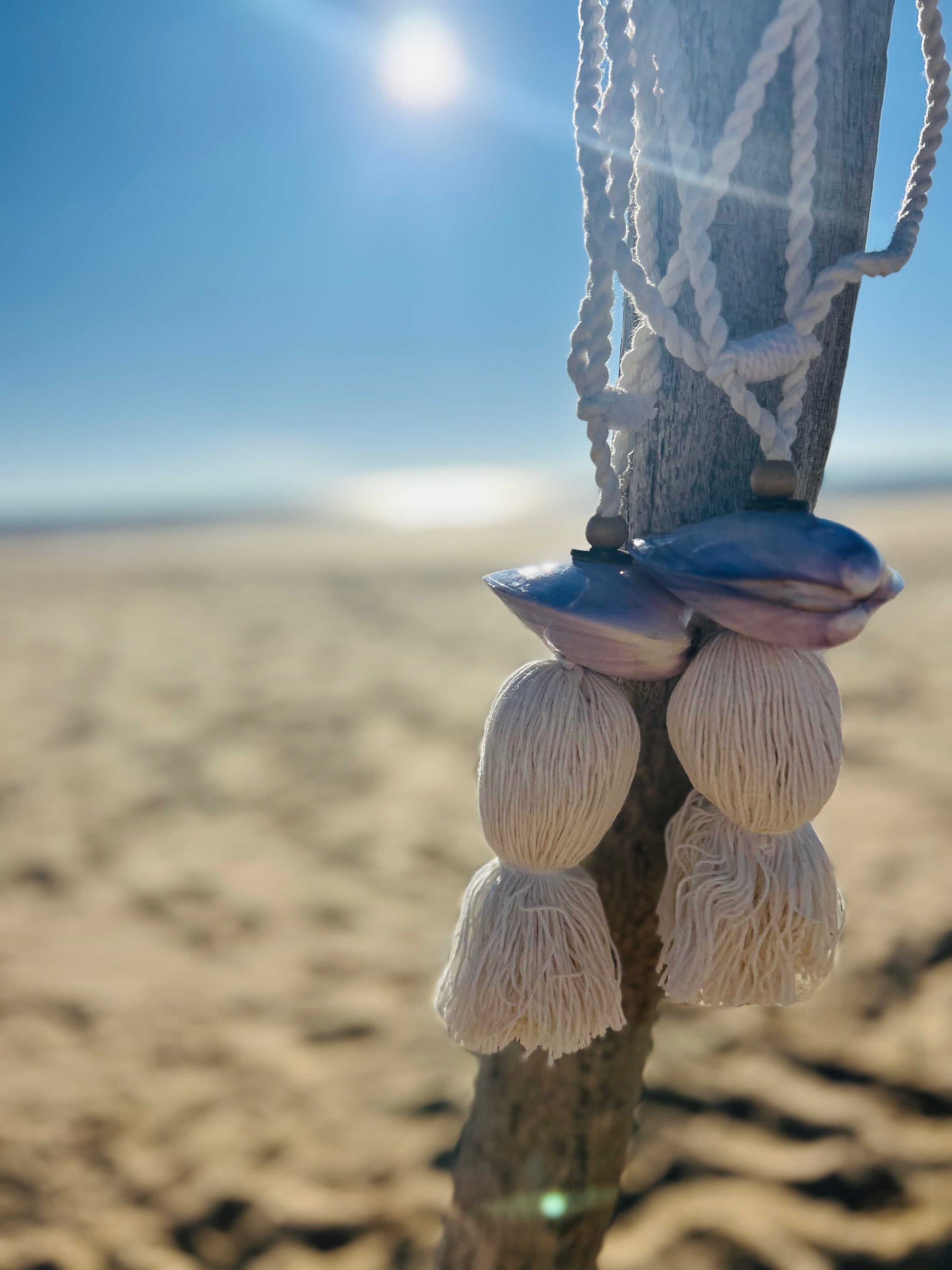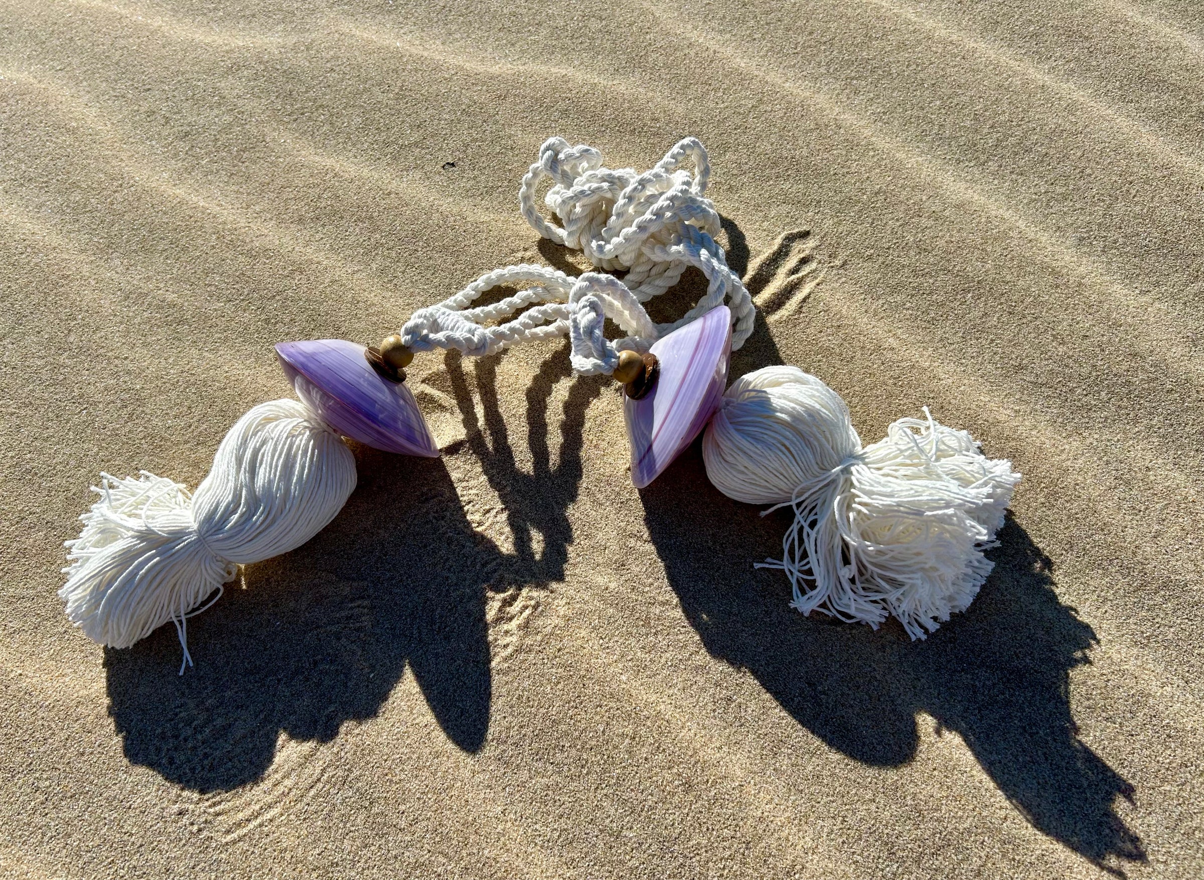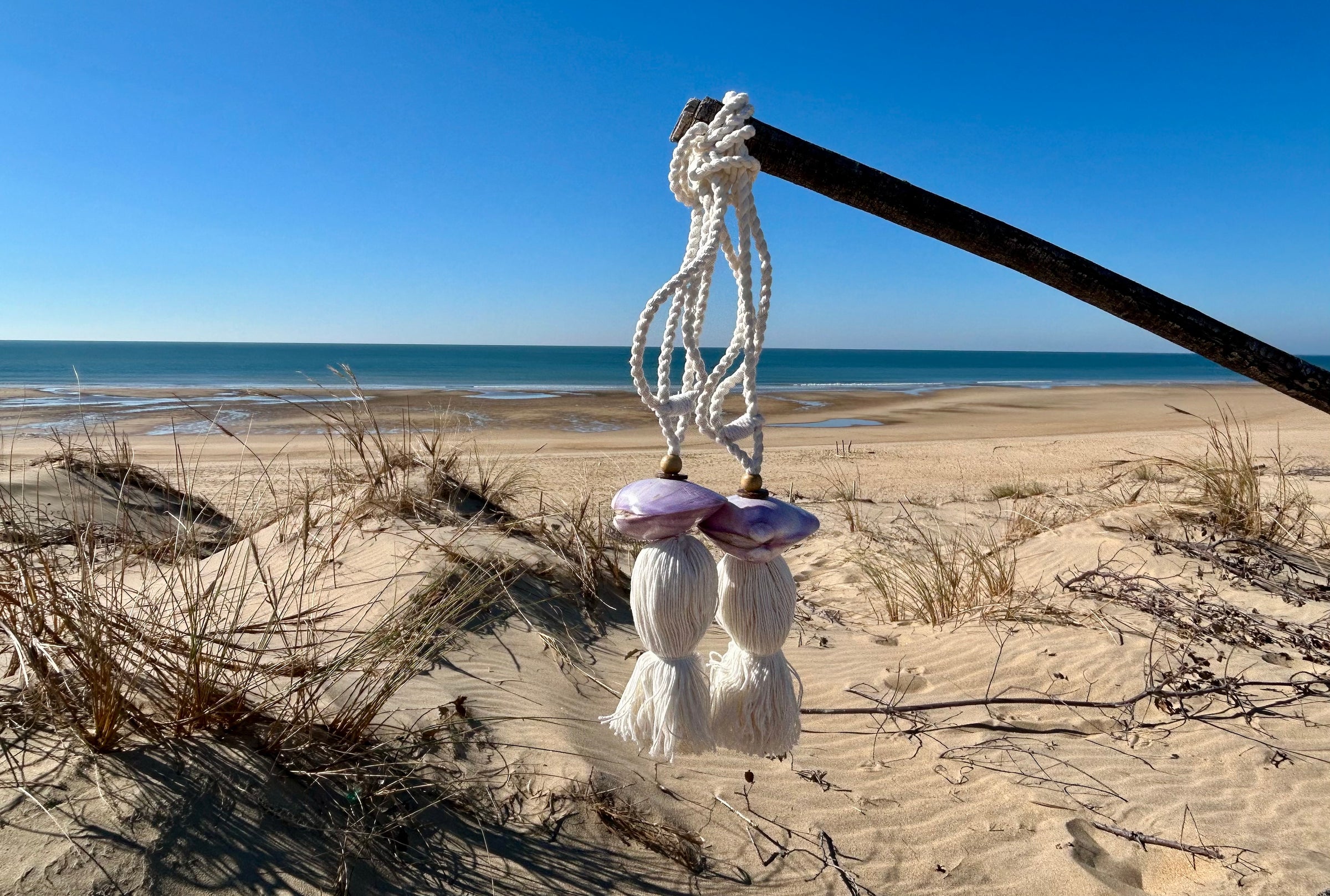Le coquillage bivalve, aux reflets violets et nacrés uniques, s’allie à la corde en coton tressé pour créer une décoration marine élégante et authentique, parfaite pour sublimer vos rideaux ou ajouter une note bord de mer à votre déco.