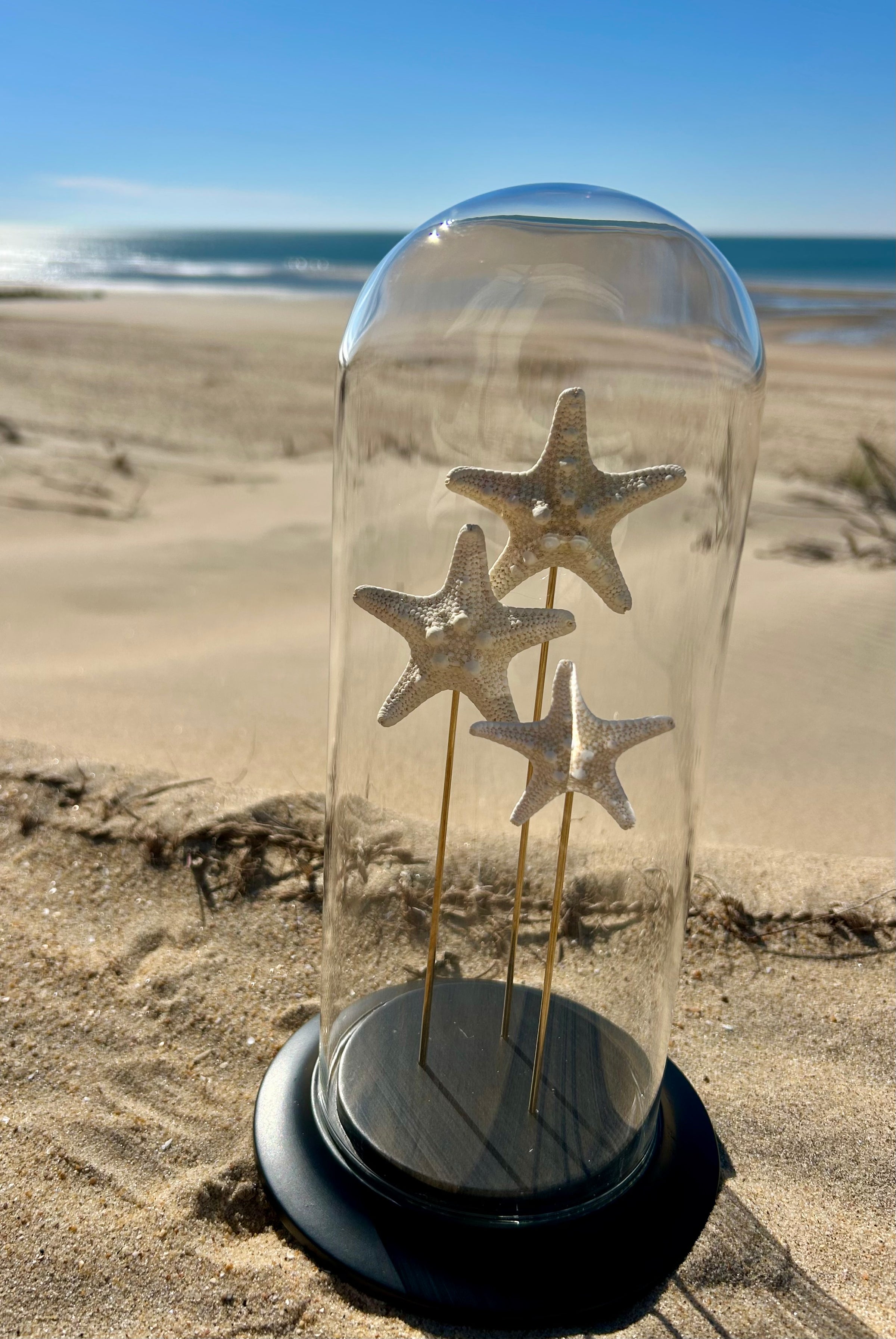 Comme un fragment d’océan capturé sous verre, ce globe délicat abrite trois étoiles de mer véritables, suspendues dans un doux silence. Tel un souvenir d’évasion, il évoque les rivages lointains, les marées apaisantes et les trésors oubliés sur le sable.