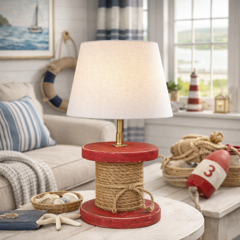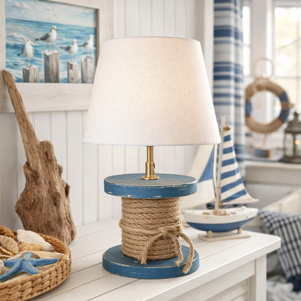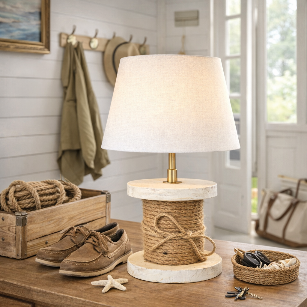 Apportez une touche authentique et chaleureuse à votre intérieur avec la lampe artisanale « Bobine marine », une création unique inspirée de l’univers bord de mer.