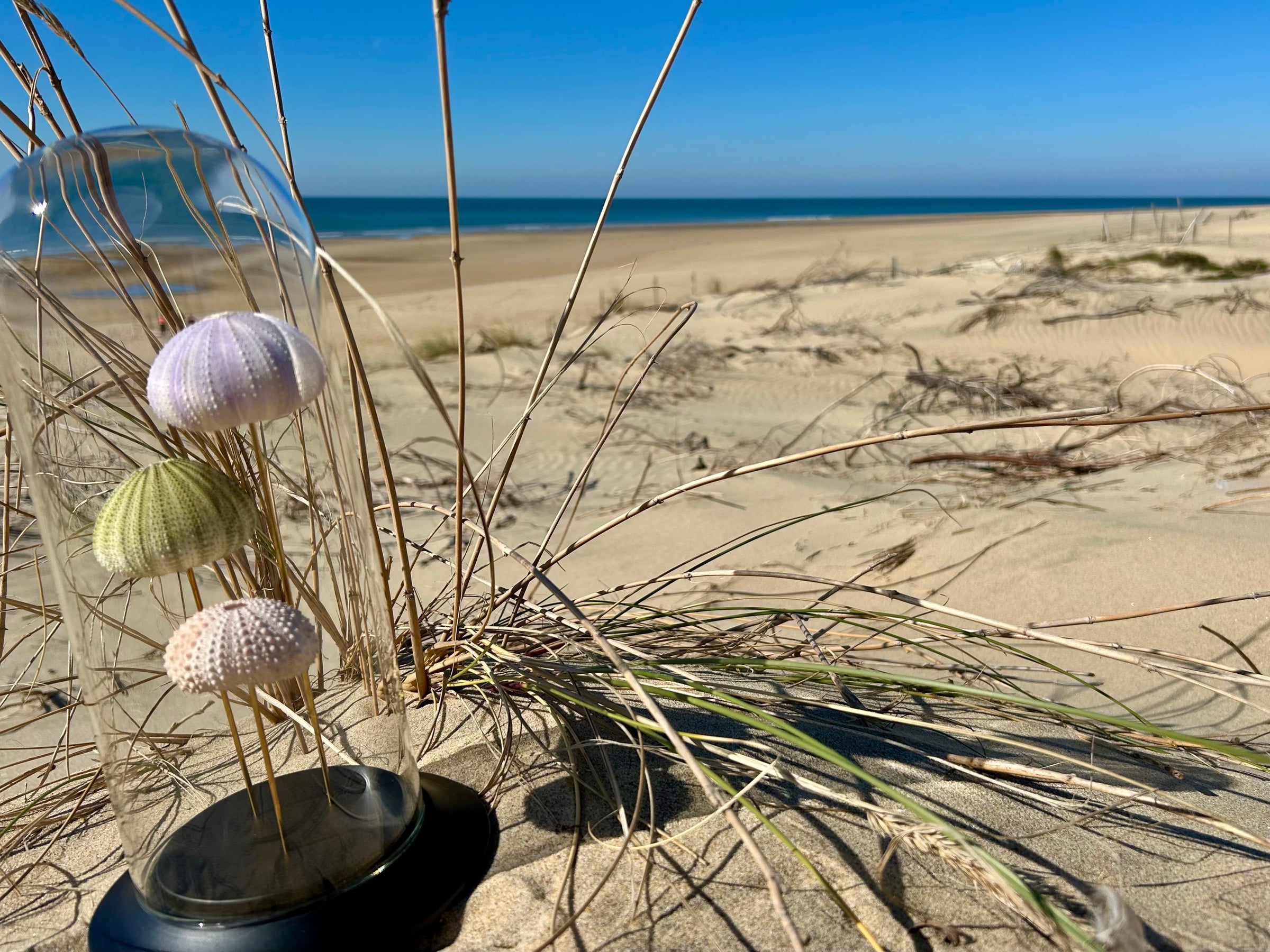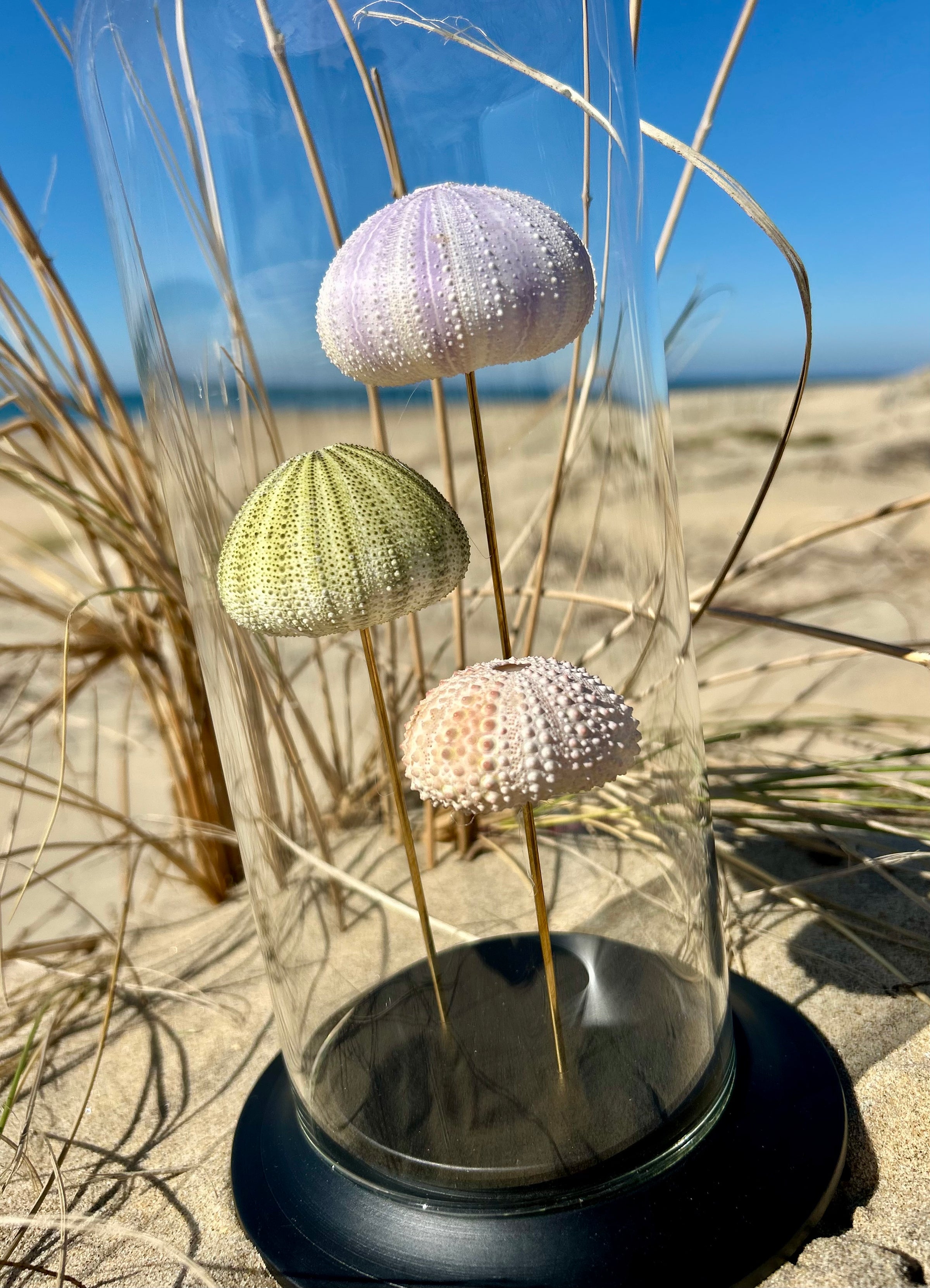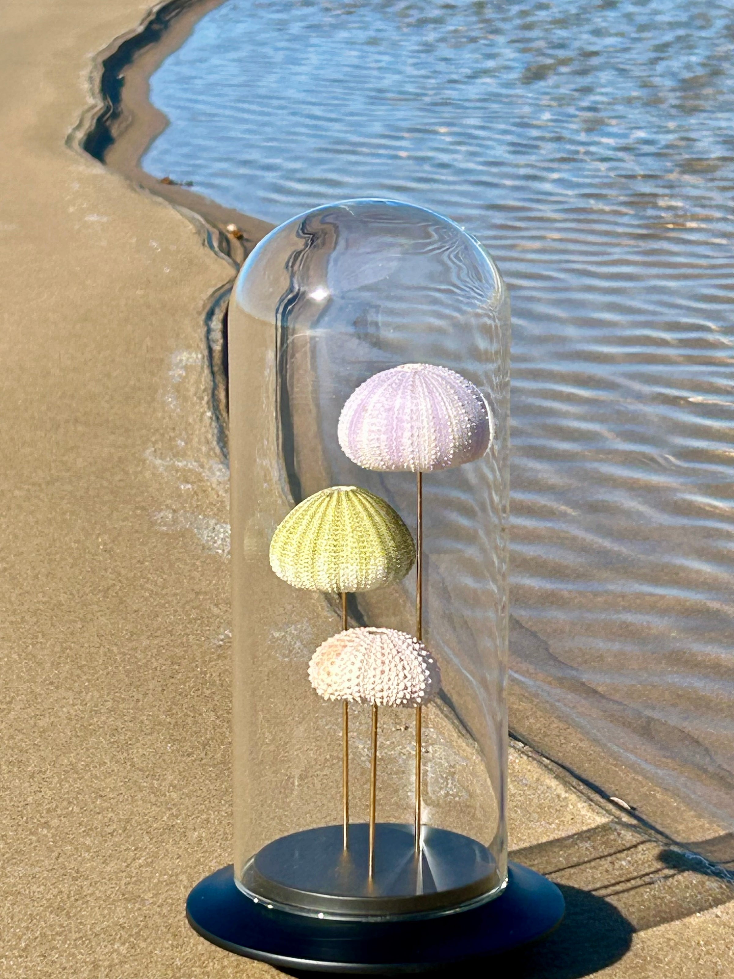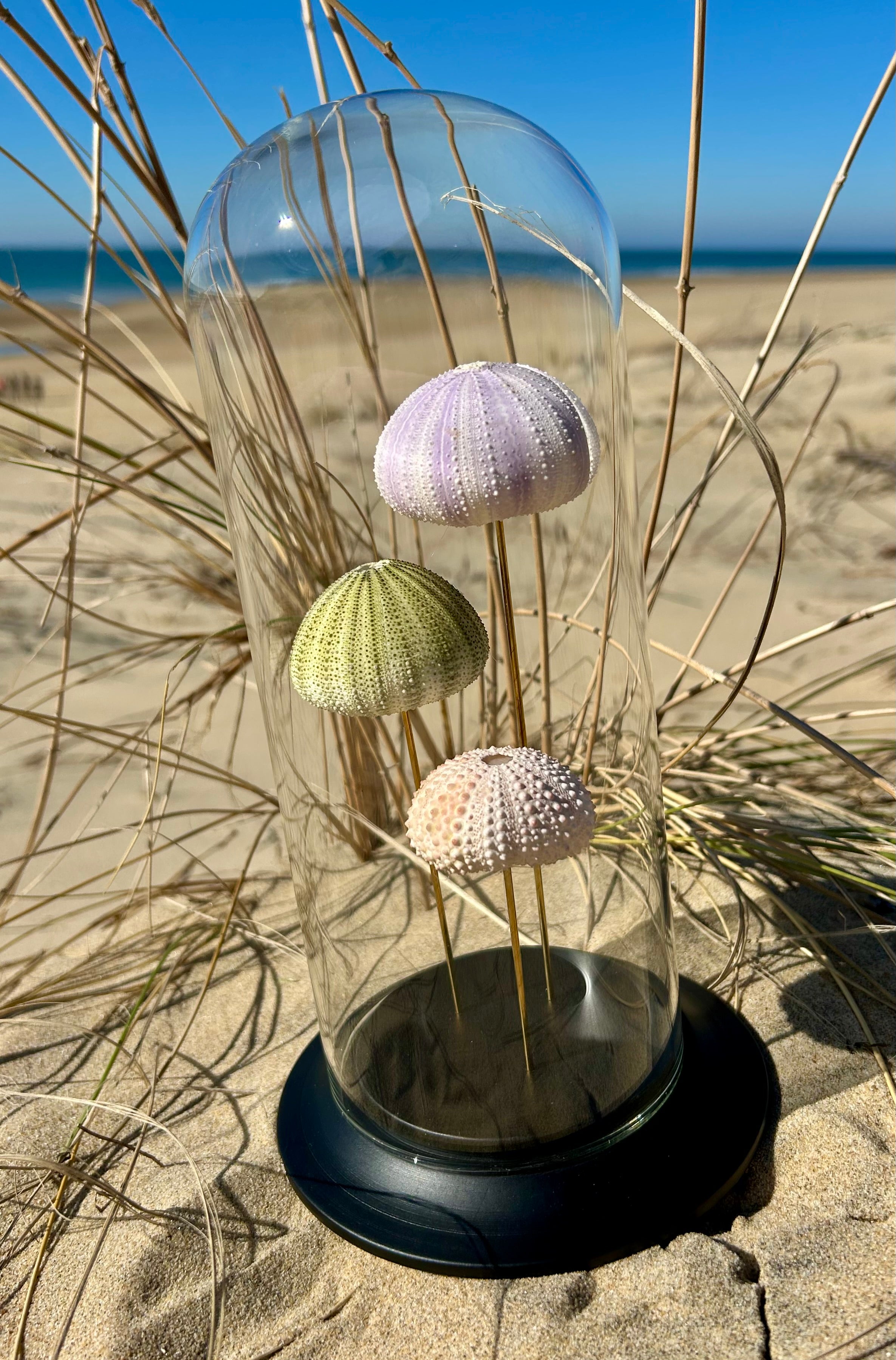Dans ce globe de verre dĂ©licatement posĂ© sur un socle de bois noir, trois oursins de mer vĂ©ritables, aux teintes pastel naturelles, semblent flotter comme suspendus dans le temps. Leurs formes douces et leur texture prĂ©cieuse racontent lâhistoire silencieuse des fonds marins, entre beautĂ© brute et fragilitĂ©.