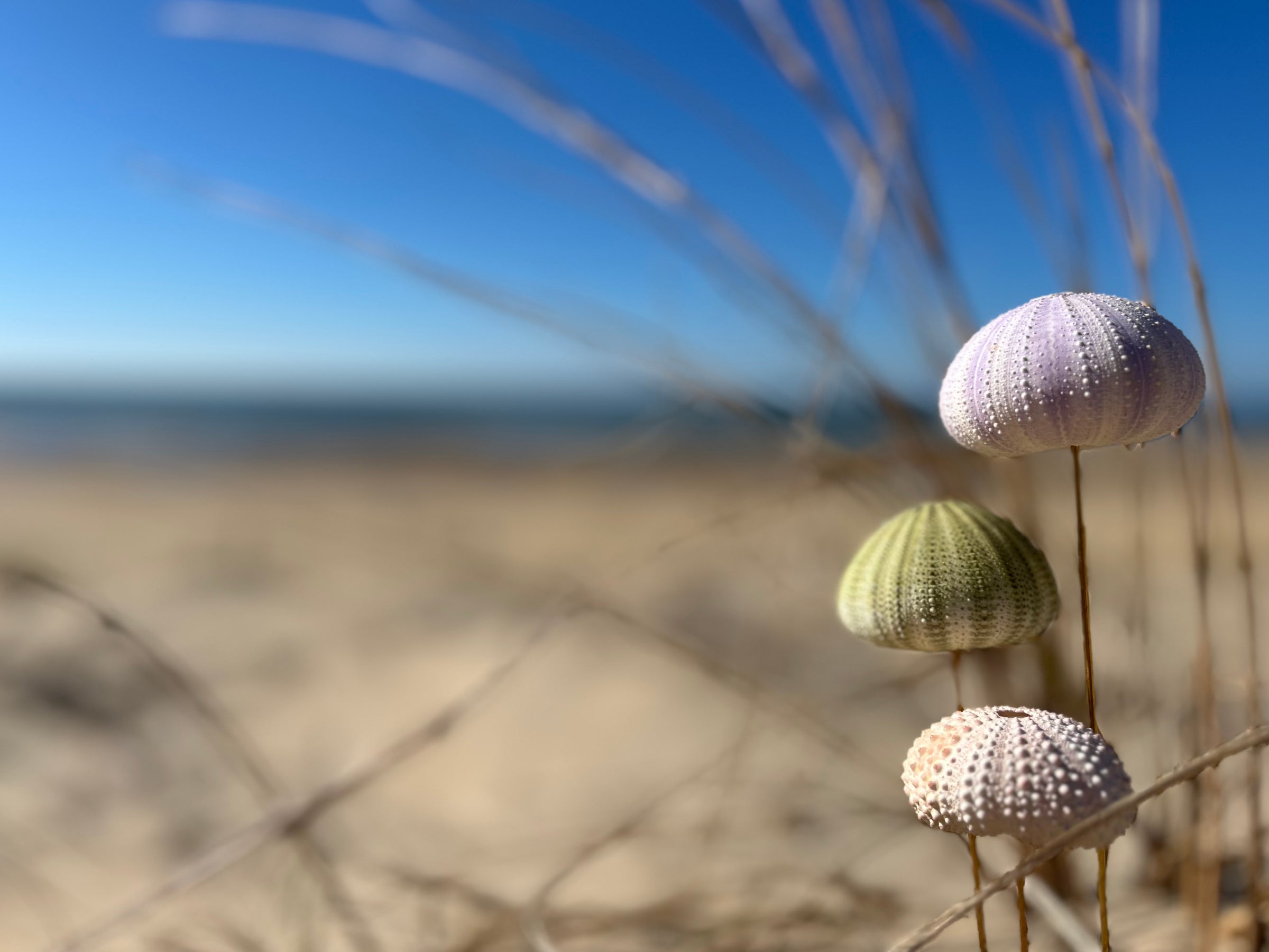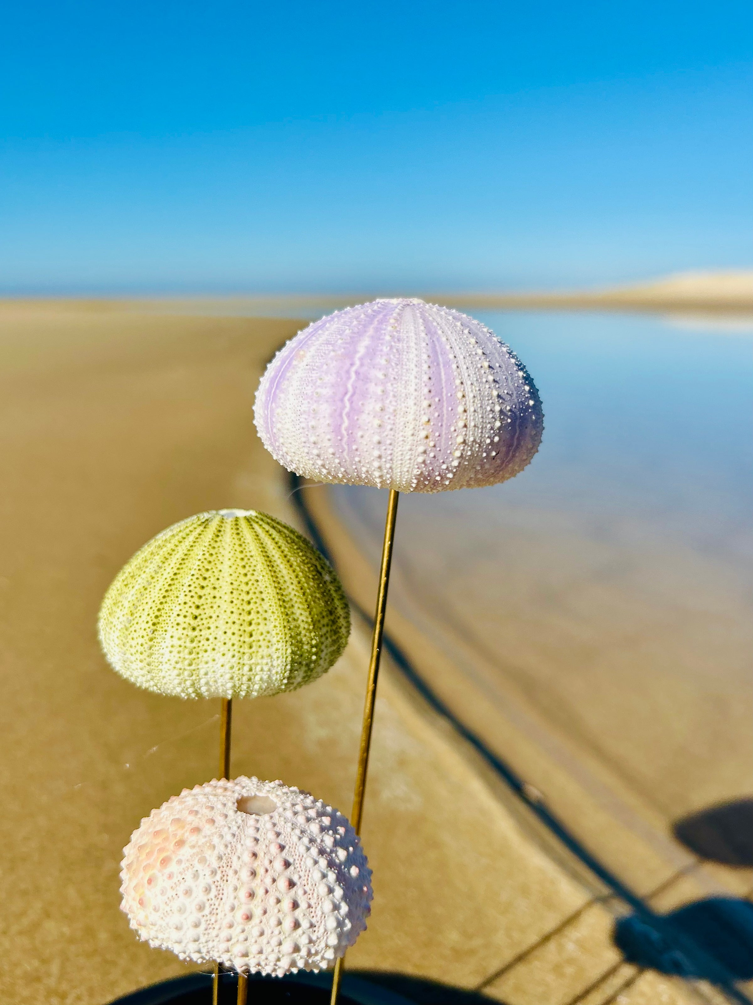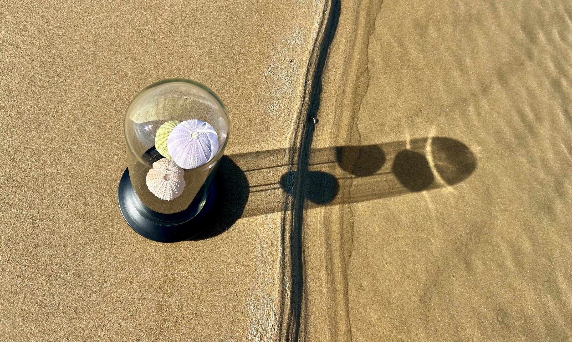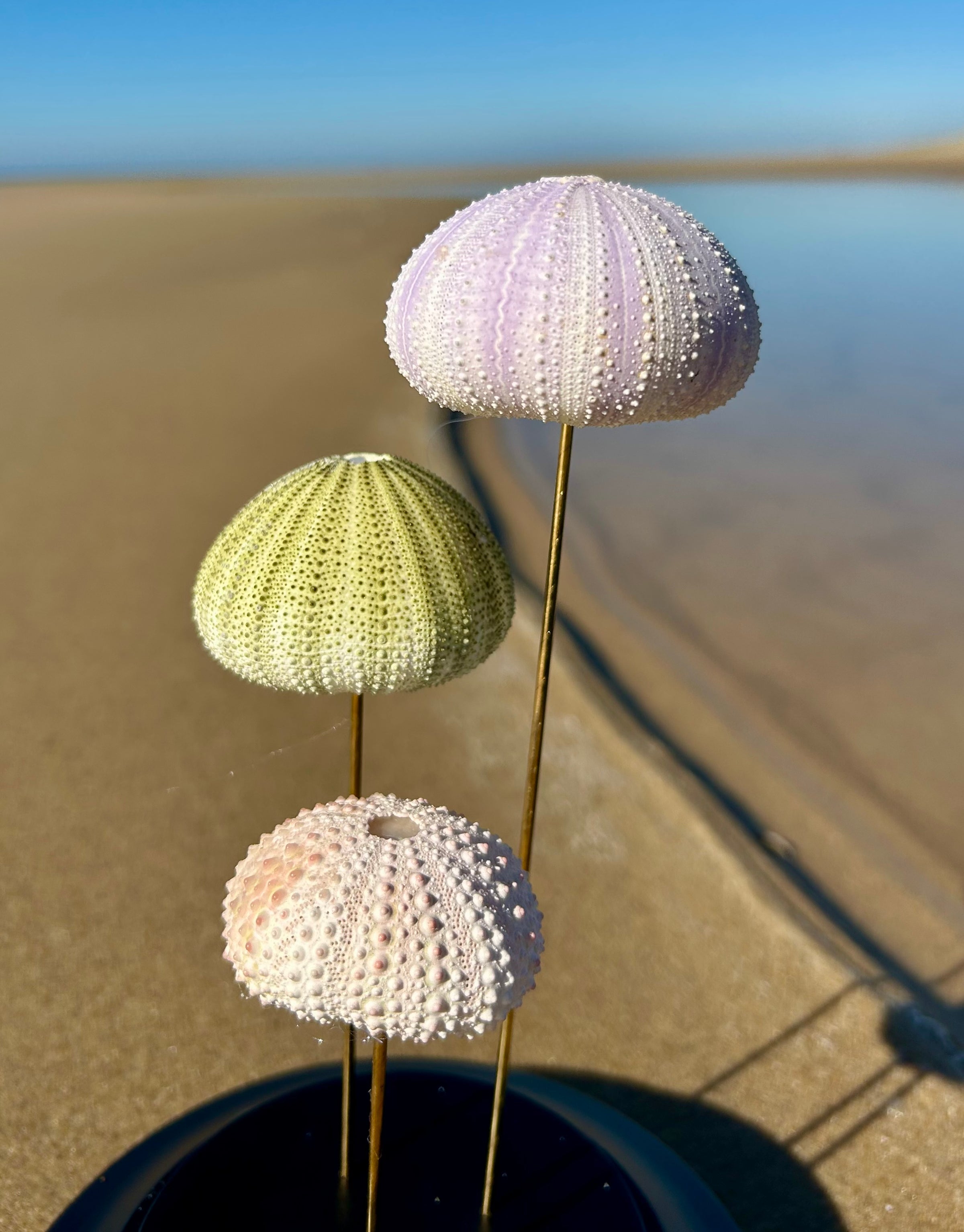 Dans ce globe de verre dĂ©licatement posĂ© sur un socle de bois noir, trois oursins de mer vĂ©ritables, aux teintes pastel naturelles, semblent flotter comme suspendus dans le temps. Leurs formes douces et leur texture prĂ©cieuse racontent lâhistoire silencieuse des fonds marins, entre beautĂ© brute et fragilitĂ©.