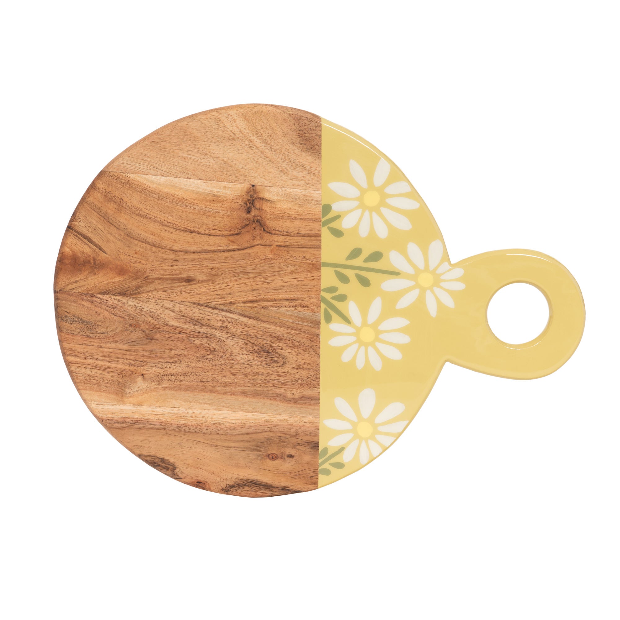 Alliez authenticité et douceur printanière avec la planche de service ronde Daisy, signée AMADEUS. Son design original associe la chaleur du bois naturel à un décor floral peint inspiré des marguerites emblématiques de la collection.