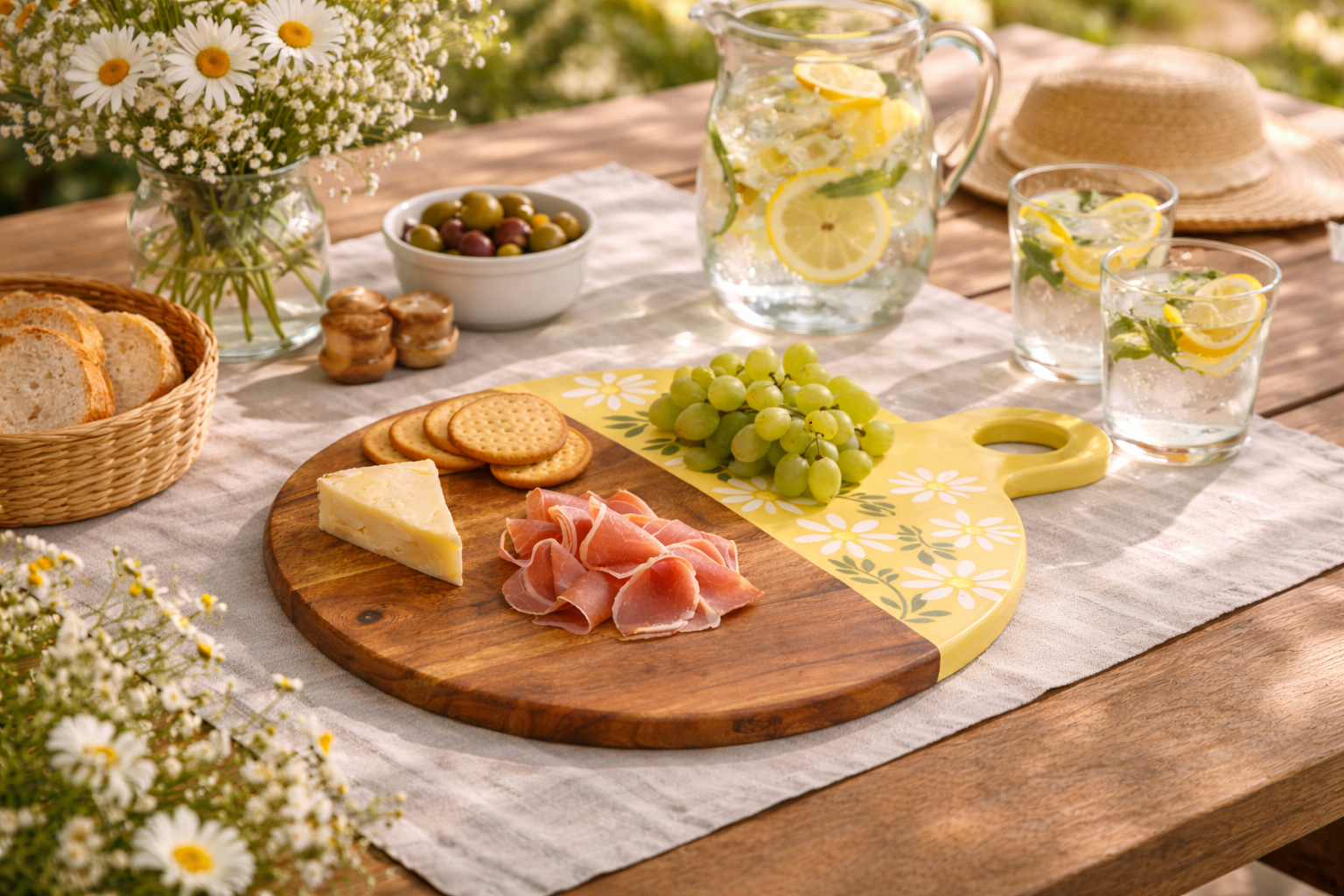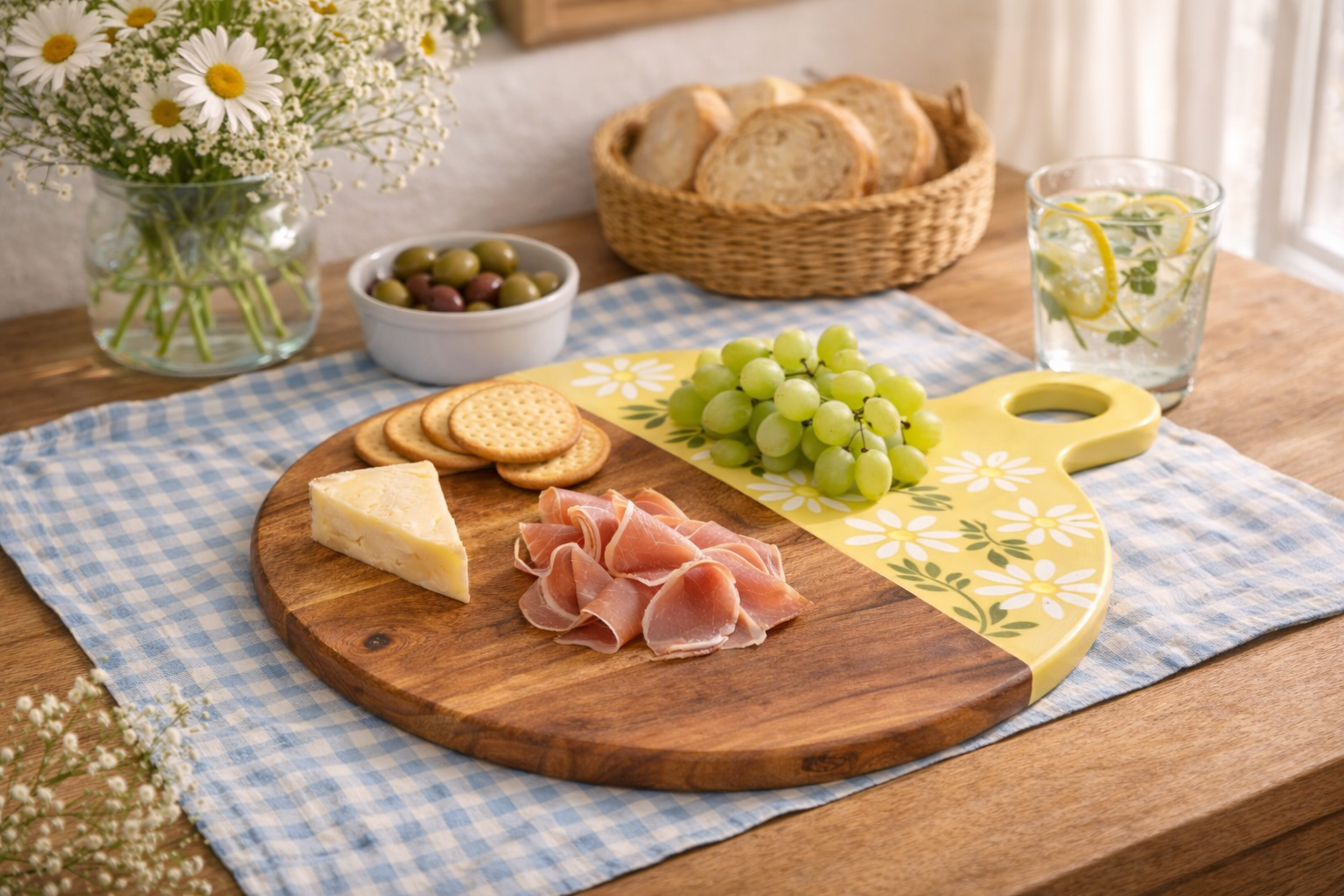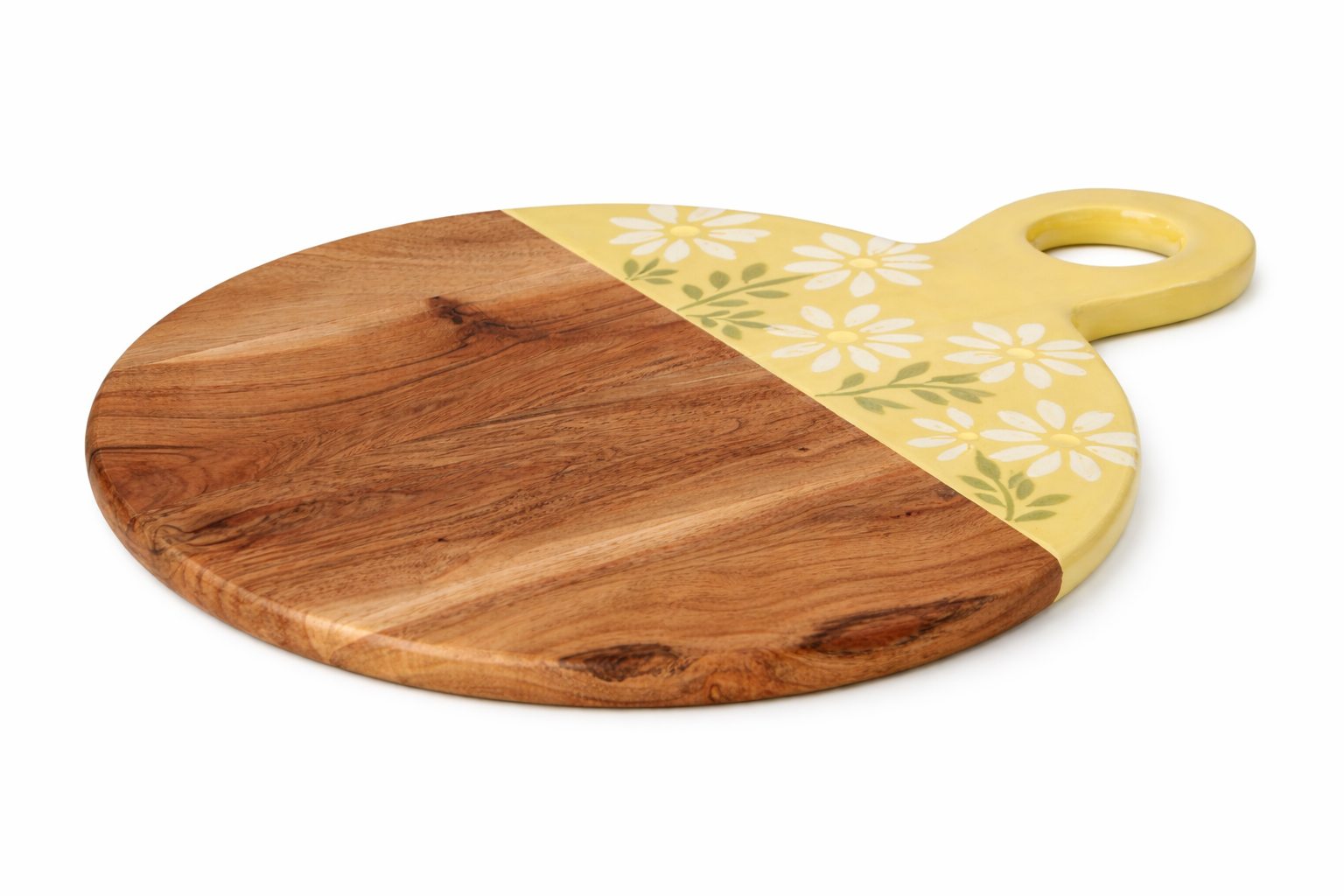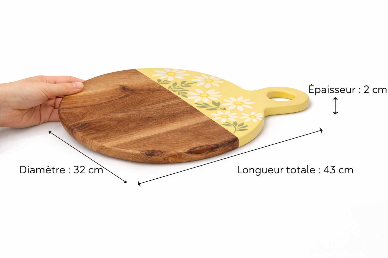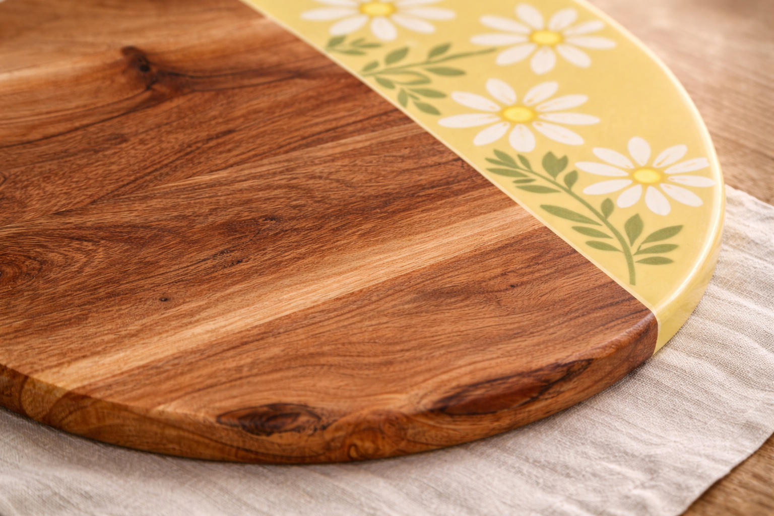 La moitié du plateau met en valeur les nuances et le veinage du bois, tandis que l’autre moitié dévoile un fond délicatement coloré orné de fleurs blanches aux cœurs jaunes, pour une présentation à la fois élégante et conviviale.