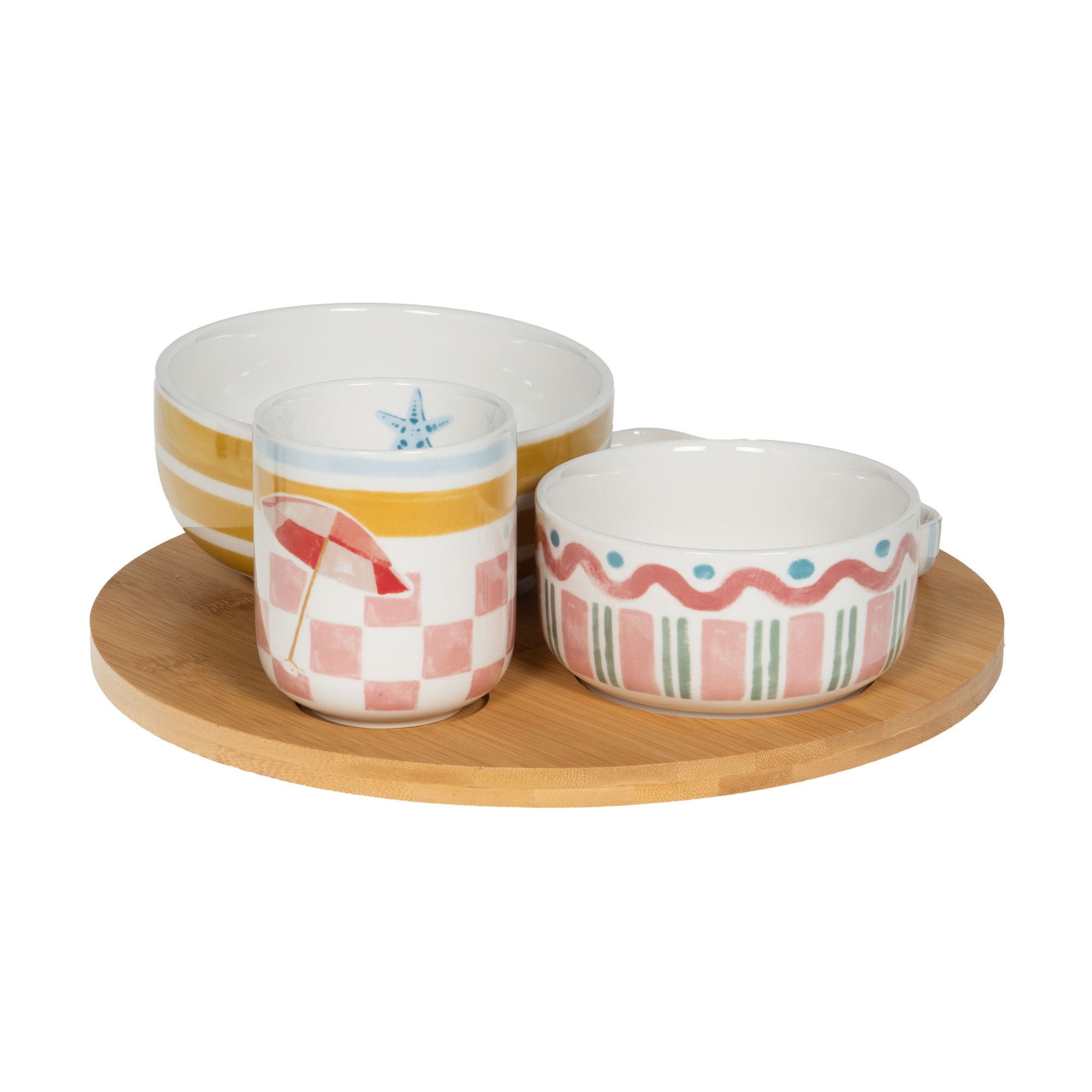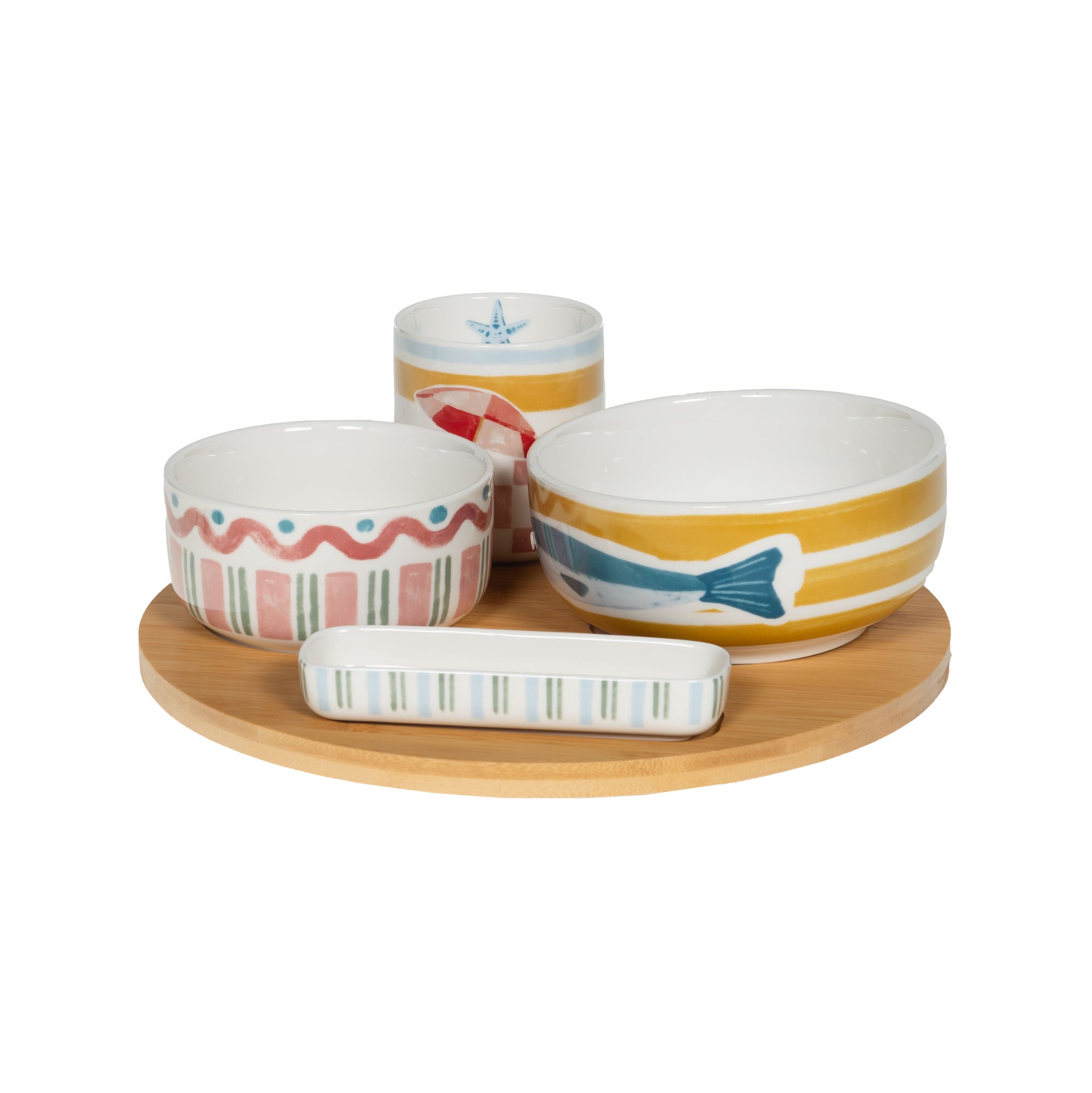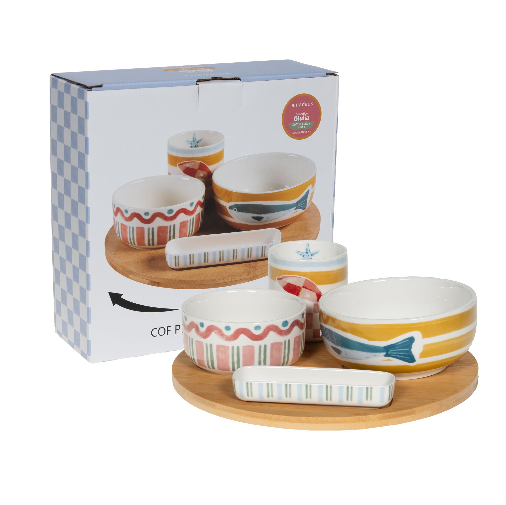 Invitez l’esprit bord de mer à votre table avec le coffret de présentation « Giulia » signé AMADEUS. Pensé pour les moments conviviaux, ce service associe un plat rond, 4 bols en porcelaine fine et un plateau en bois clair, dans un design lumineux aux motifs marins et nautiques.