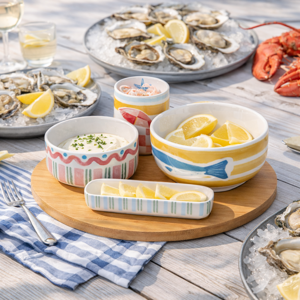 Ce coffret est idéal pour servir tapas, mezzés, olives, fruits secs ou sauces, composer un apéritif chic et convivial, sublimer une table d’été élégante & offrir un cadeau raffiné esprit bord de mer