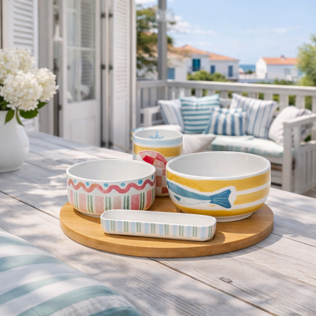Rayures solaires, poisson stylisé, parasol, étoile de mer… Chaque détail évoque les maisons de vacances face à l’océan, les déjeuners en terrasse et les apéritifs d’été prolongés.