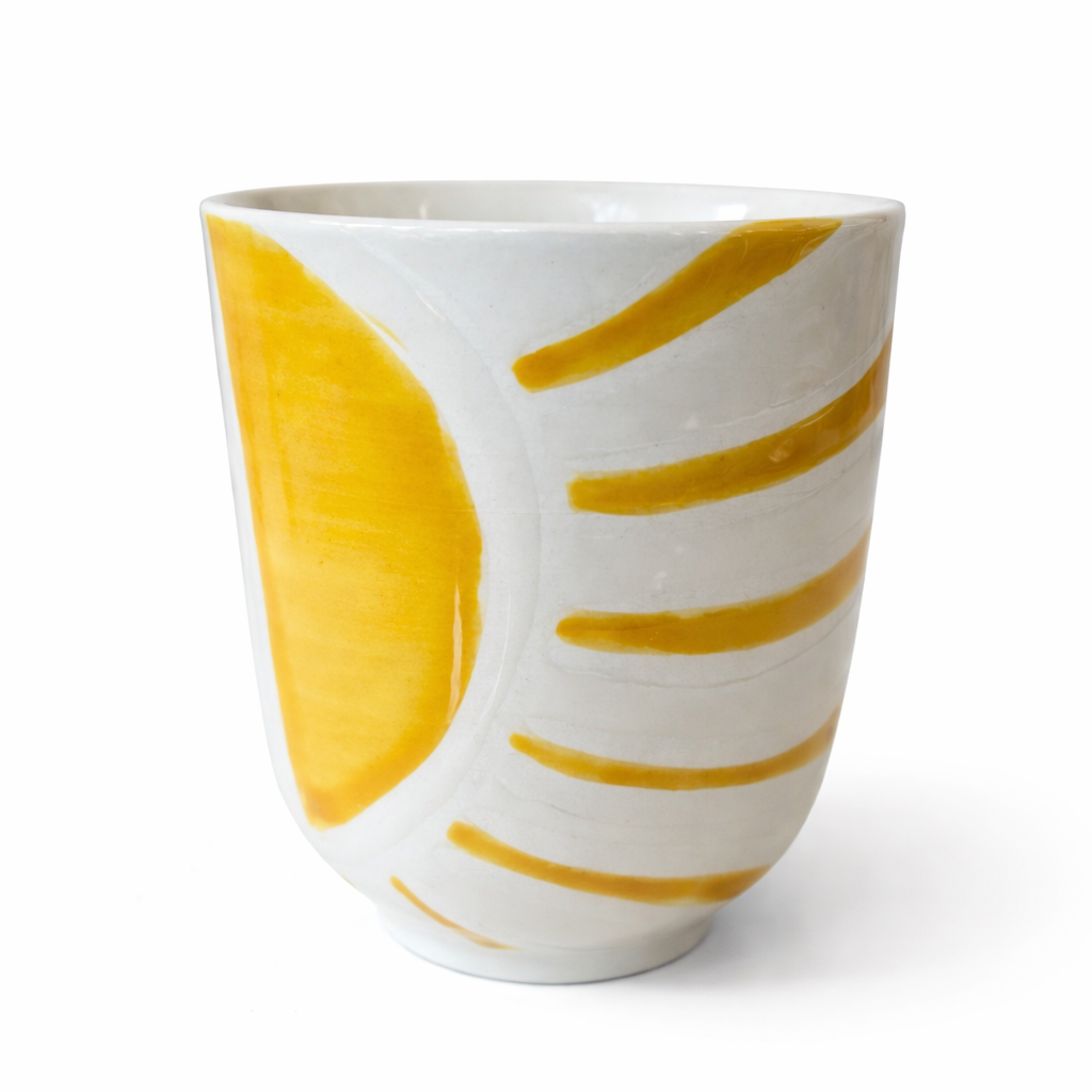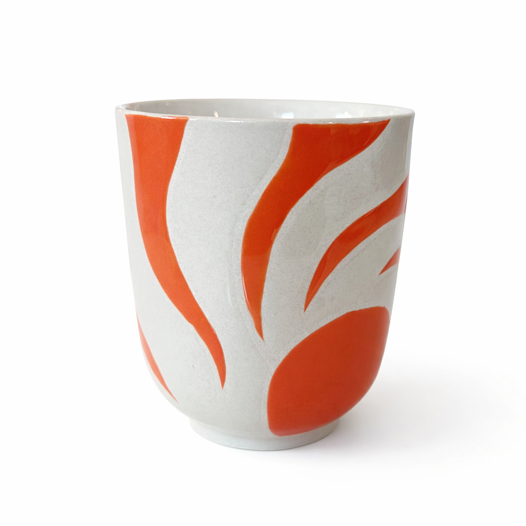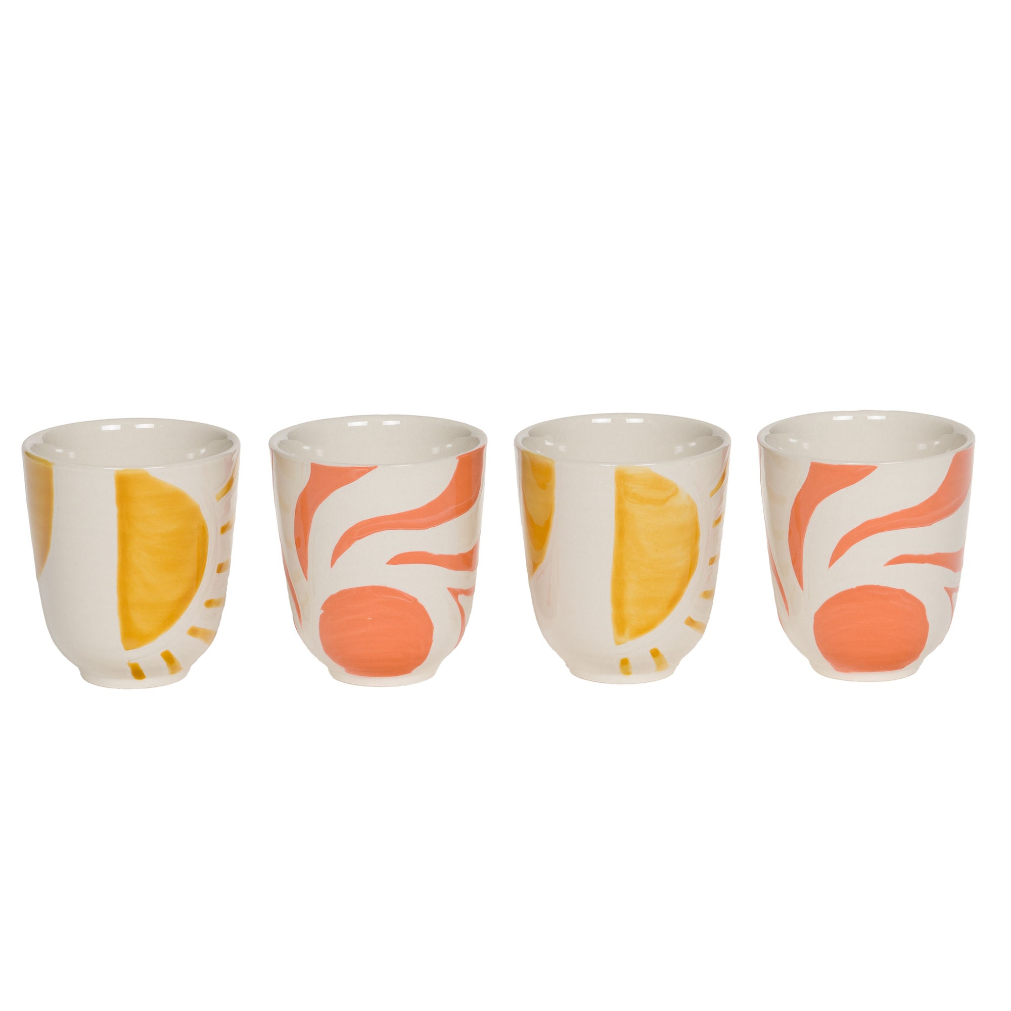 En grès, ces tasses aux motifs corail et jaune peints sur fond écru rappellent les couleurs du littoral : le sable chaud, les couchers de soleil, les façades blanches éclatantes sous le soleil.