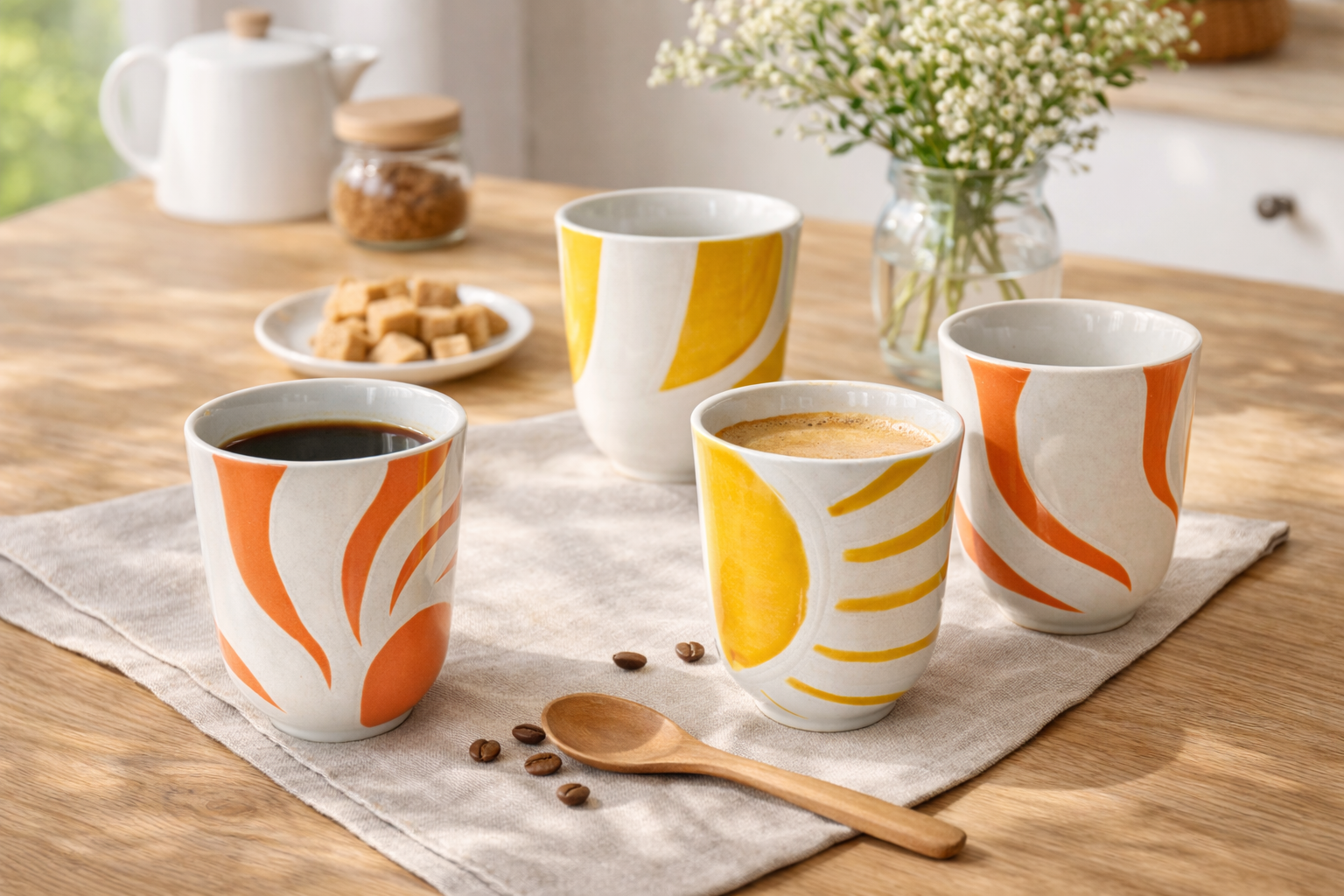 Les lignes organiques et les teintes solaires insufflent une atmosphère douce et chaleureuse. Associées à du lin naturel, du bois clair ou de la vaisselle artisanale, les tasses "Ilona" créent une table simple, élégante et pleine de fraîcheur.