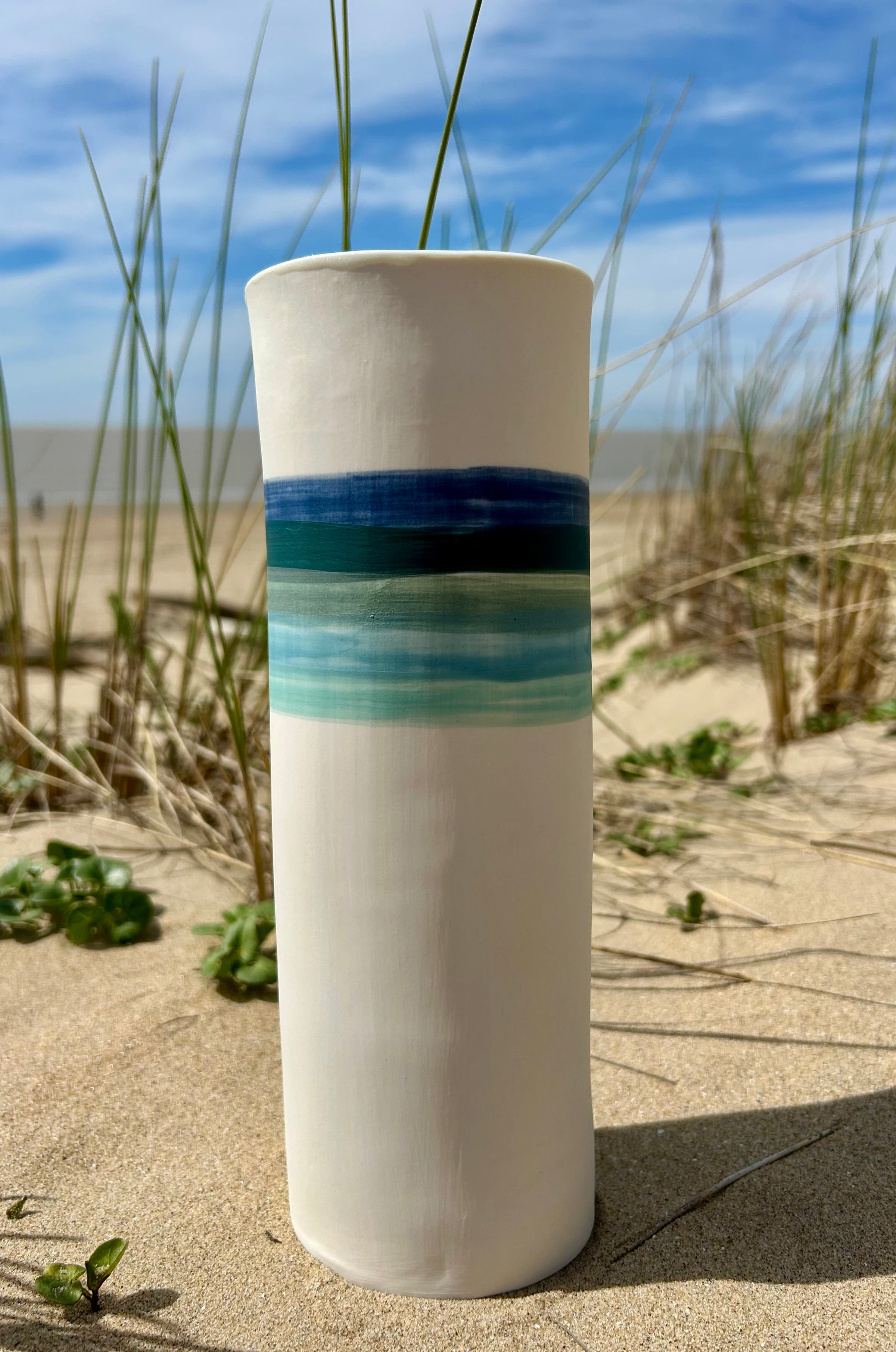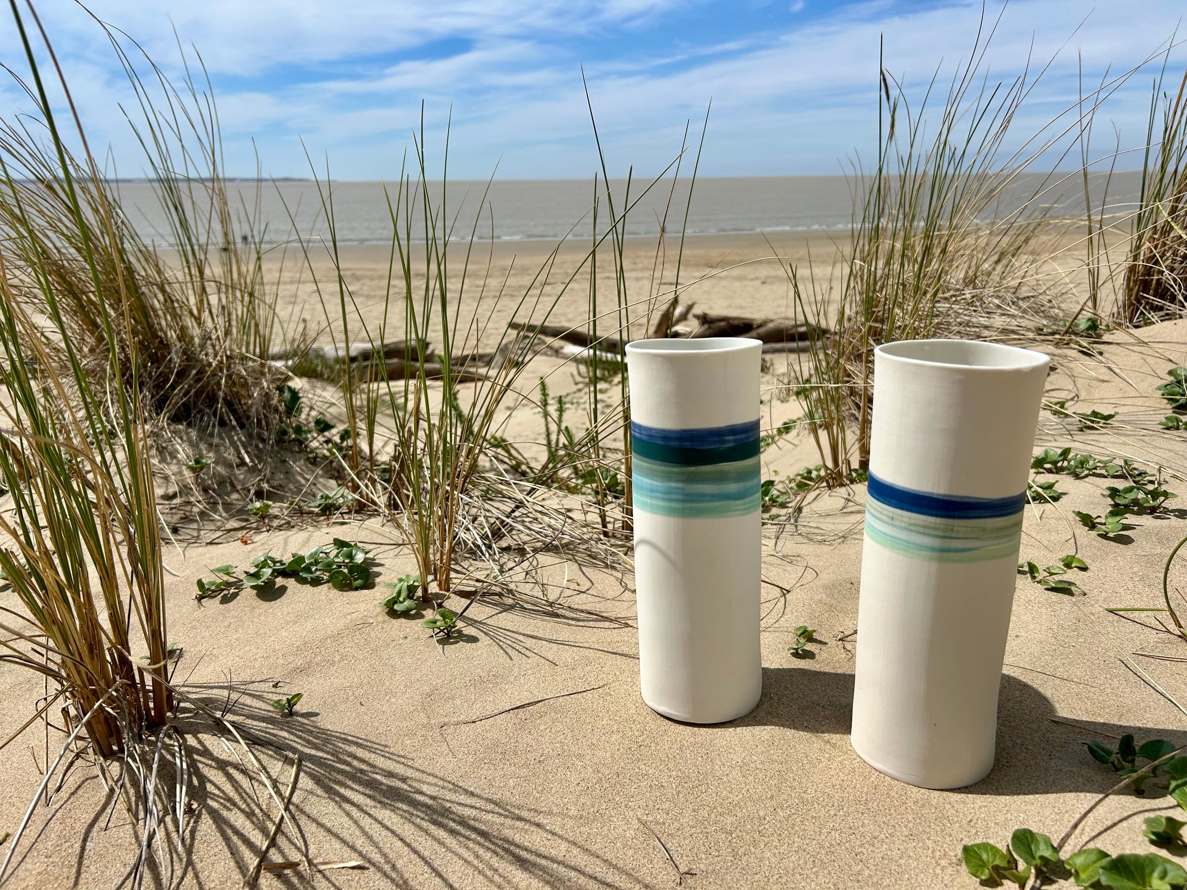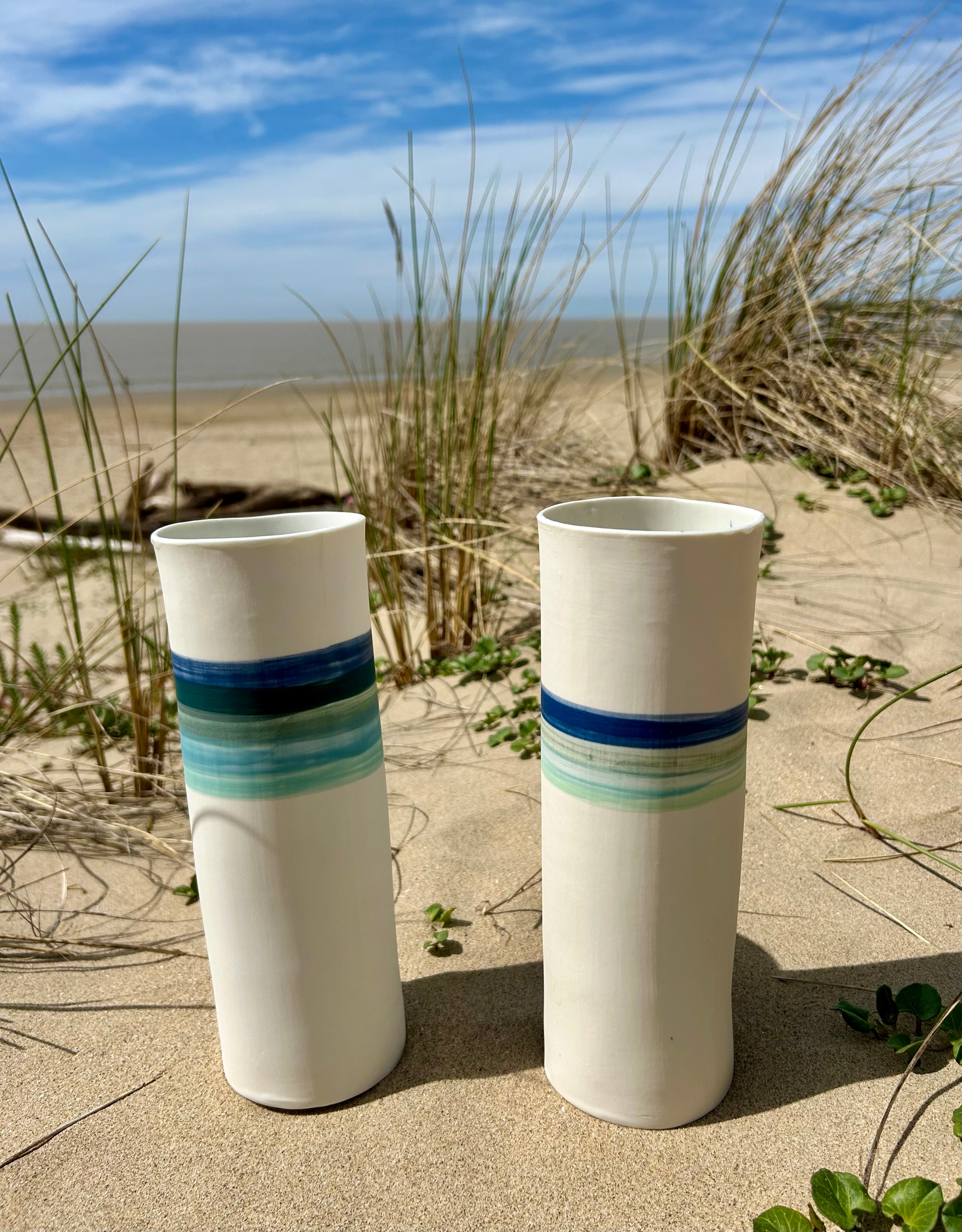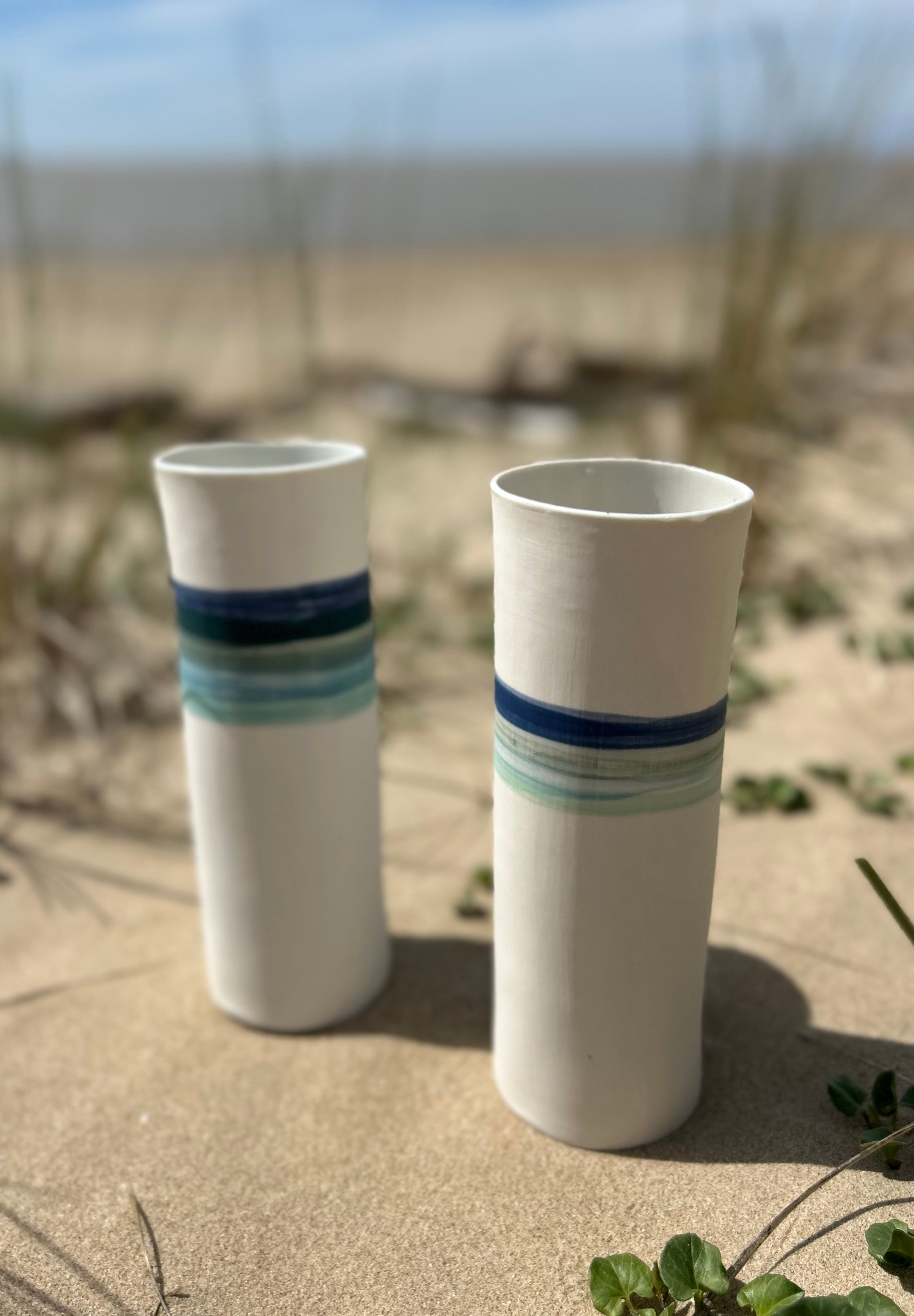 Entièrement façonnés à la main par l’Atelier Terres d’Angely, céramiste en Charente-Maritime, ces vases en porcelaine sont des pièces uniques issues d’un savoir-faire artisanal local. Chaque création reflète l’authenticité du geste et l’inspiration directe des paysages côtiers de la région.
