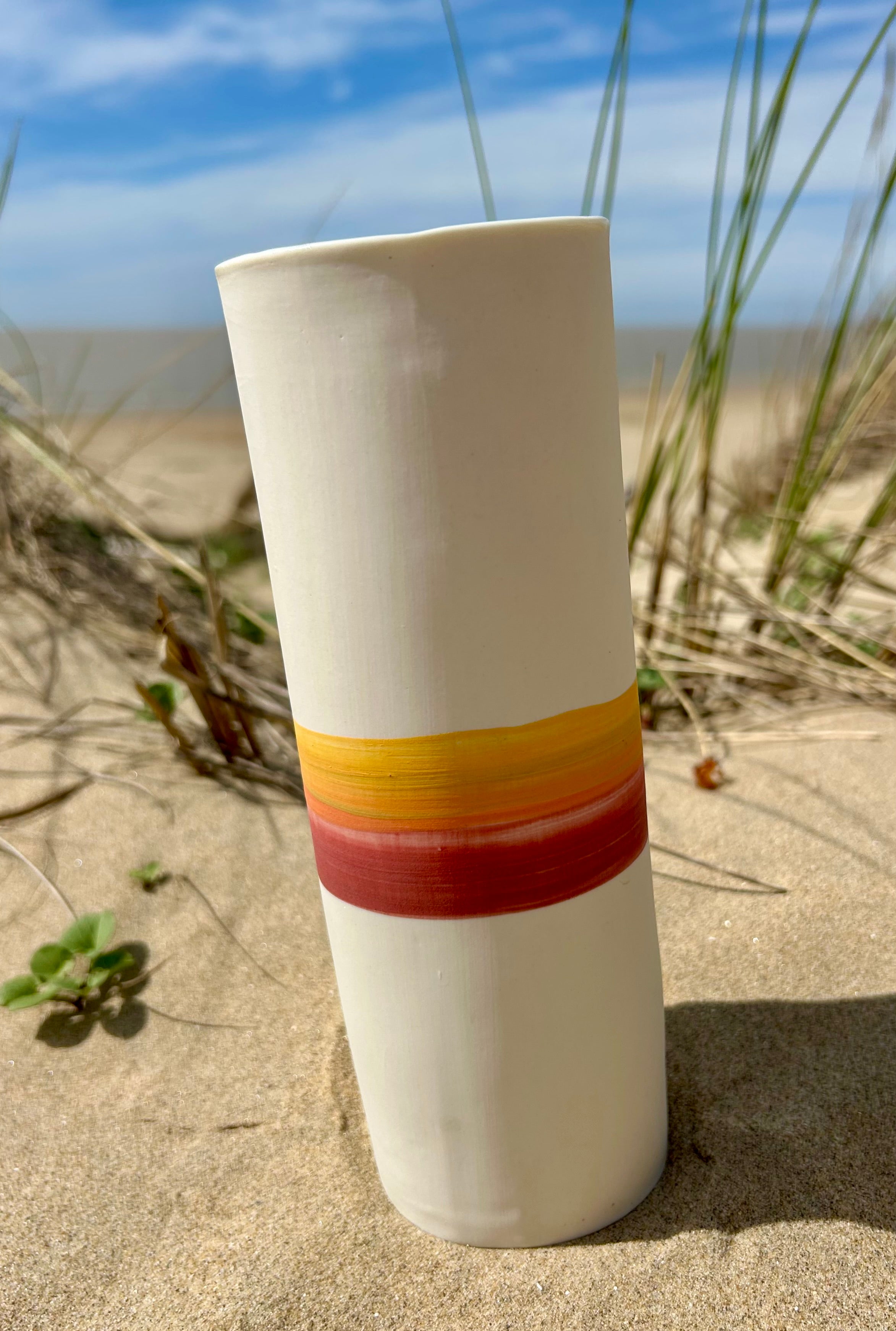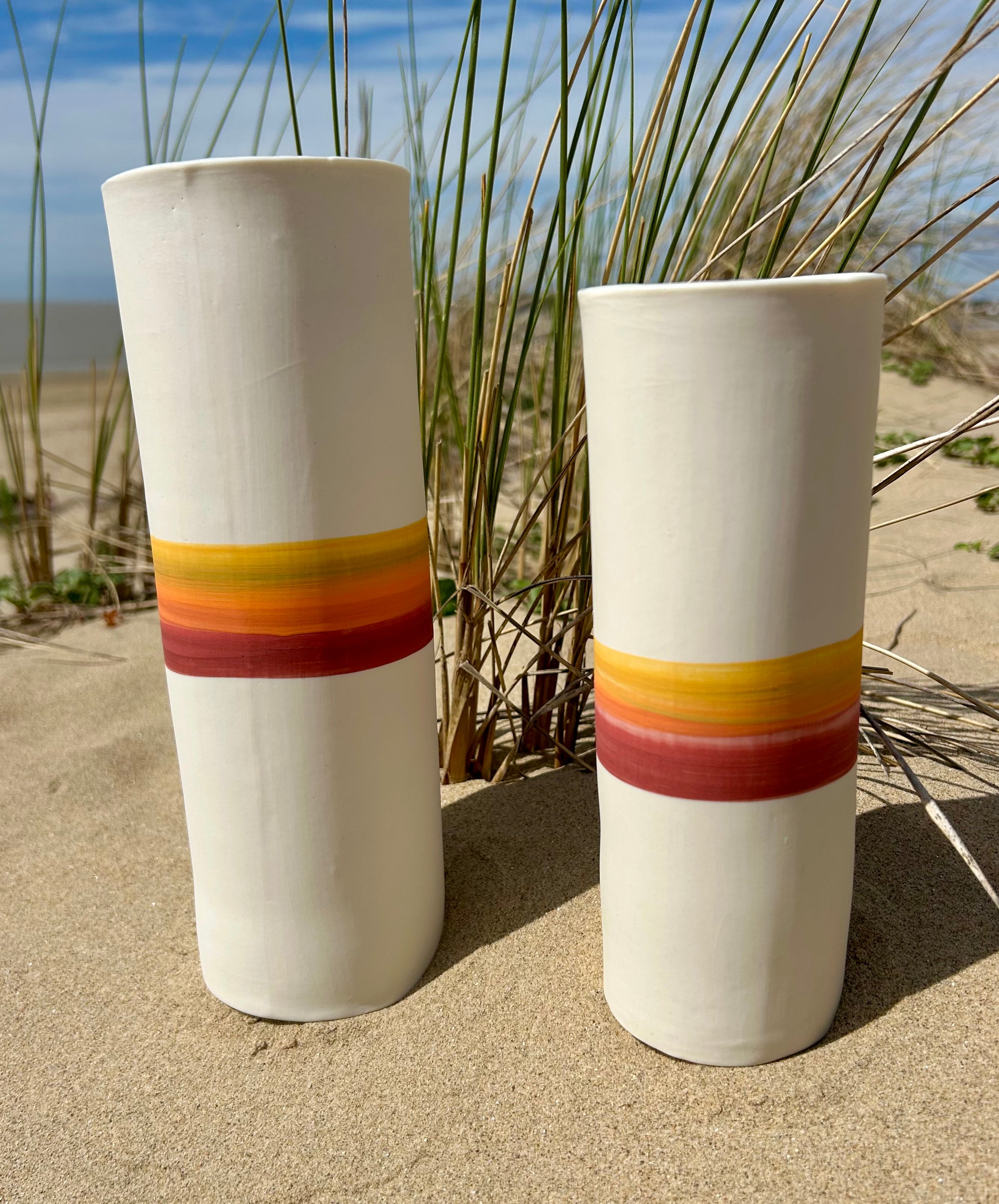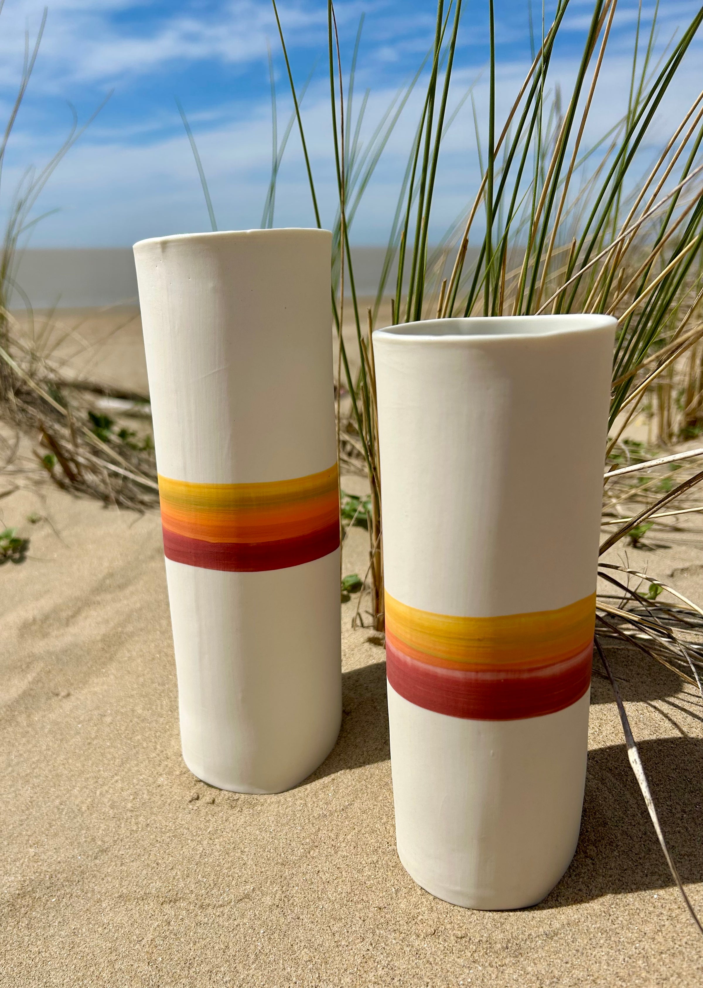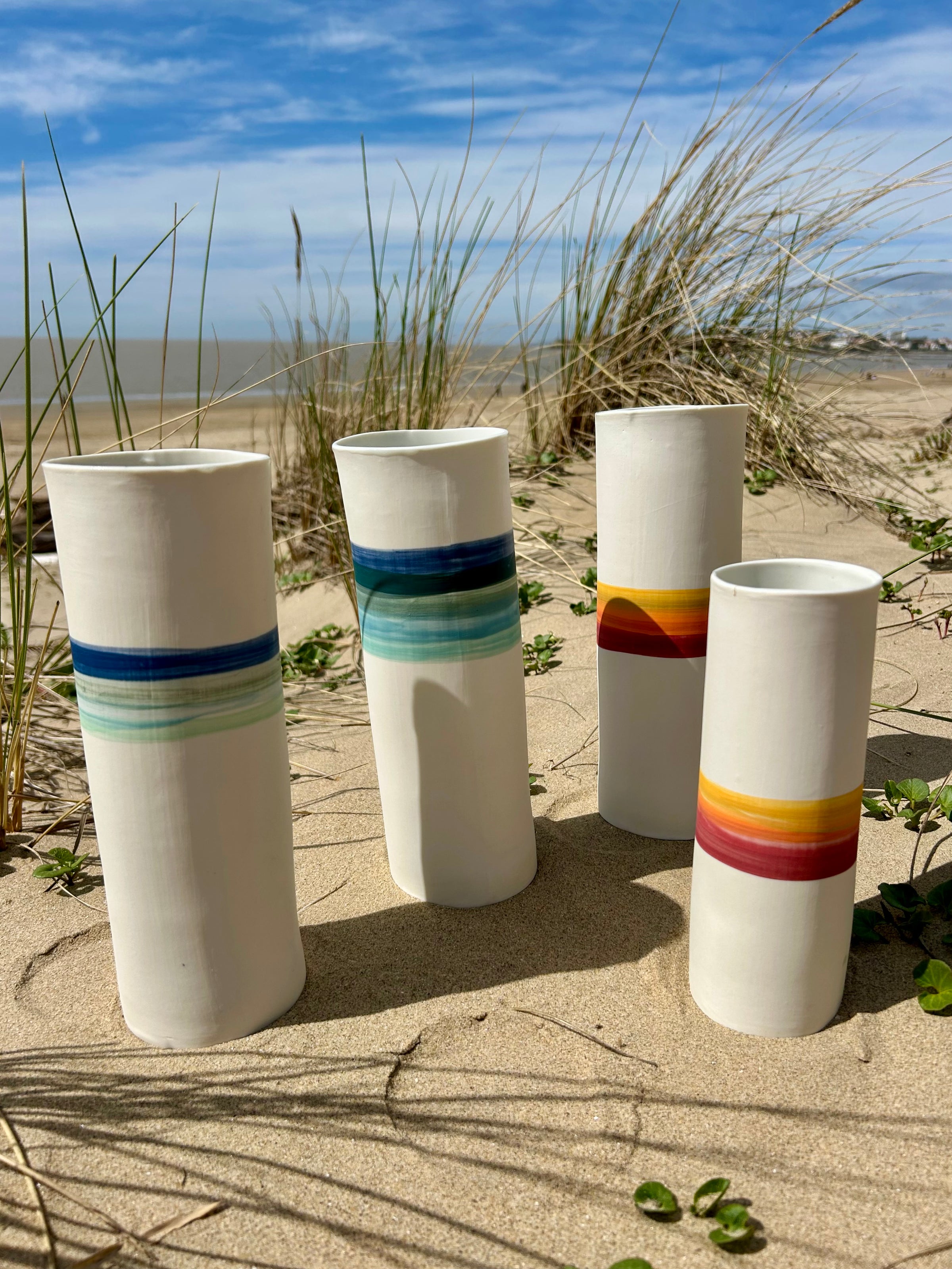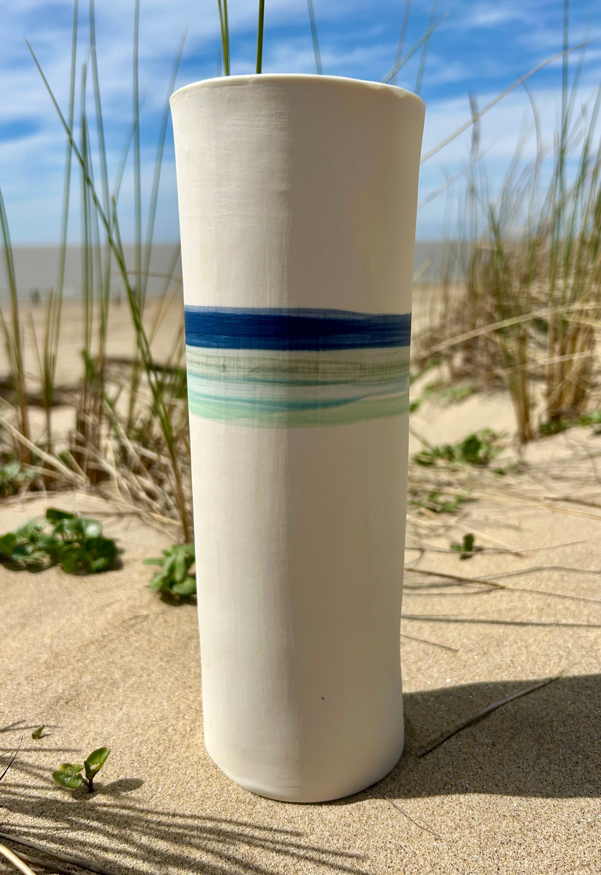 Entièrement façonnés à la main par l’Atelier Terres d’Angely, céramiste en Charente-Maritime, ces vases en porcelaine sont des pièces uniques issues d’un savoir-faire artisanal local. Chaque création reflète l’authenticité du geste et l’inspiration directe des paysages côtiers de la région.
