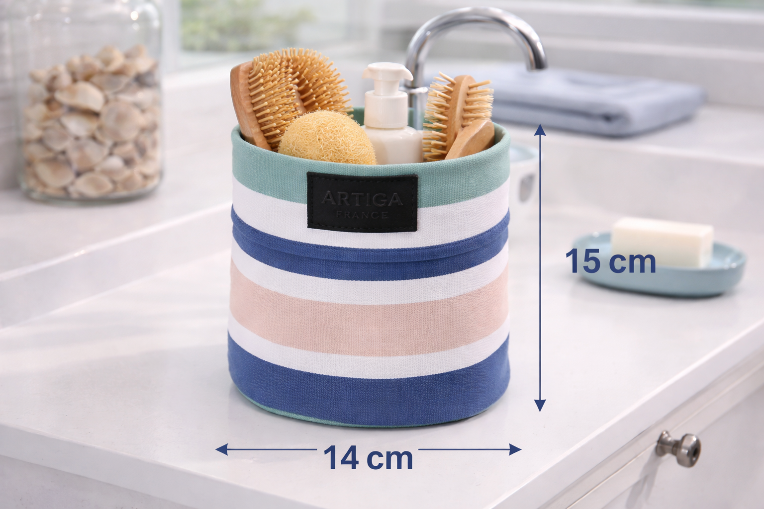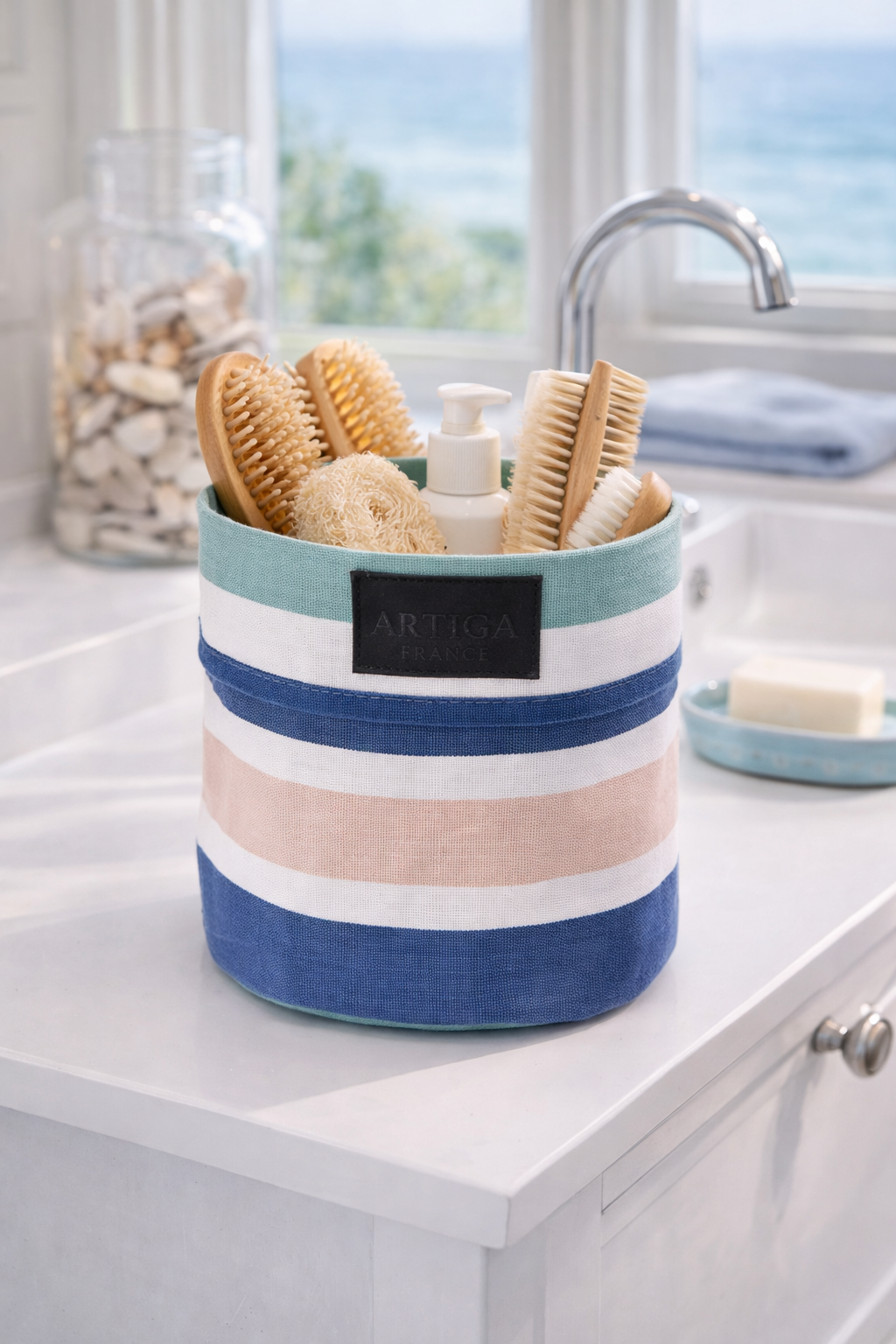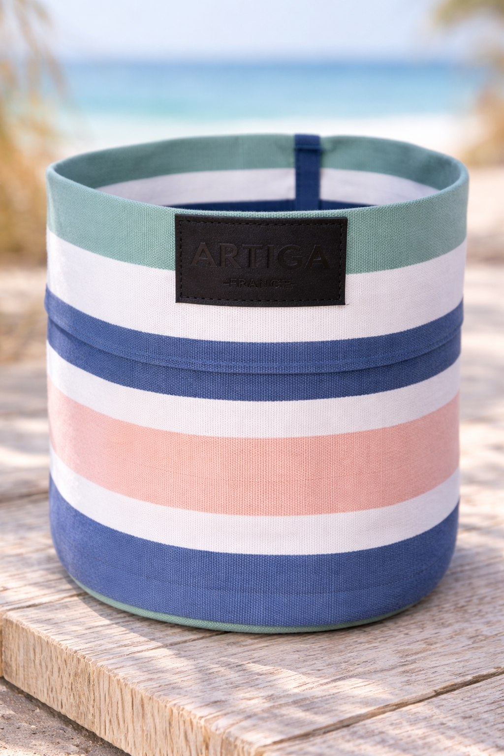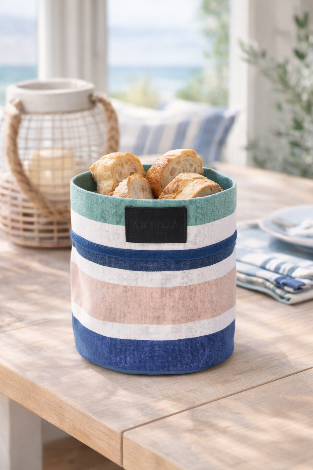 Apportez une touche fraîche et lumineuse à votre intérieur avec cette corbeille en tissu ARTIGA coloris bleu bic, inspirée des rayures iconiques des toiles basques. Son harmonie de bleus et de tons naturels évoque immédiatement l’univers marin et les maisons de bord de mer.