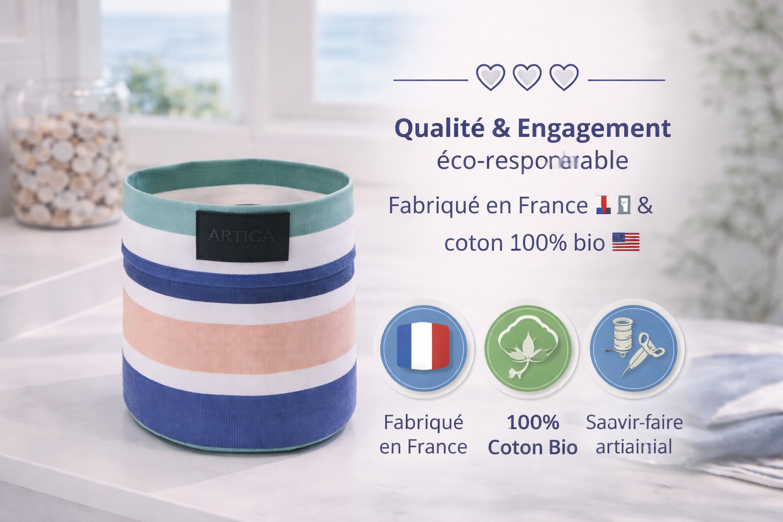 Cette corbeille est entièrement imaginée et confectionnée en France, dans les ateliers ARTIGA situés dans le Sud-Ouest, région reconnue pour son héritage textile.