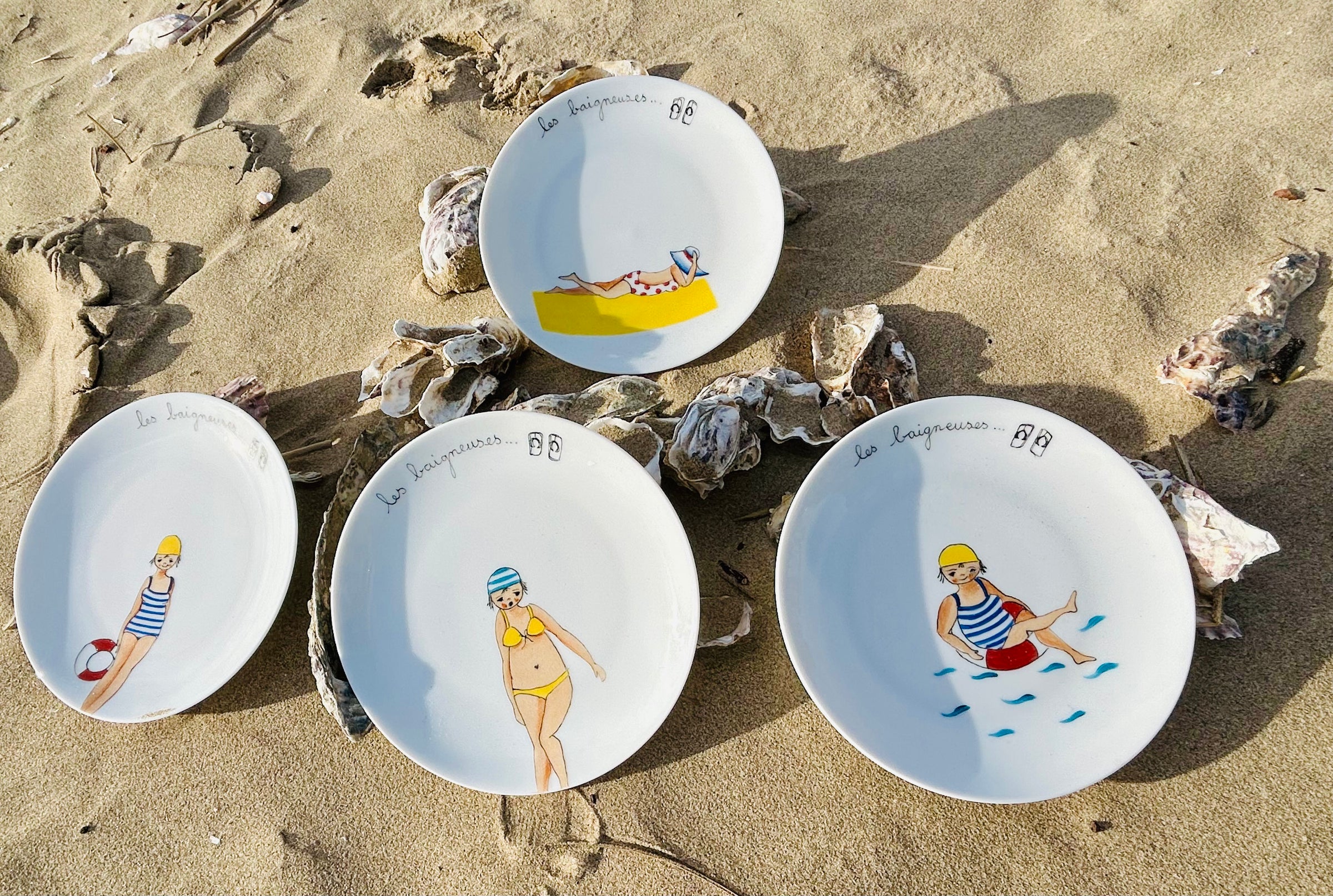 Chaque assiette représente une baigneuse dans une posture différente : lecture au soleil, plongeon, flânerie ou éclats de rire en bord de mer.