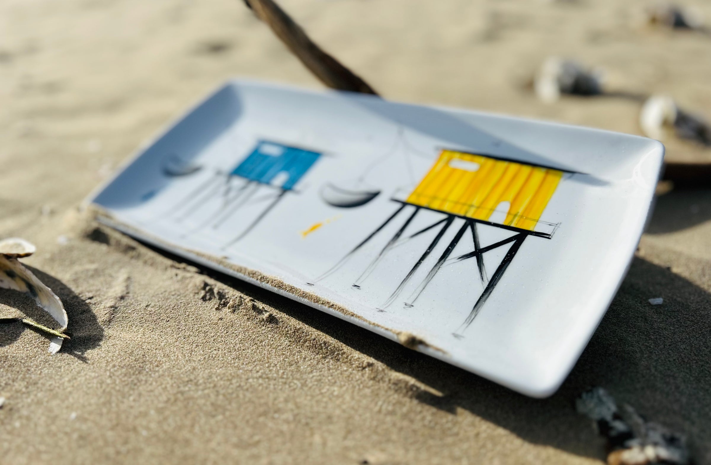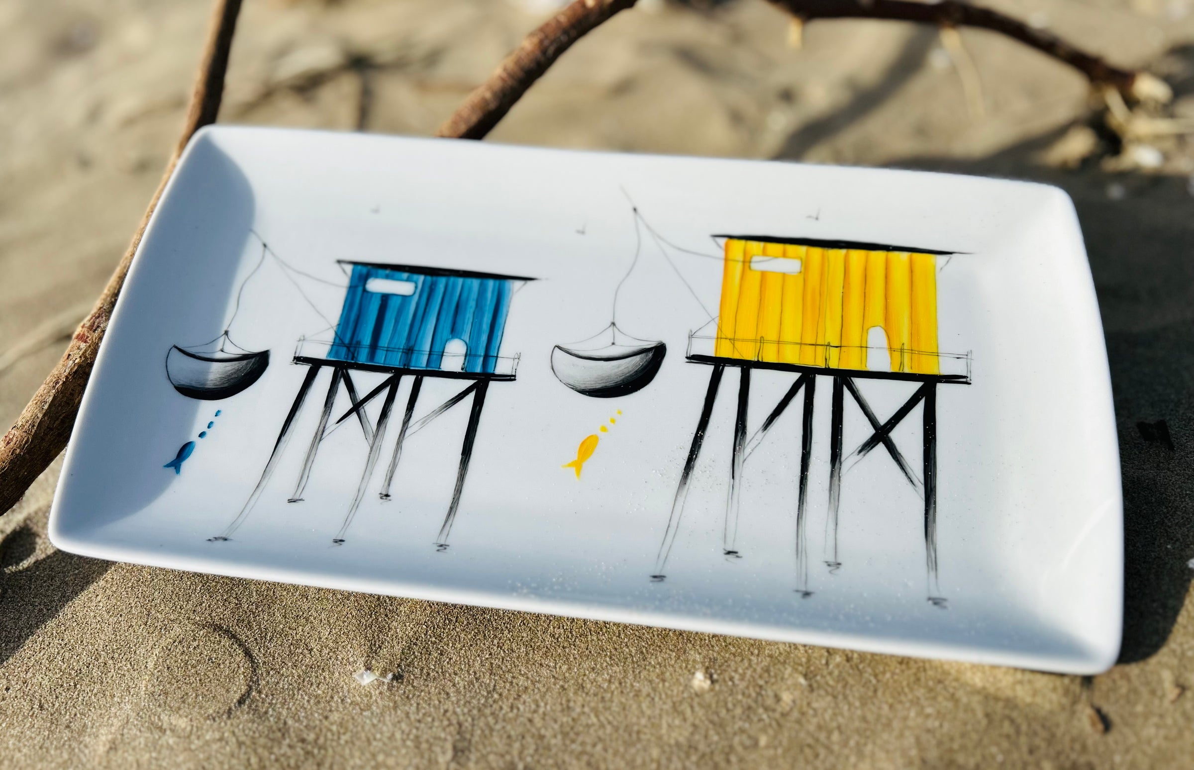 Plongez dans l’univers authentique du littoral charentais avec ce superbe plat en porcelaine artisanal issu de la collection Alibabeth & les 40 couleurs. Entièrement peint à la main, ce modèle met à l’honneur les carrelets, ces emblématiques cabanes de pêche sur pilotis qui rythment les paysages côtiers de l’Atlantique.