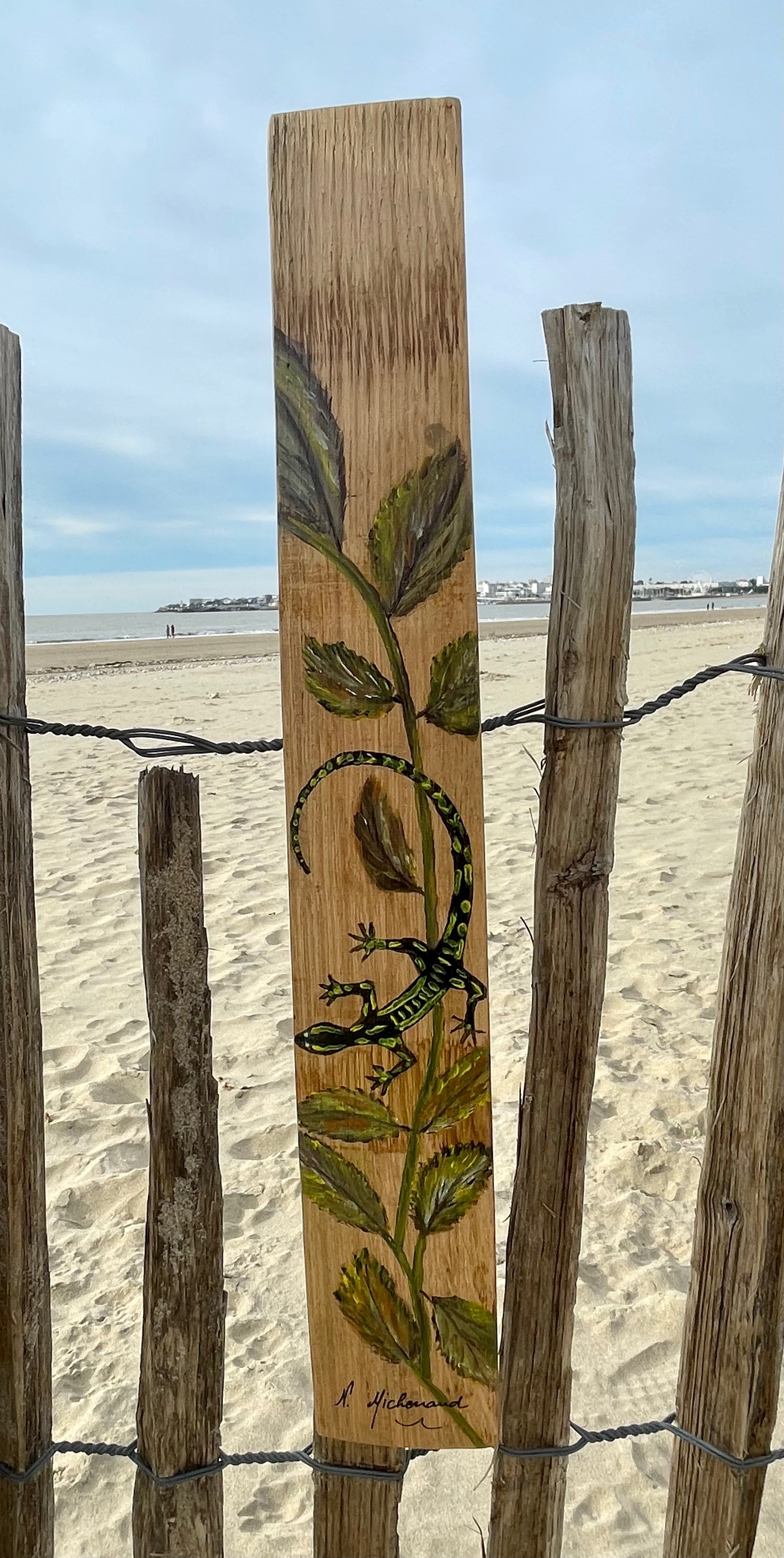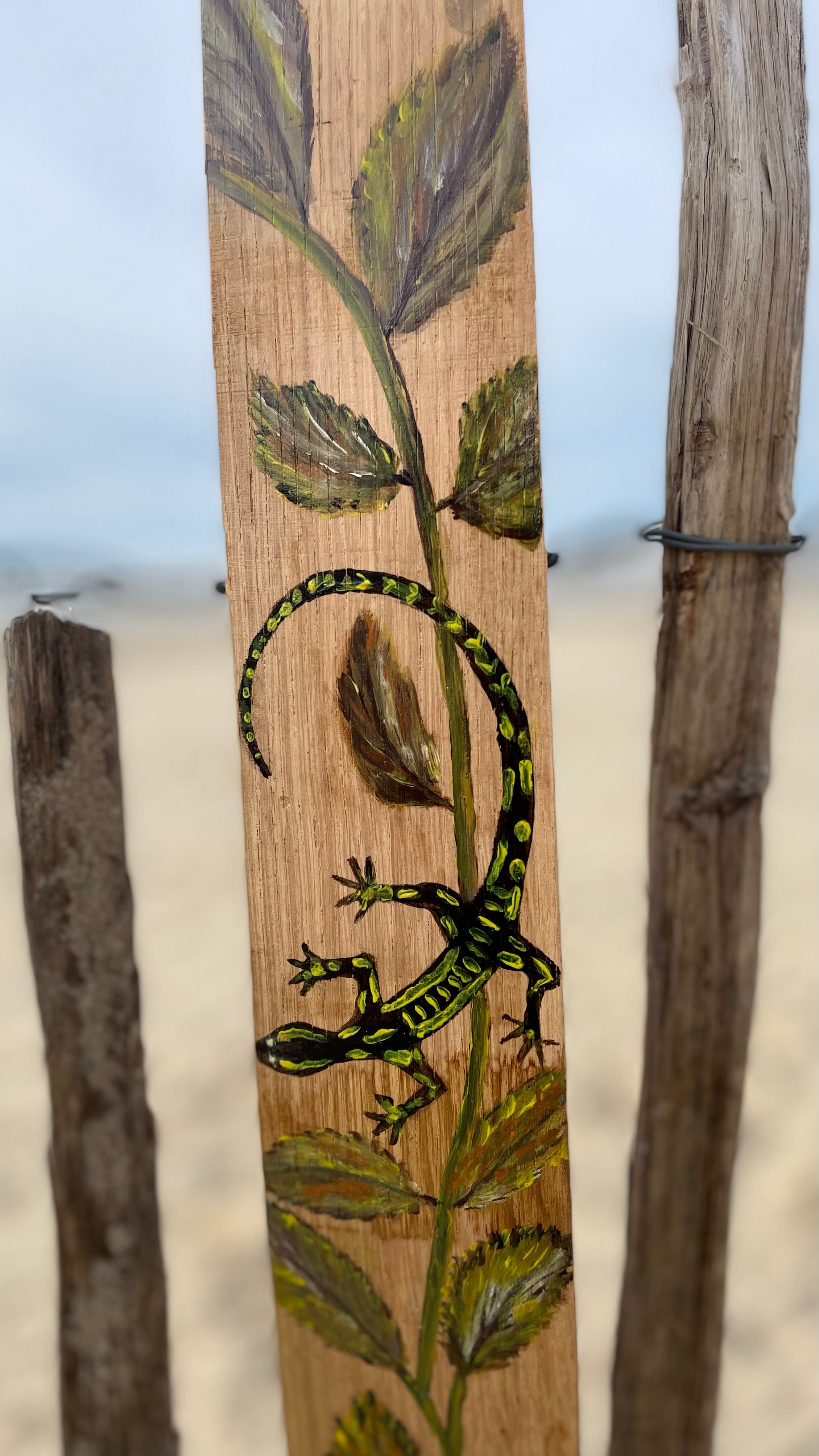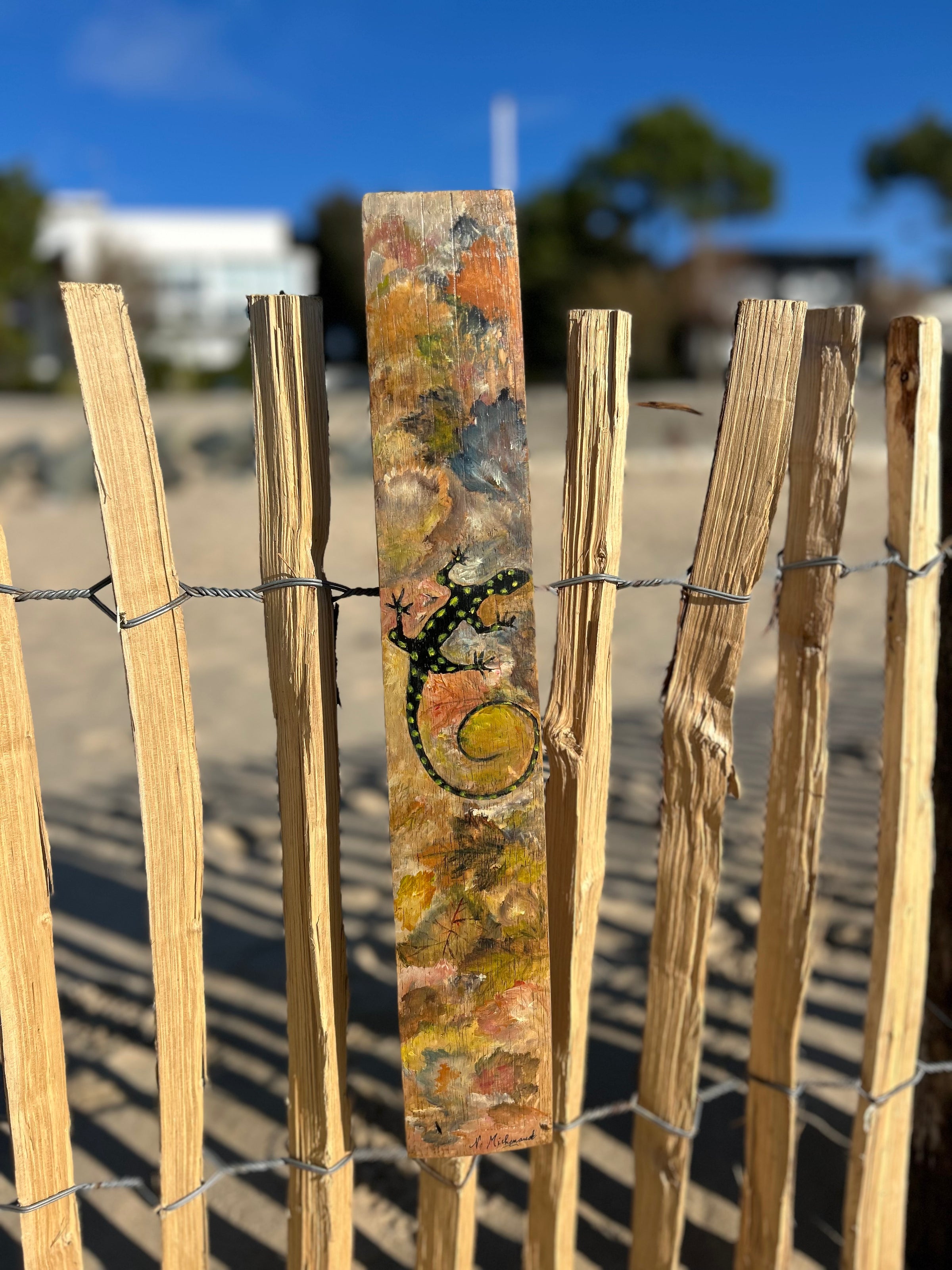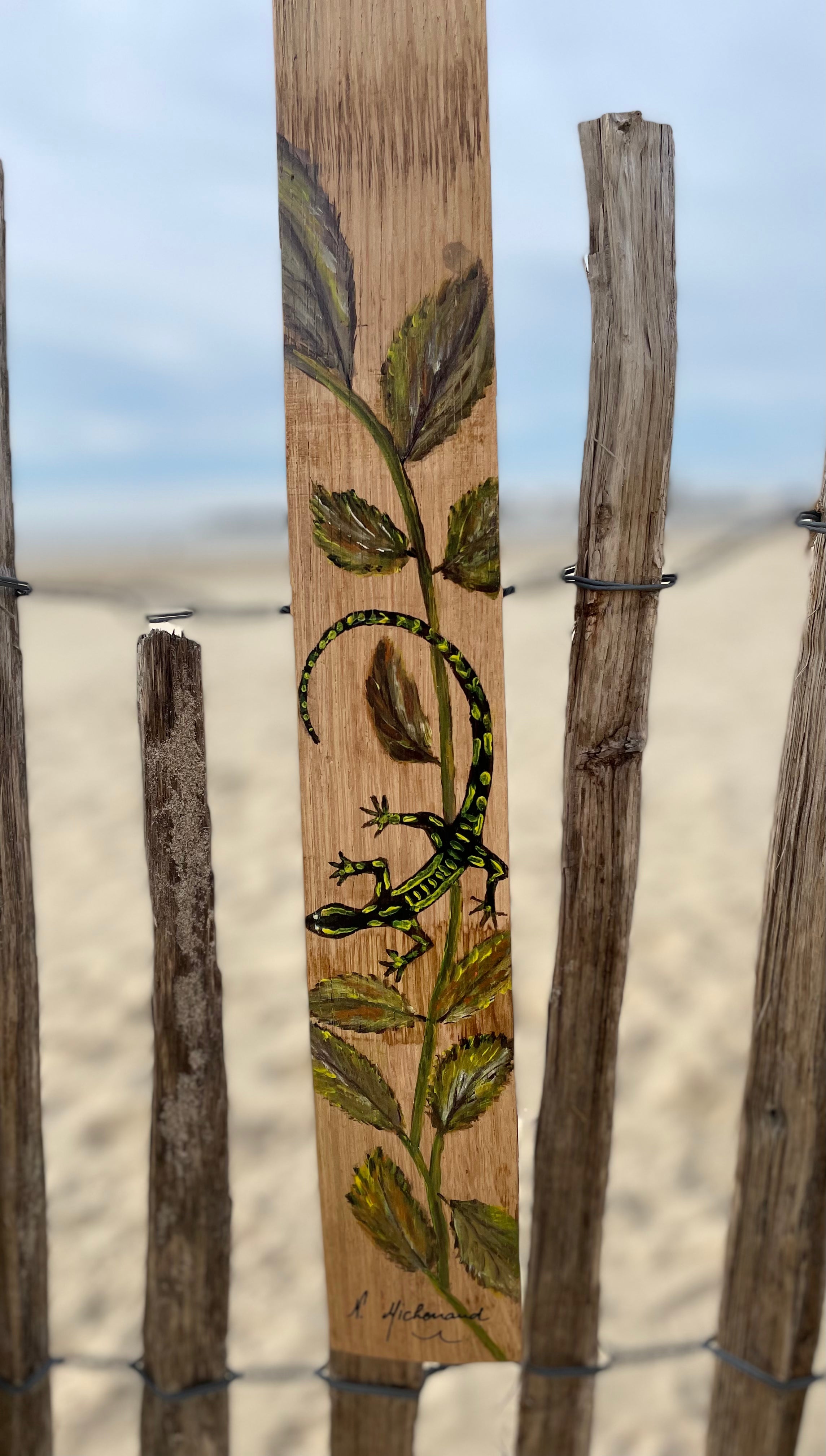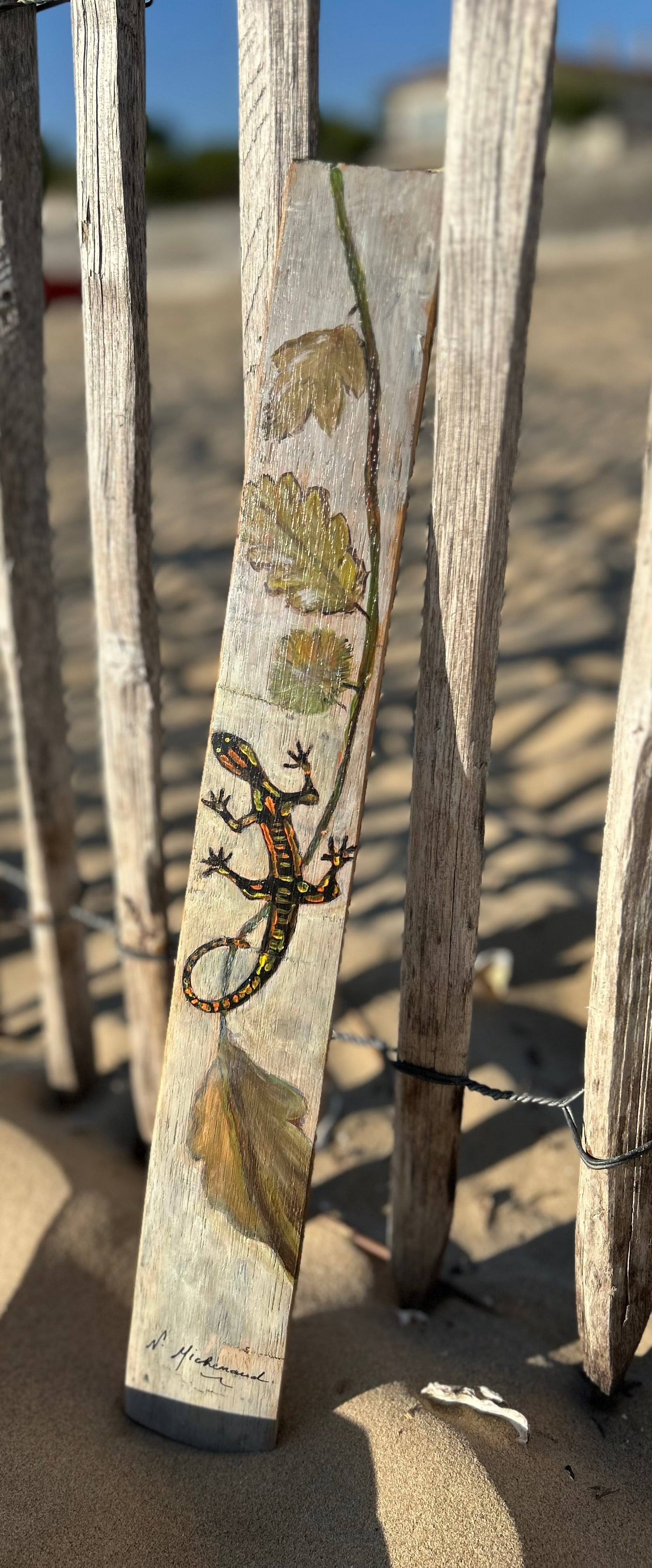 Cette œuvre originale met en scène une salamandre stylisée, peinte à l’acrylique sur une douelle en bois de chêne. Symbole de régénération, de lien à la nature et de force vitale, la salamandre semble ici évoluer librement sur le bois, portée par un jeu de couleurs organiques et texturées.