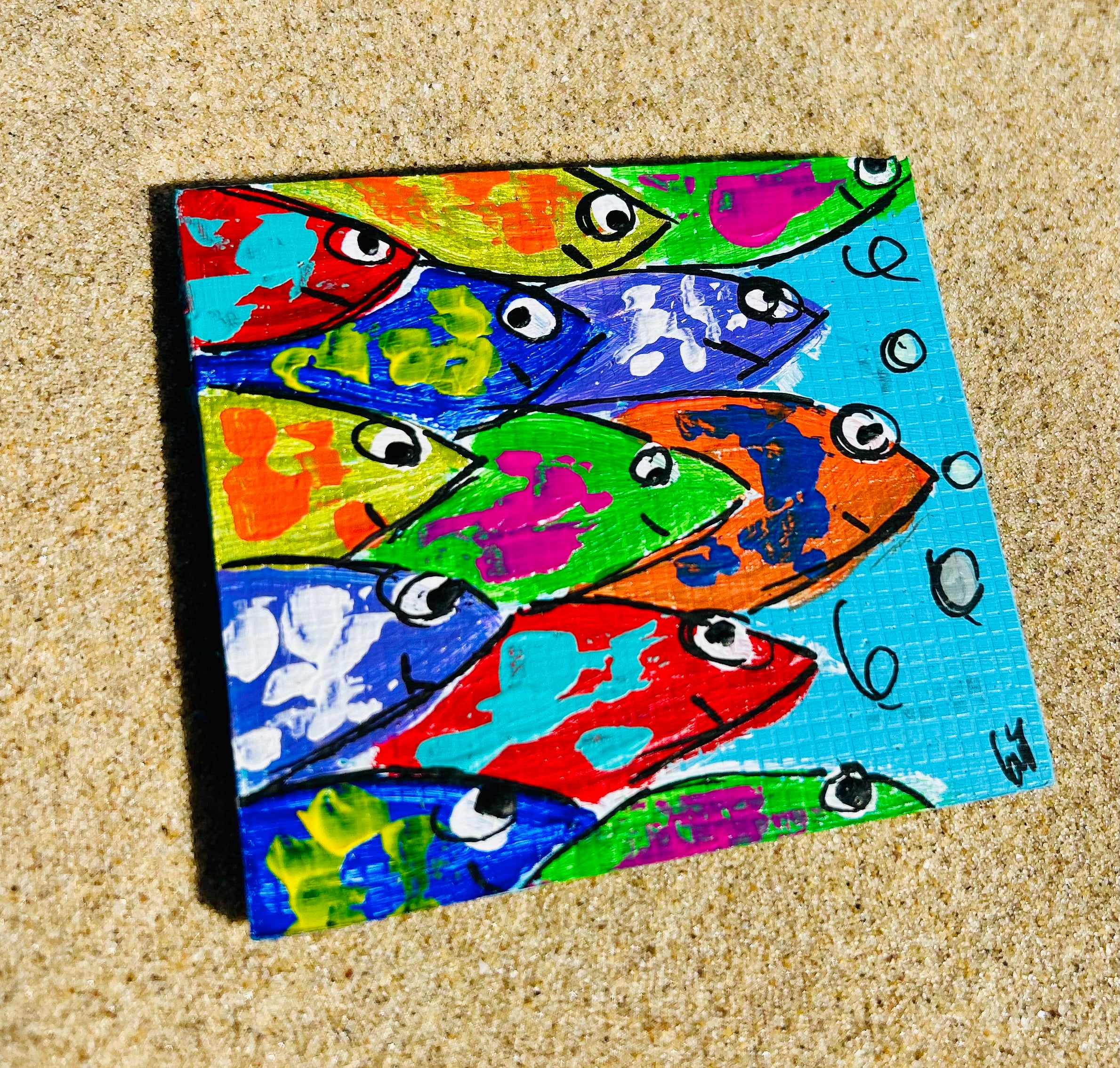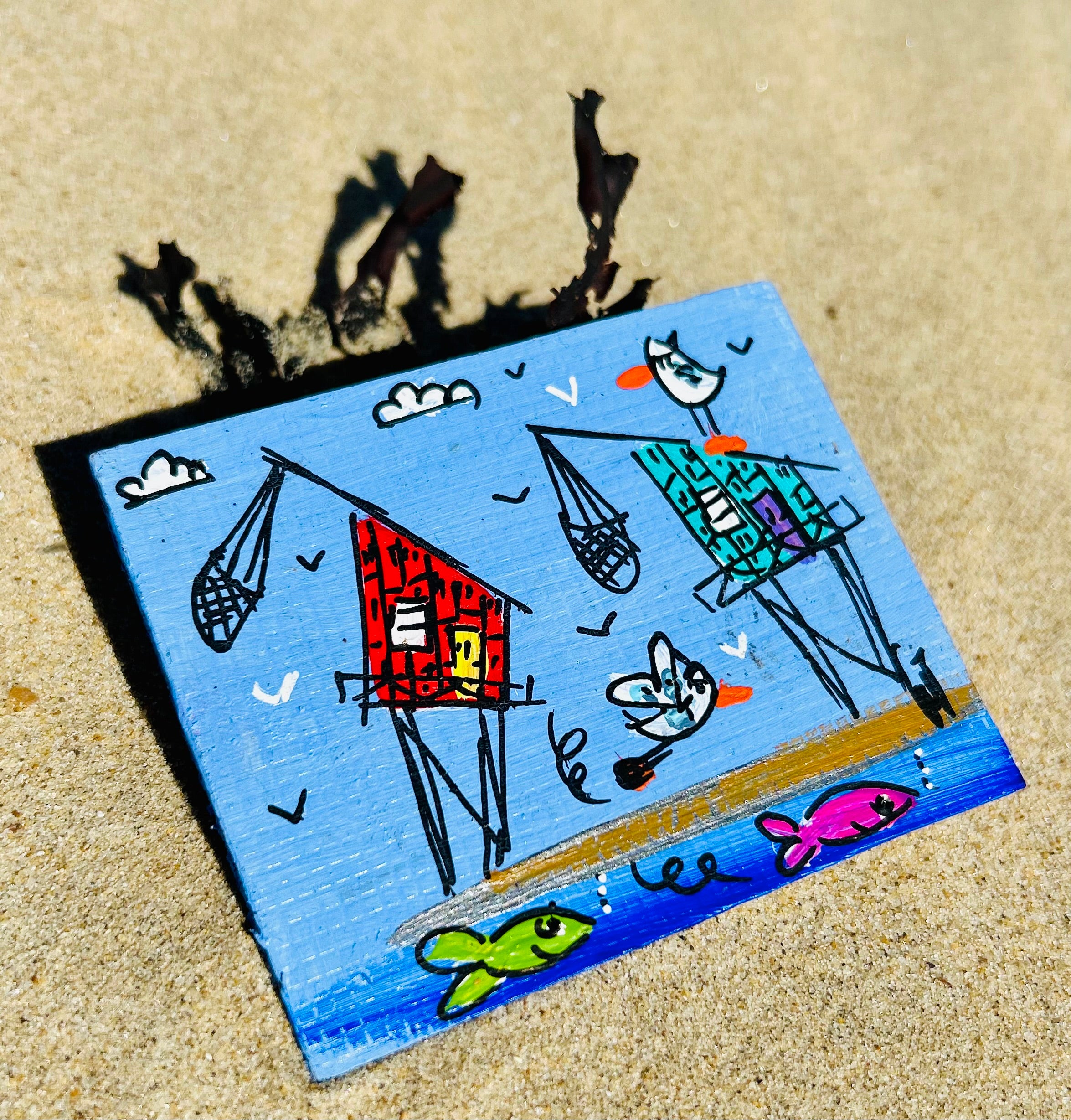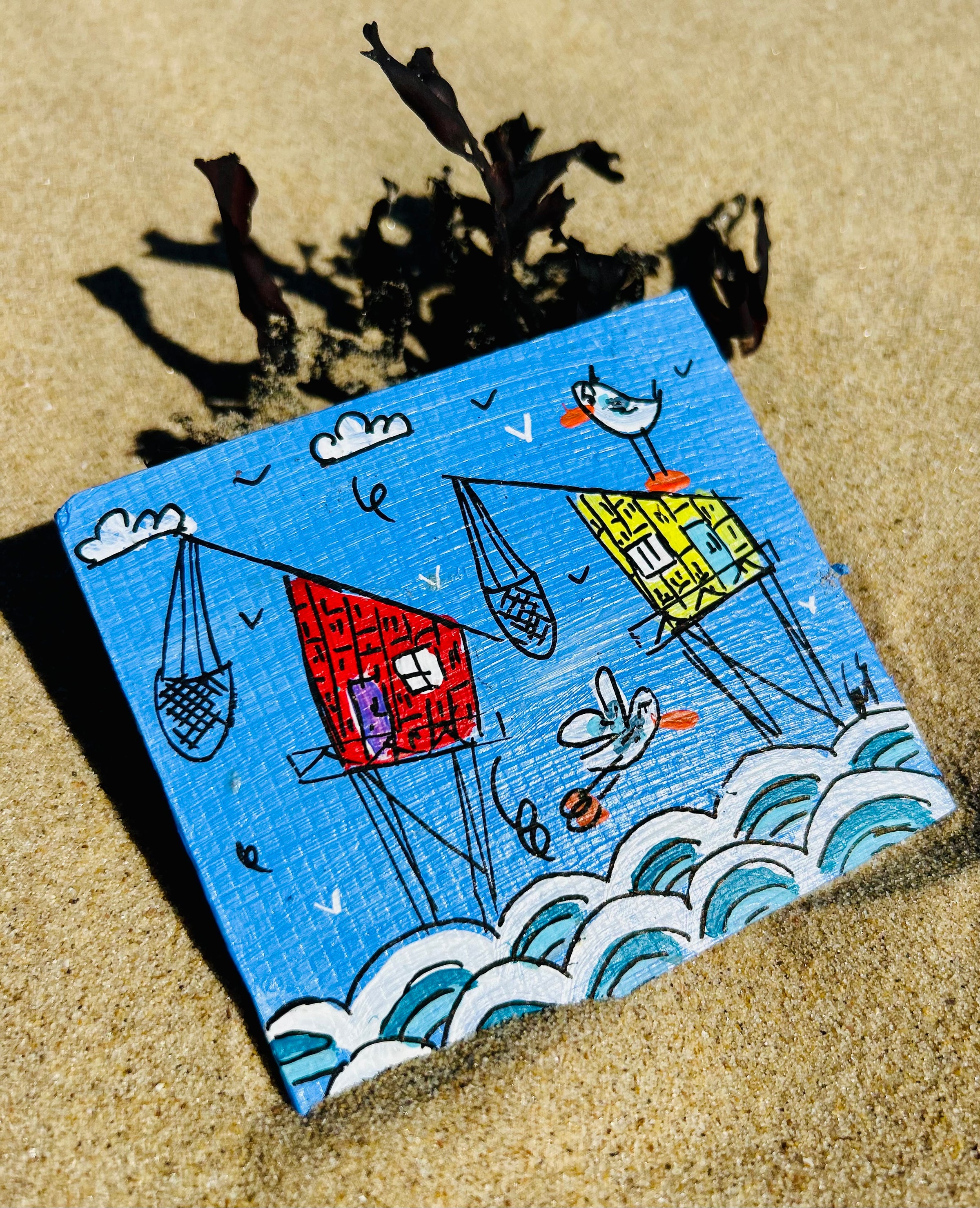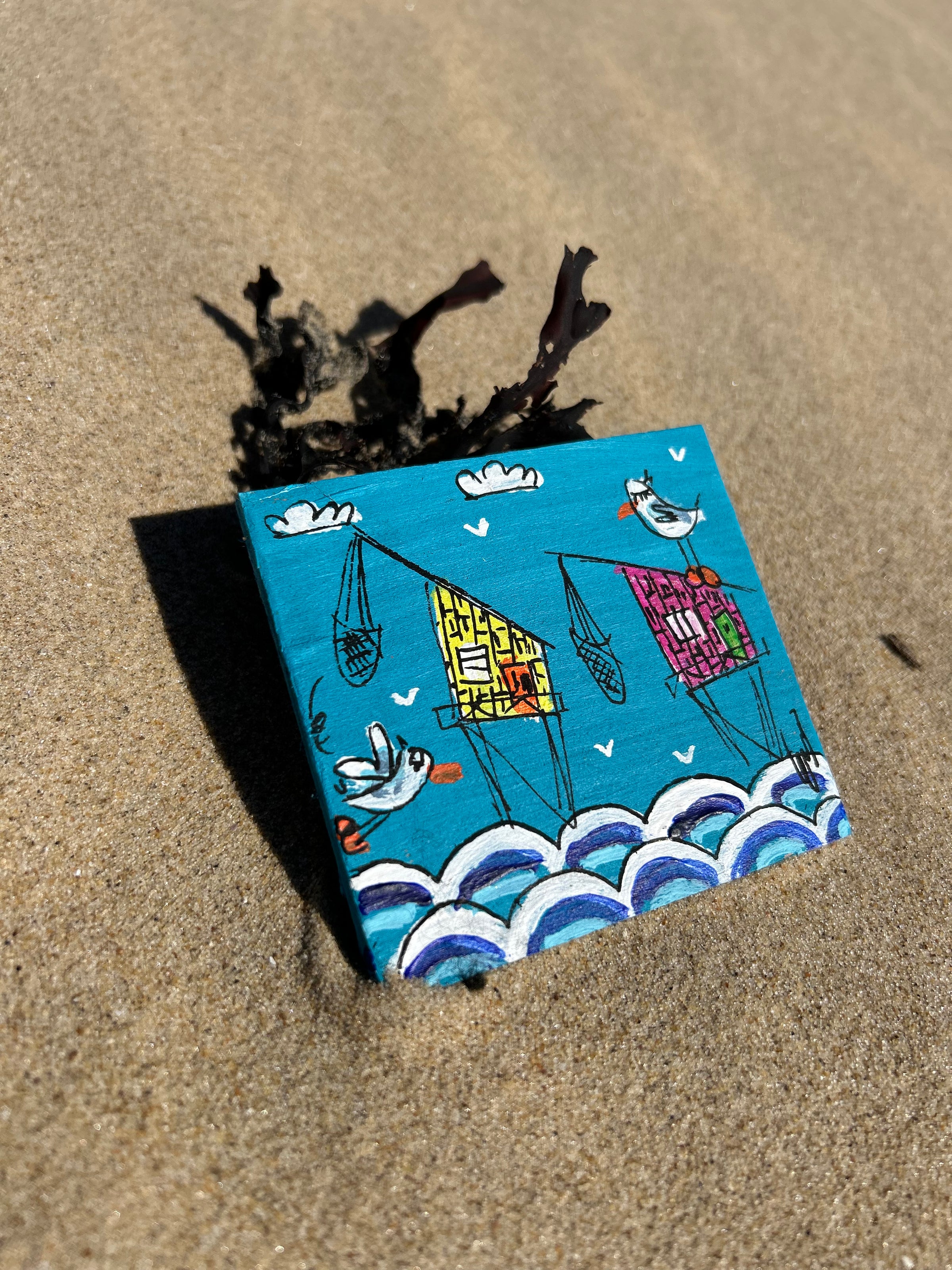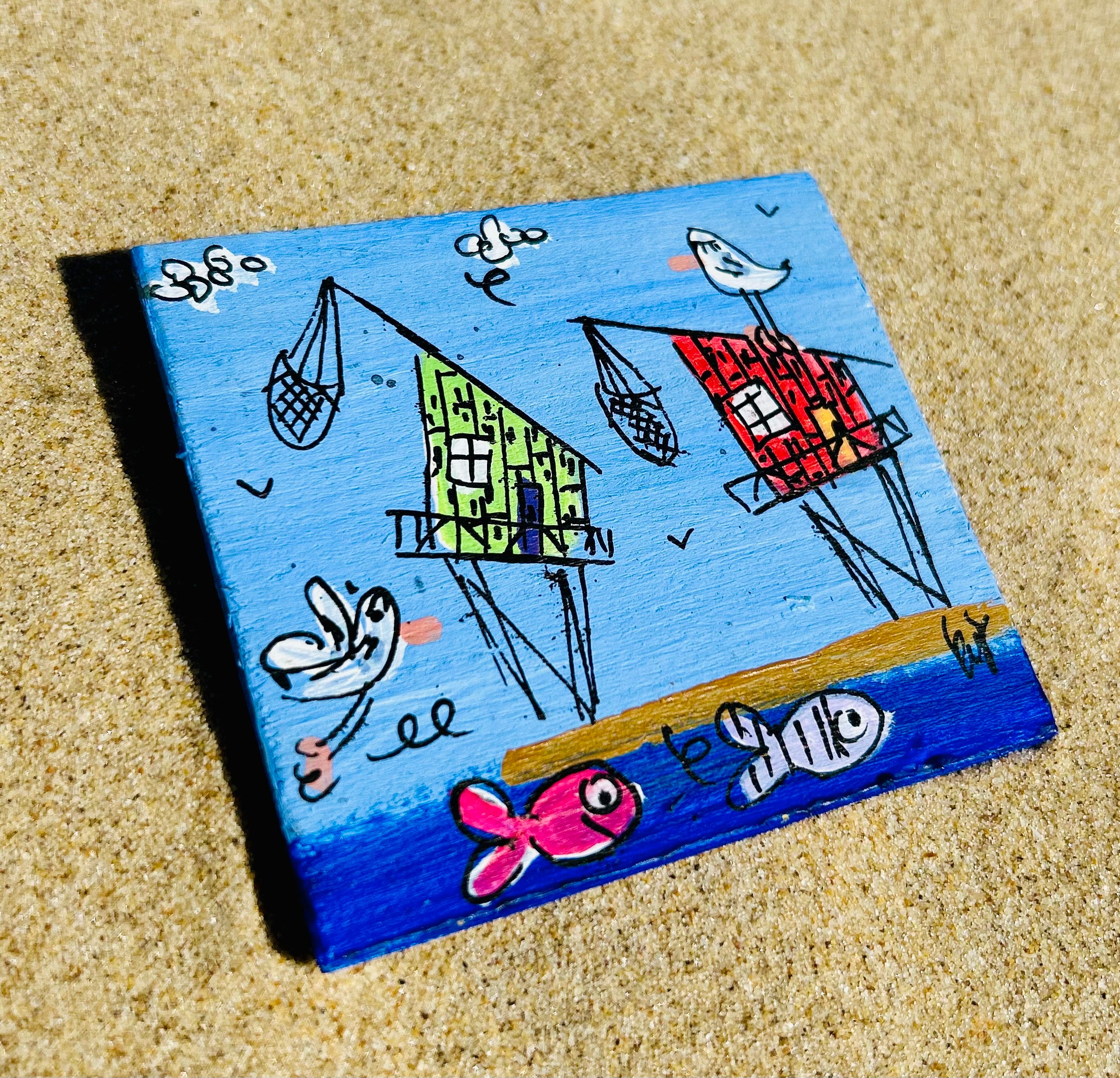 Design fait main : Peintures aux accents naïfs, aux couleurs vives et pleines de bonne humeur.