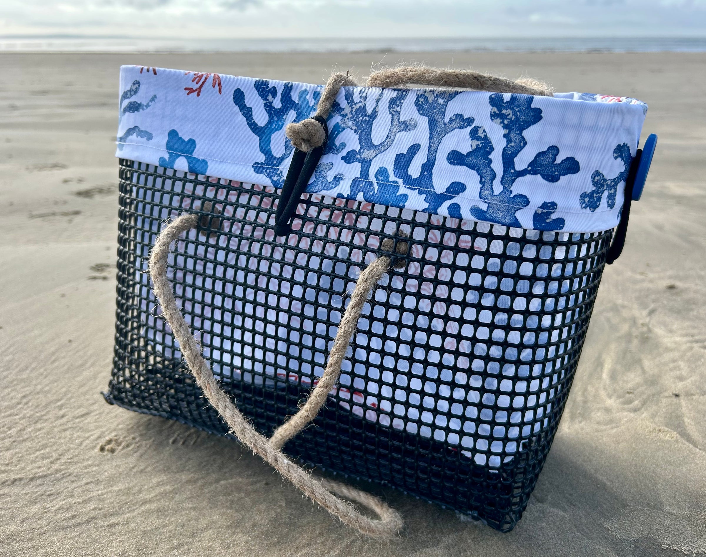 Fabriqué à la main sur la côte atlantique, il associe une structure en poche ostréicole recyclée – solide, légère et respirante – à une housse en tissu déhoussable, aux imprimés évoquant les coraux, les algues ou les nuances bleutées du bord de mer.
