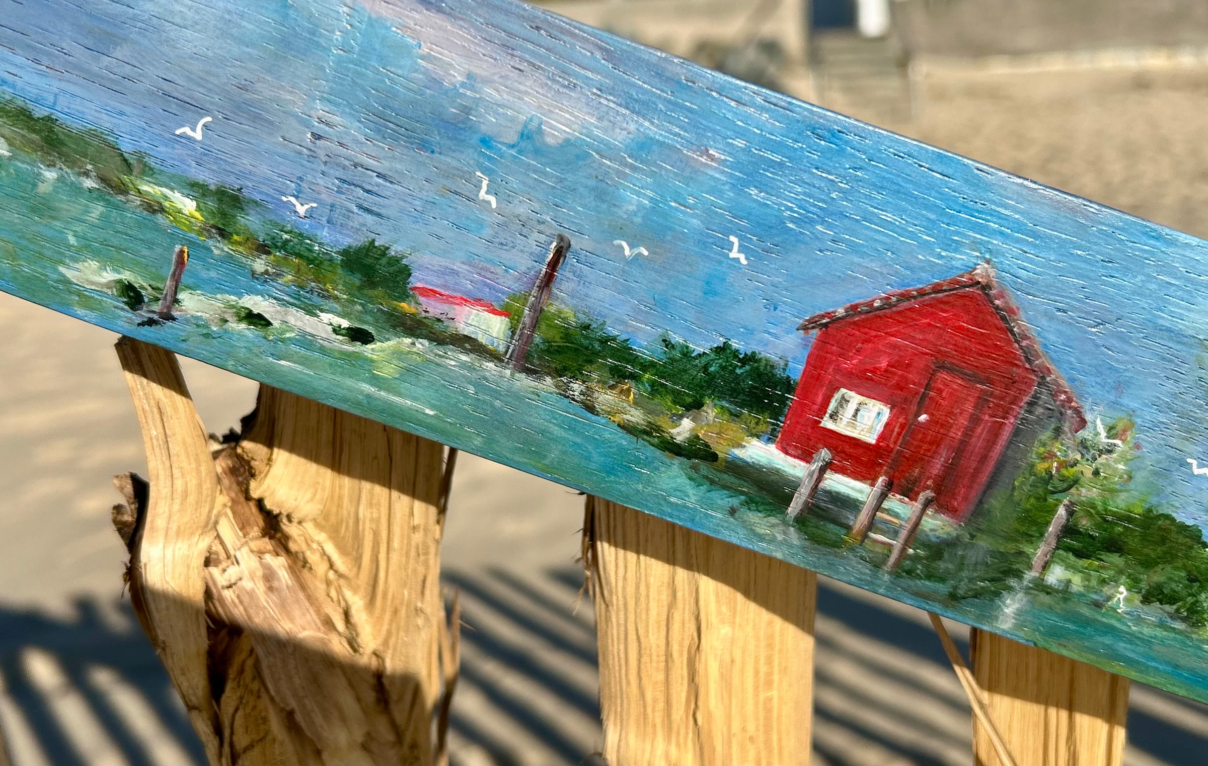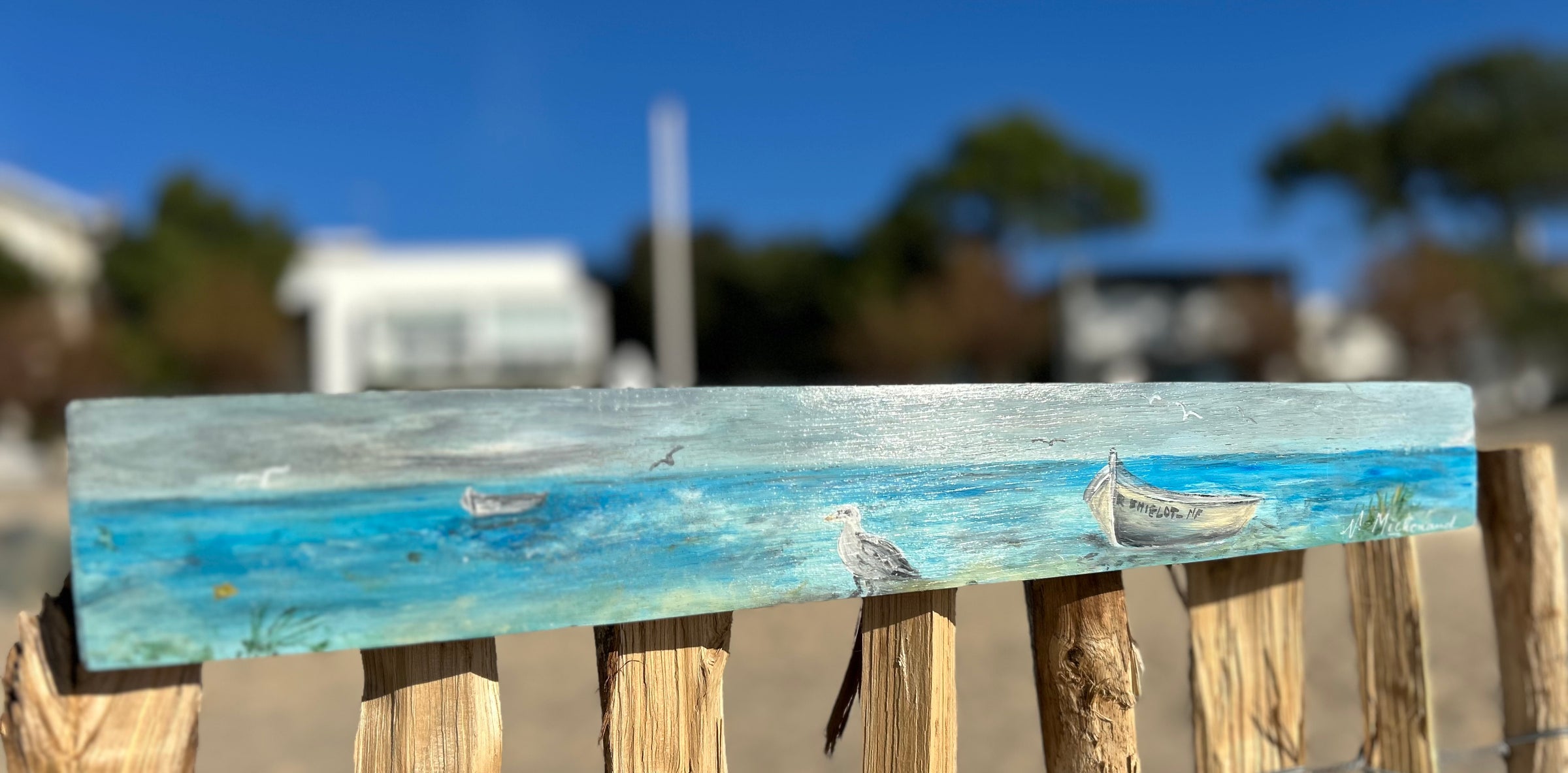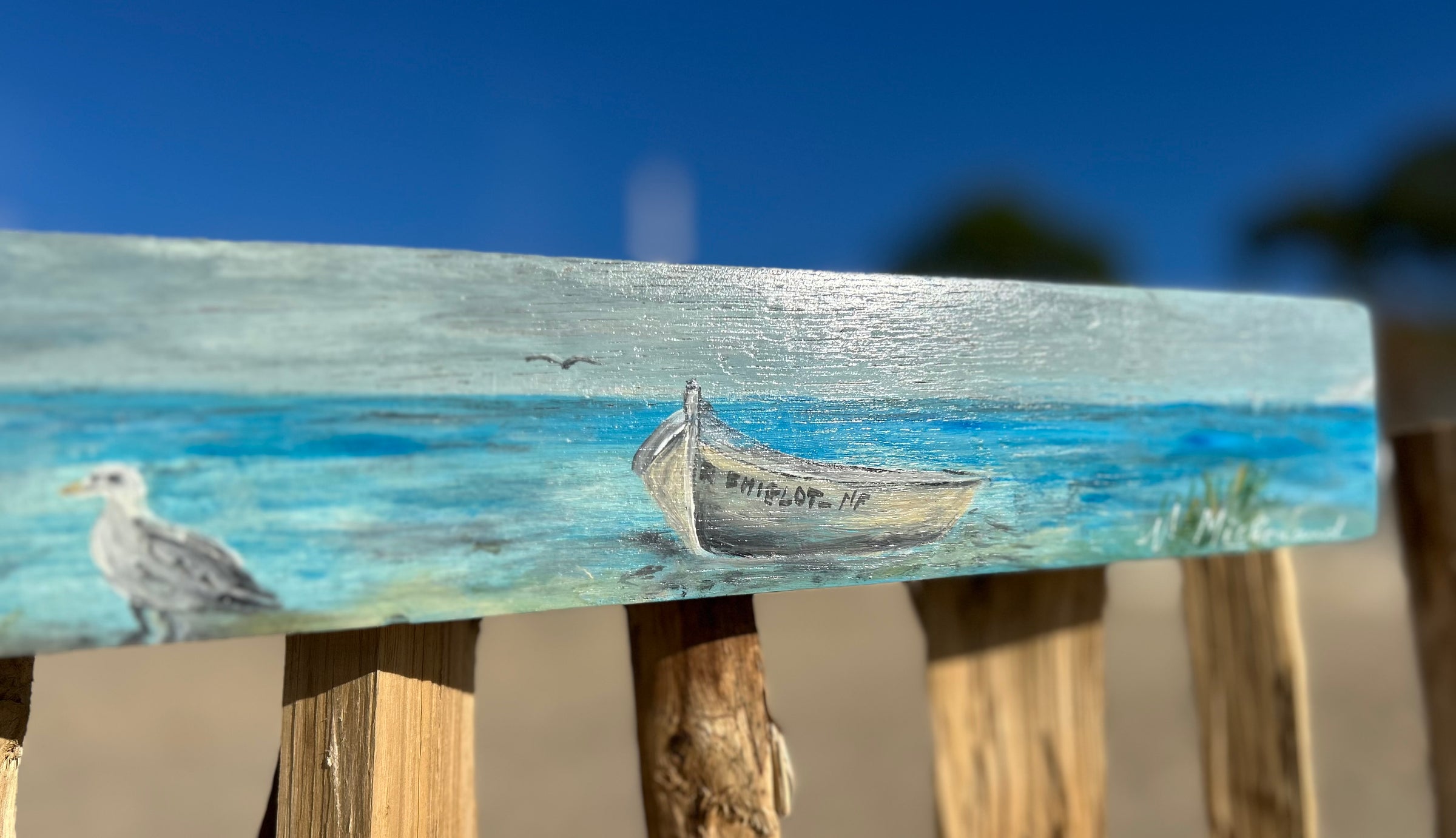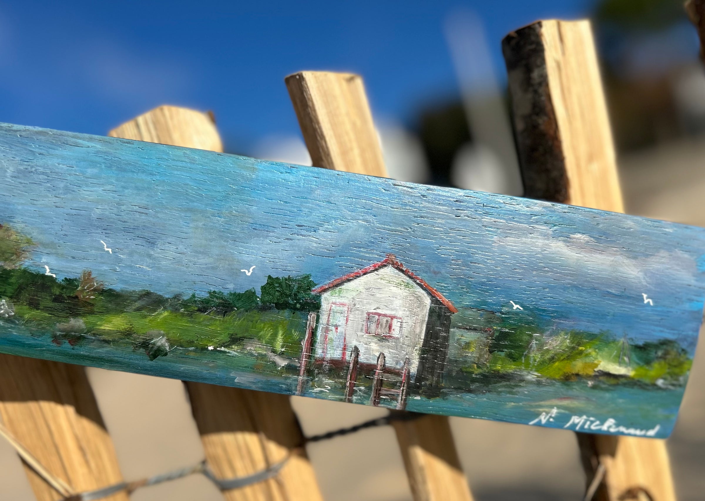Inspirée par le littoral atlantique, l’artiste peintre Nicole Michenaud y retranscrit l’atmosphère paisible et lumineuse des côtes : horizons marins, cabanes de pêcheurs, barques au repos, mouettes et reflets de l’eau. La peinture épouse la matière du bois, mettant en valeur ses irrégularités naturelles et renforçant l’authenticité de chaque création.
