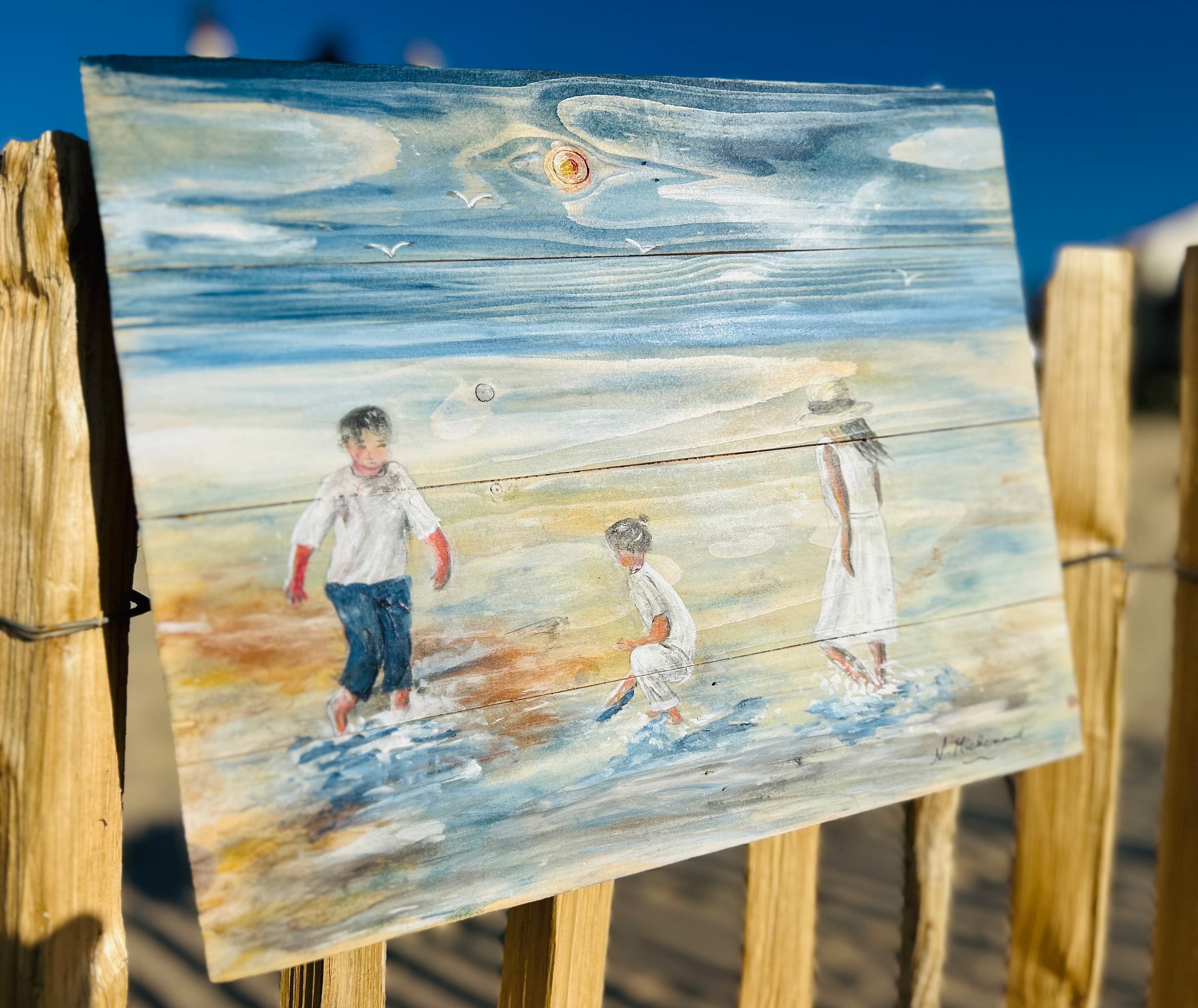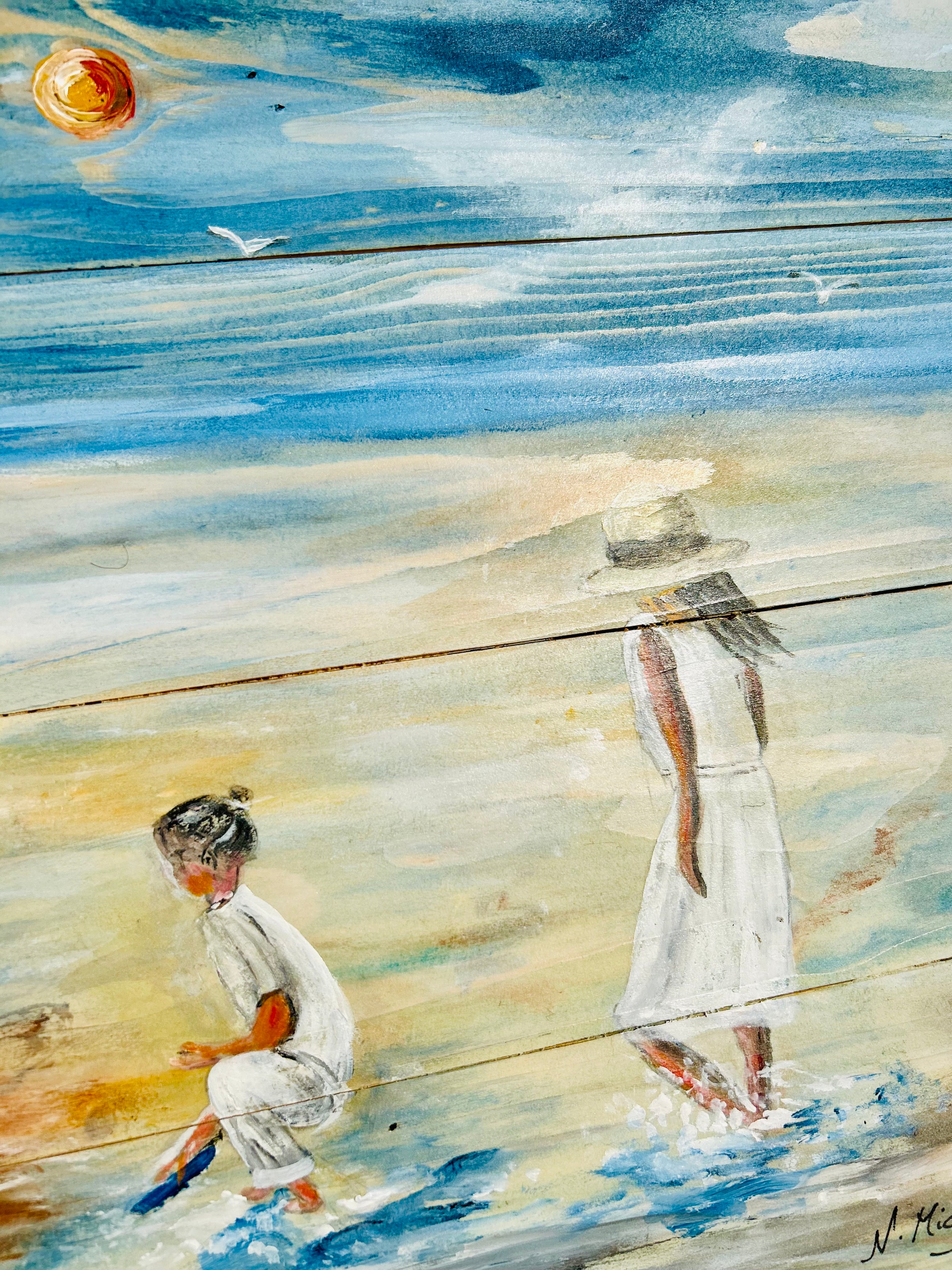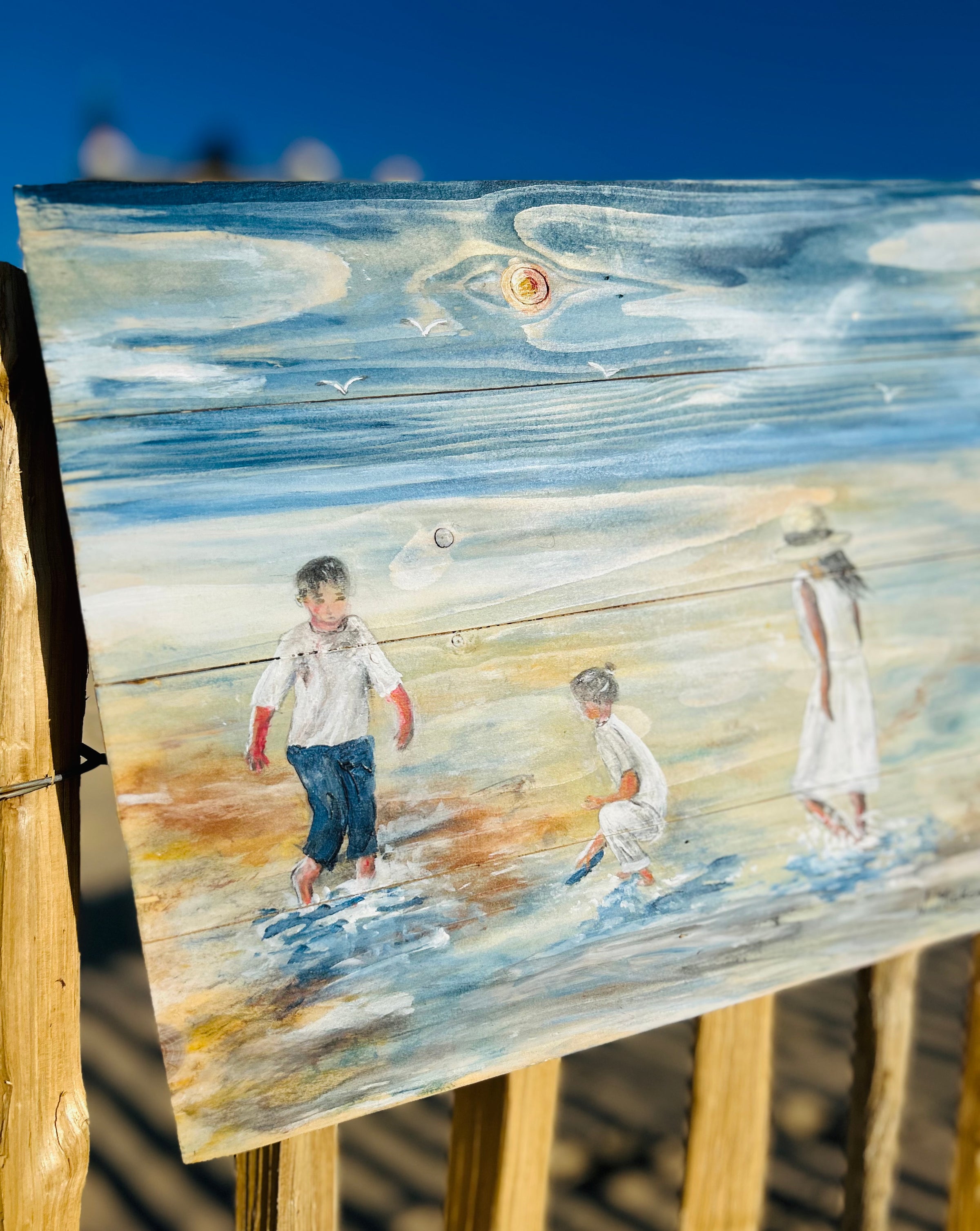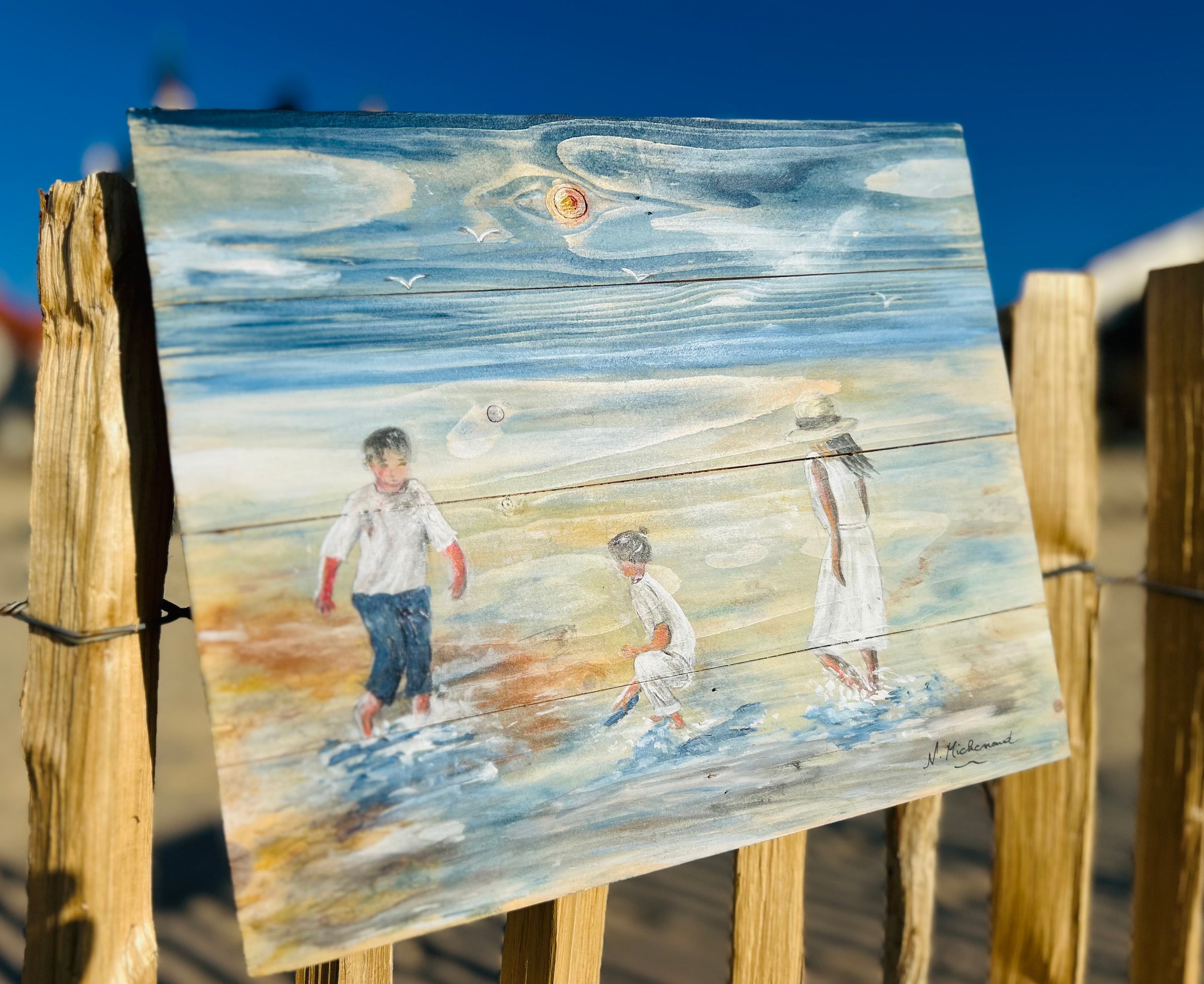 Cette œuvre originale est une peinture acrylique réalisée à la main sur des planches de bois de palette, support brut et authentique qui apporte relief et caractère à la composition. L’artiste peintre Nicole Michenaud y capture un instant de vie au bord de l’océan : des enfants jouant dans l’eau, baignés de lumière, dans une atmosphère douce et intemporelle.