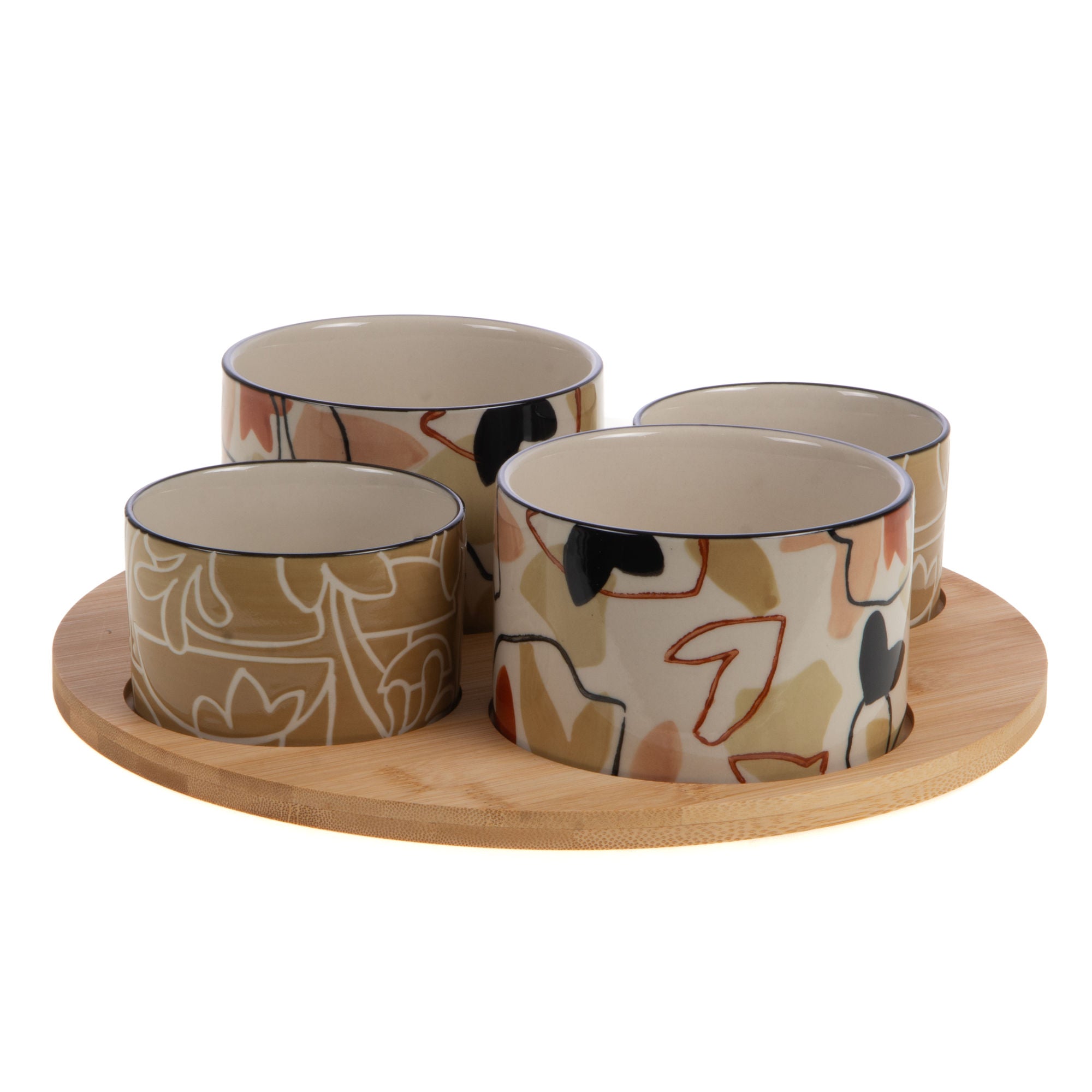 🎨 Composition : 1 plateau rond en bois + 4 bols en grès décorés