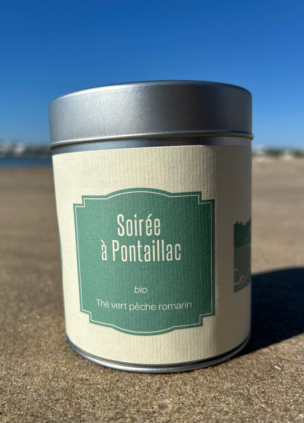 🌅 Thé vert bio « Soirée à Pontaillac » en boîte – Pêche & Romarin