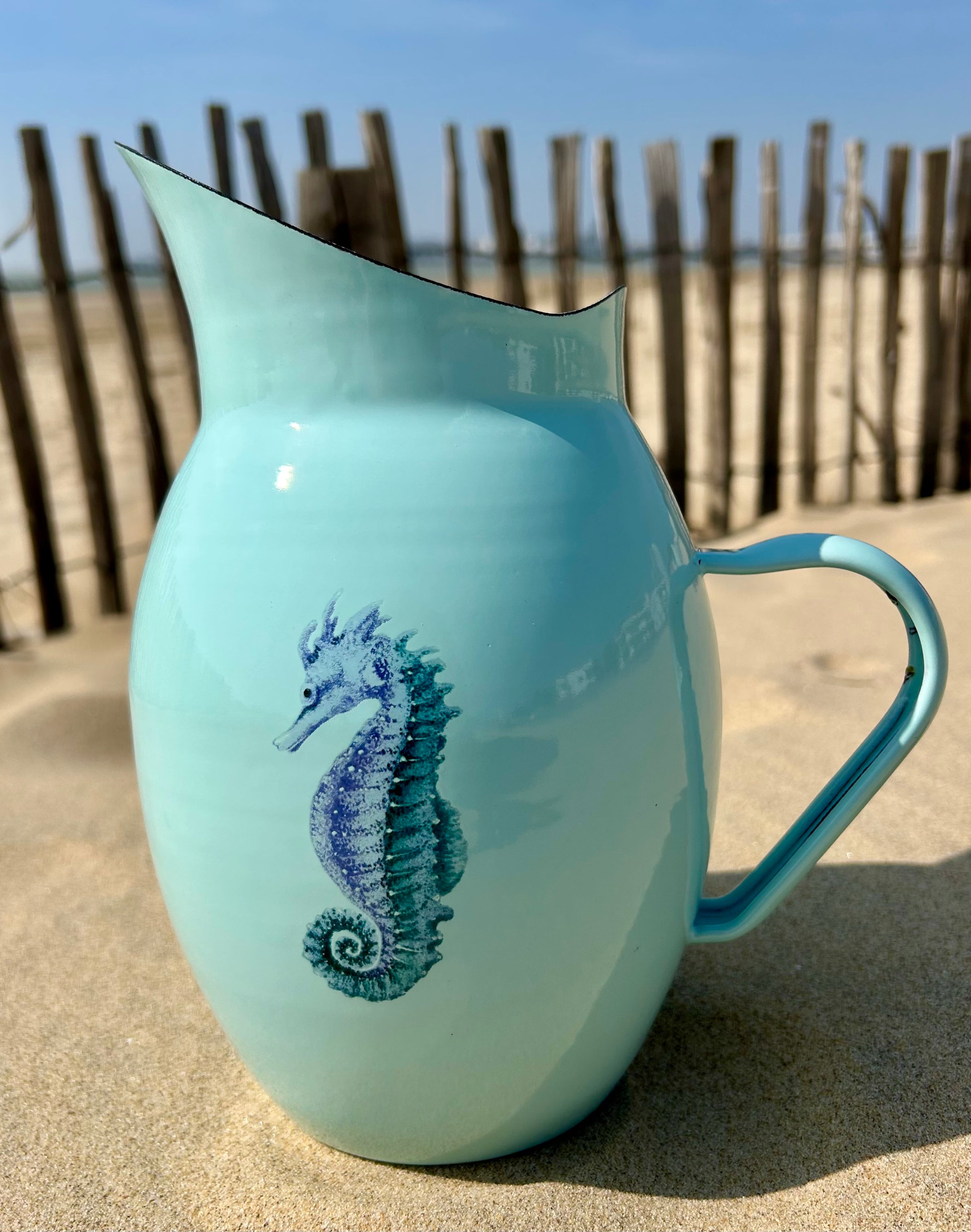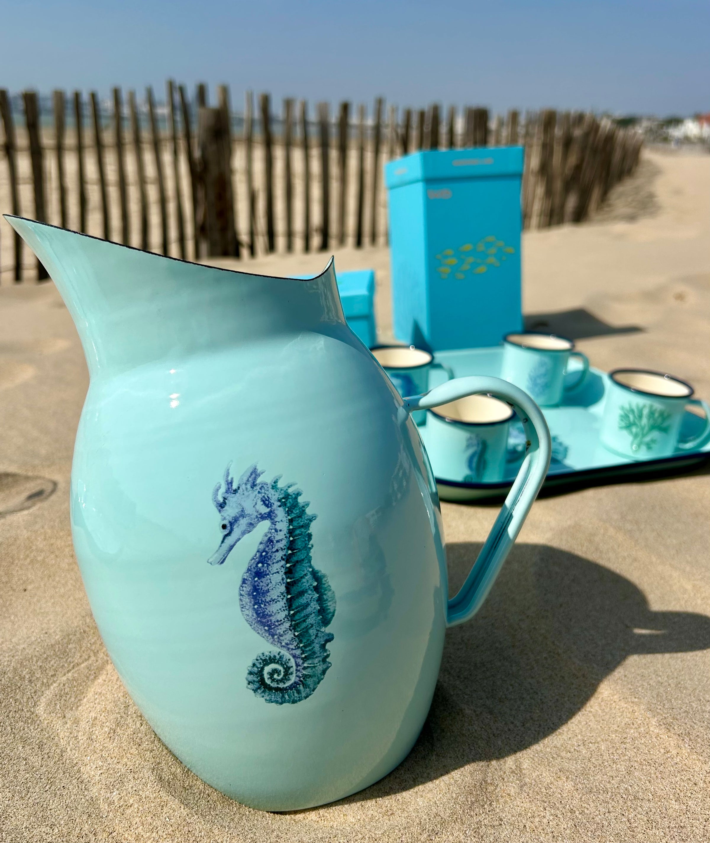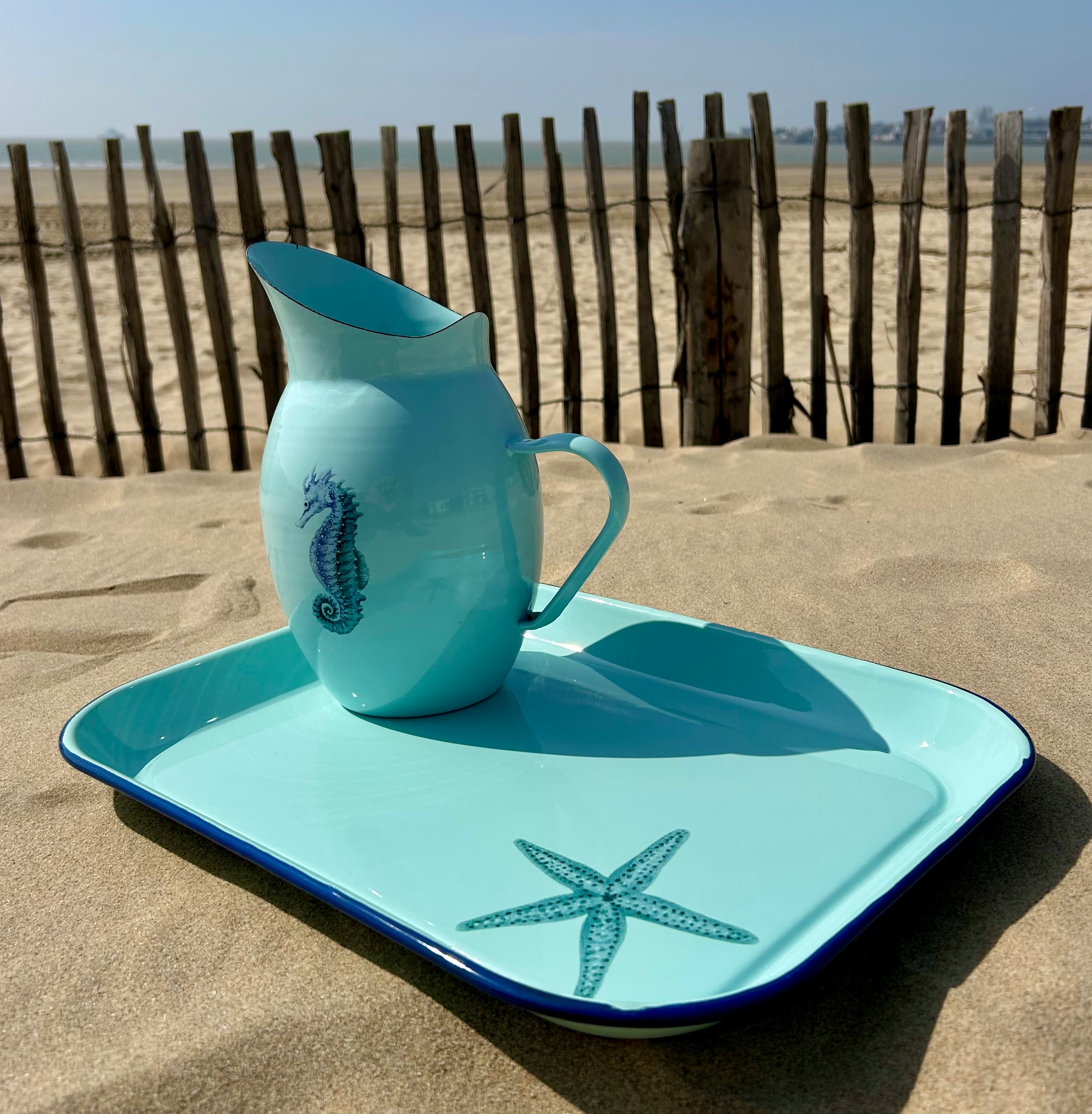 Apportez une touche élégante et iodée à votre table avec cette carafe en tôle émaillée au délicat motif hippocampe. À la fois pratique et décorative, elle s’intègre parfaitement dans un univers bord de mer, pour vos repas en intérieur comme en extérieur.