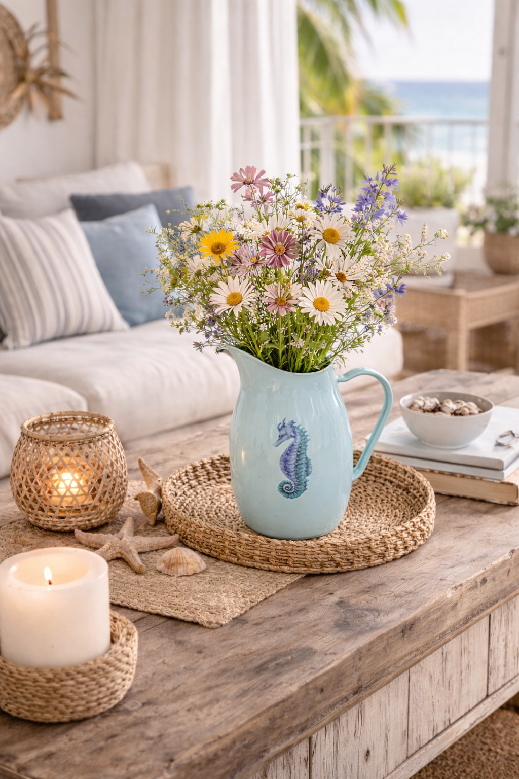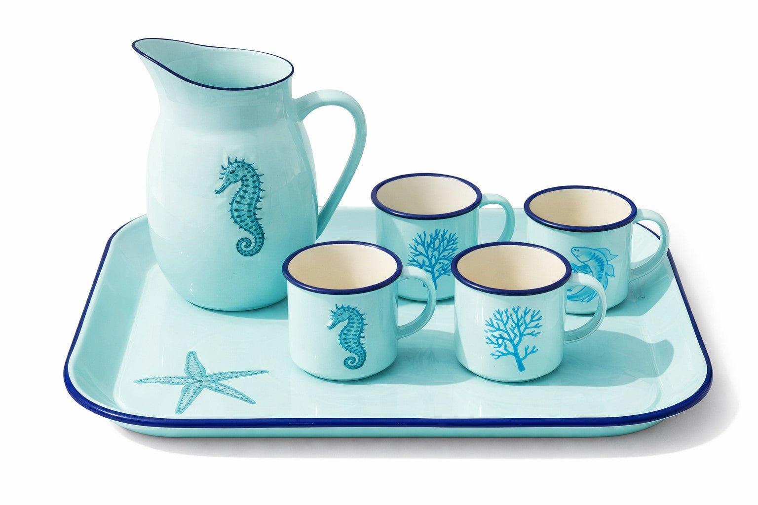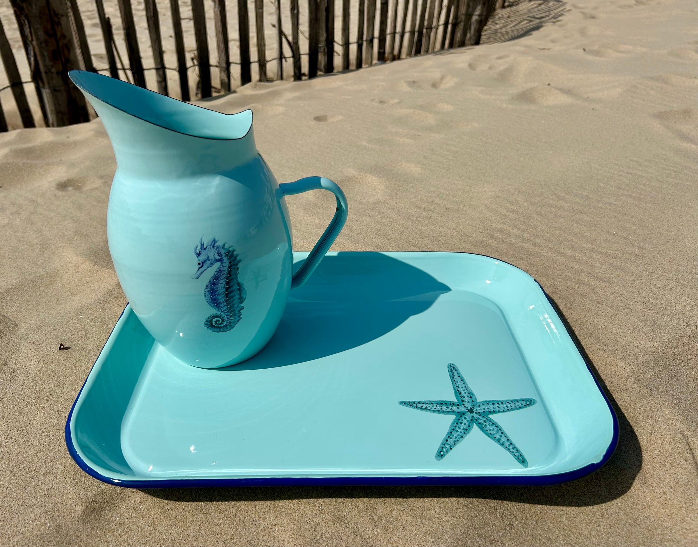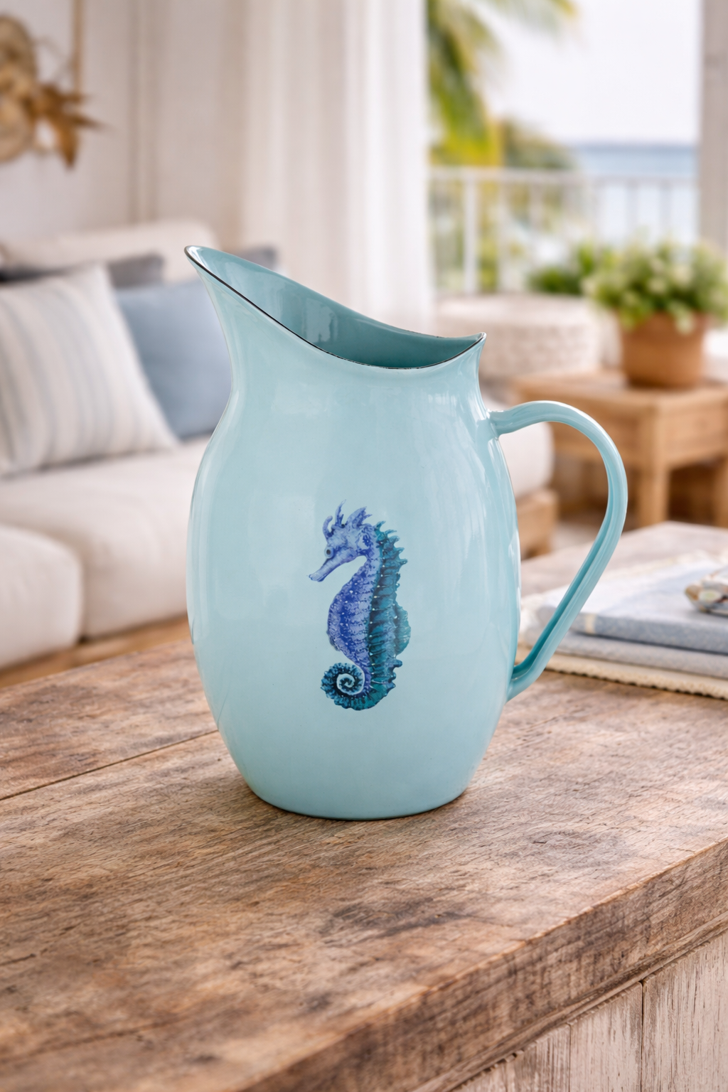 Apportez une touche élégante et iodée à votre table avec cette carafe en tôle émaillée au délicat motif hippocampe. À la fois pratique et décorative, elle s’intègre parfaitement dans un univers bord de mer, pour vos repas en intérieur comme en extérieur.