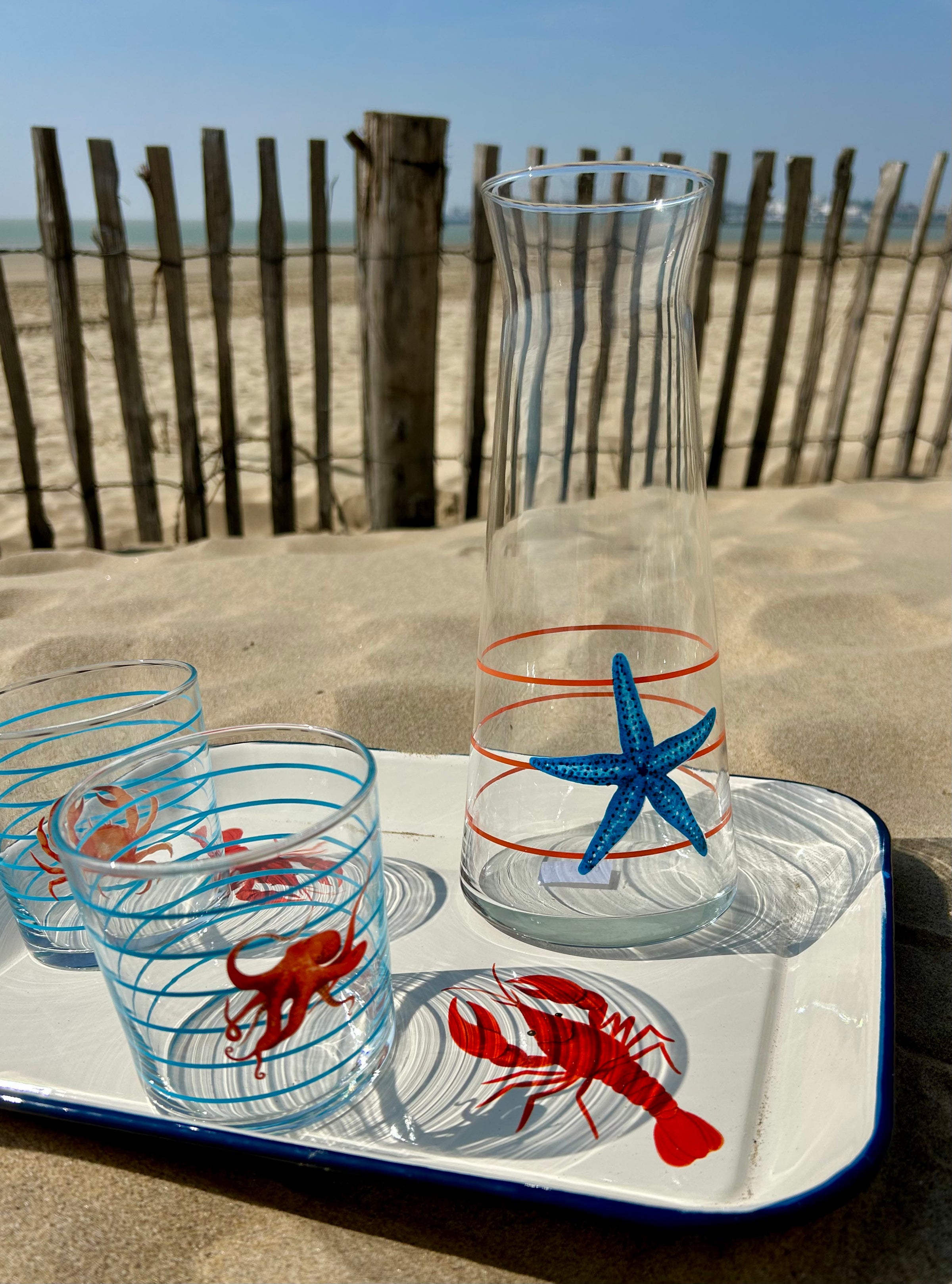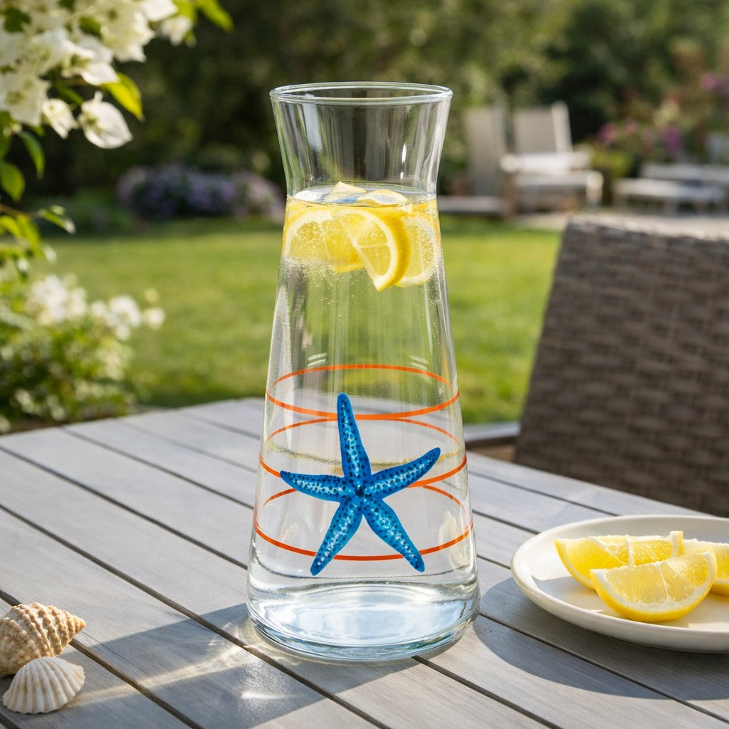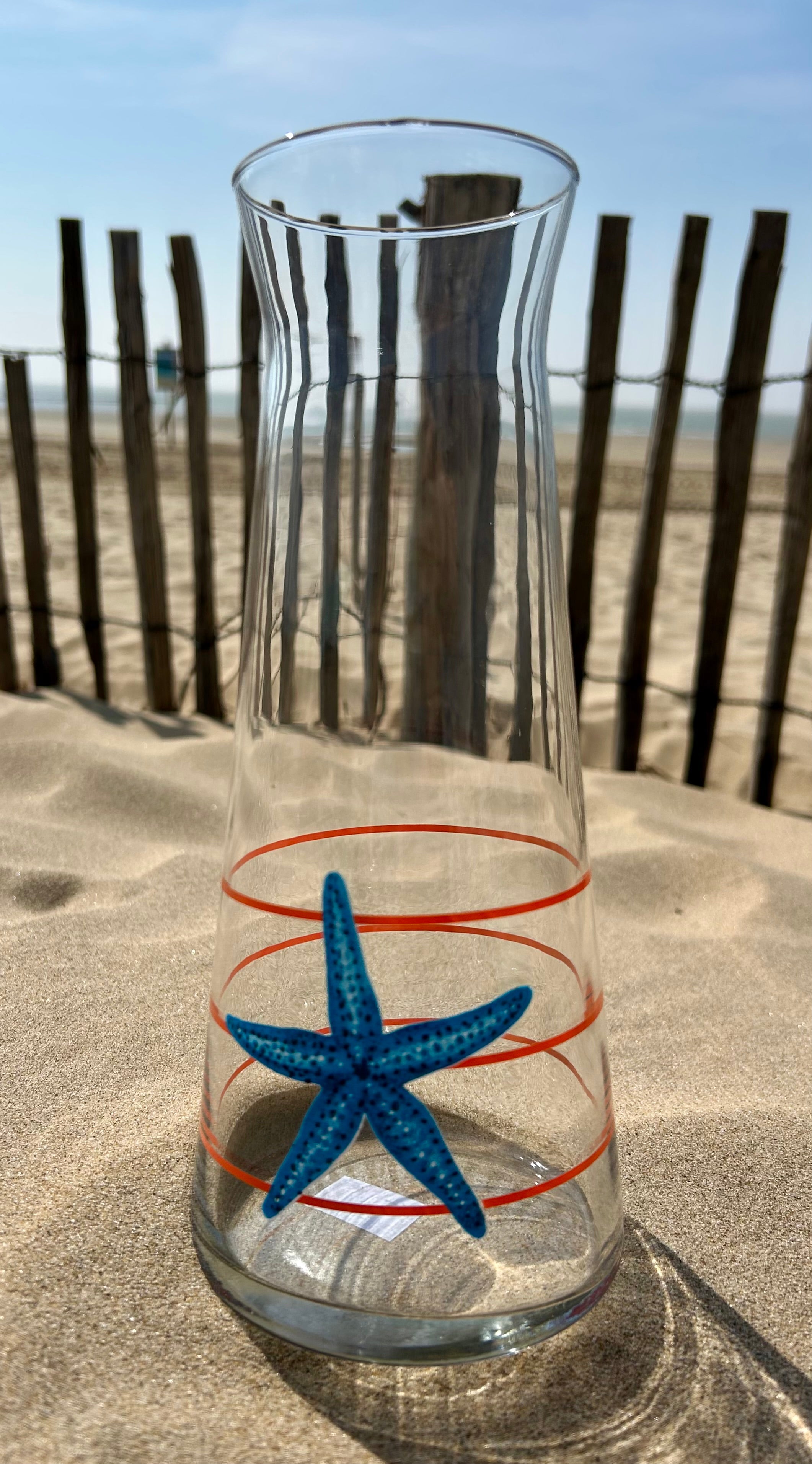Apportez une touche fraîche et estivale à votre table avec cette carafe en verre décorée d’une étoile de mer bleue. Son design épuré sublimé par des rayures rouges délicates évoque instantanément l’ambiance des vacances au bord de l’océan.