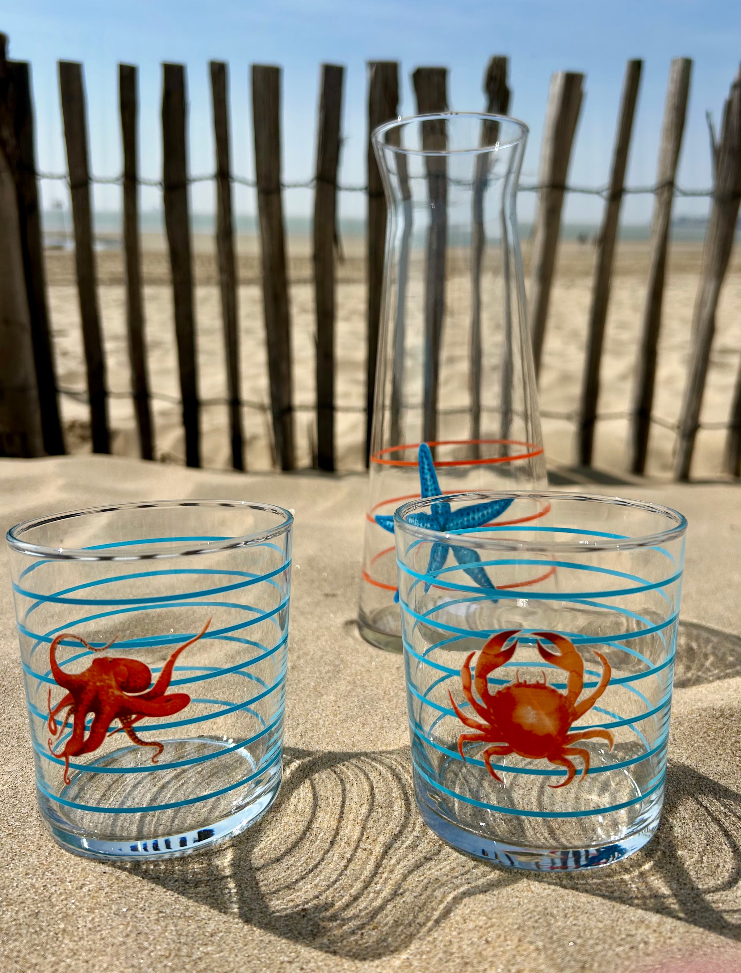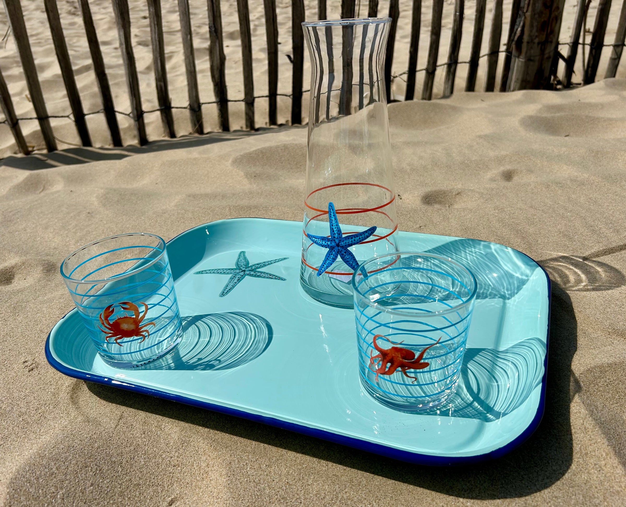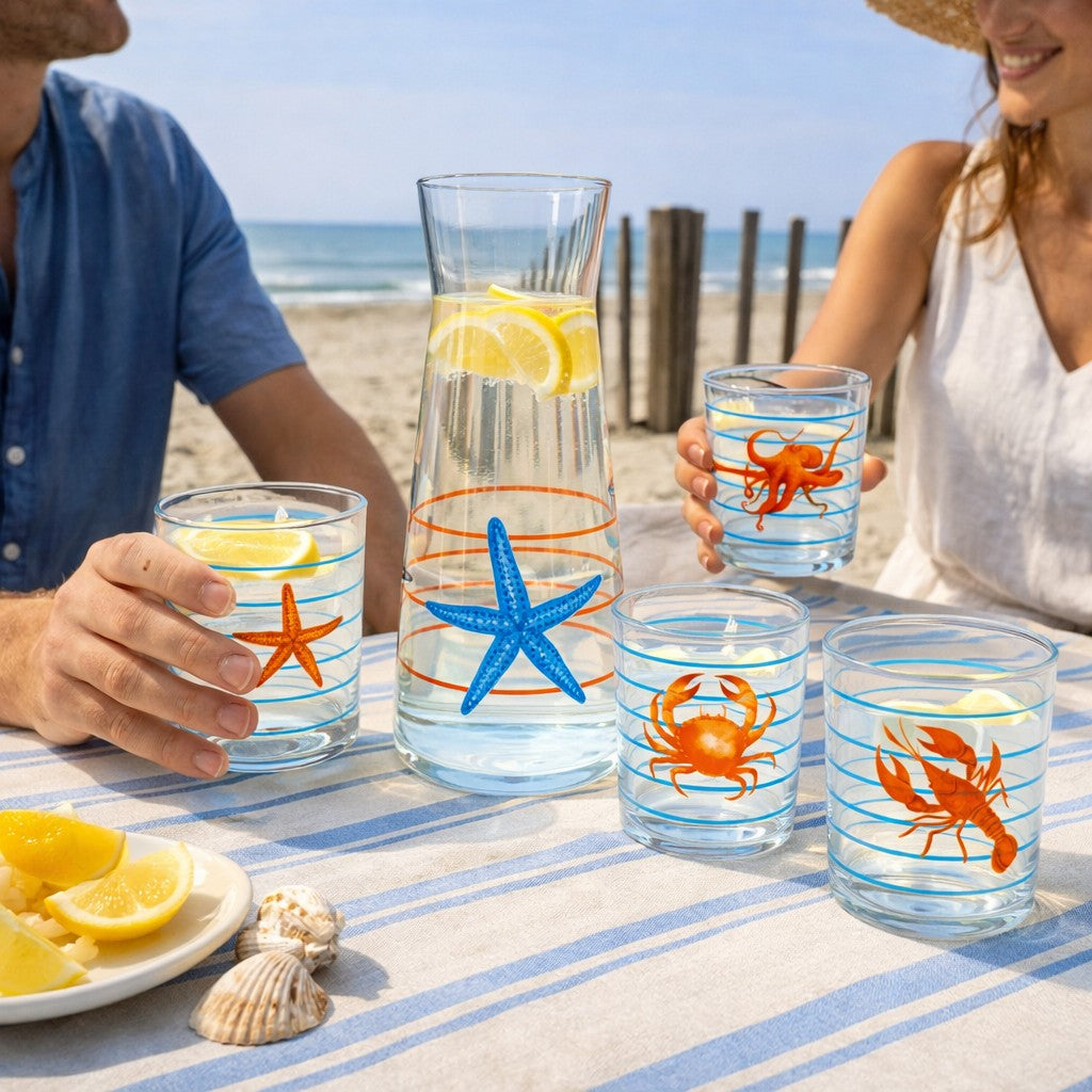 Apportez une touche fraîche et estivale à votre table avec cette carafe en verre décorée d’une étoile de mer bleue. Son design épuré sublimé par des rayures rouges délicates évoque instantanément l’ambiance des vacances au bord de l’océan.
