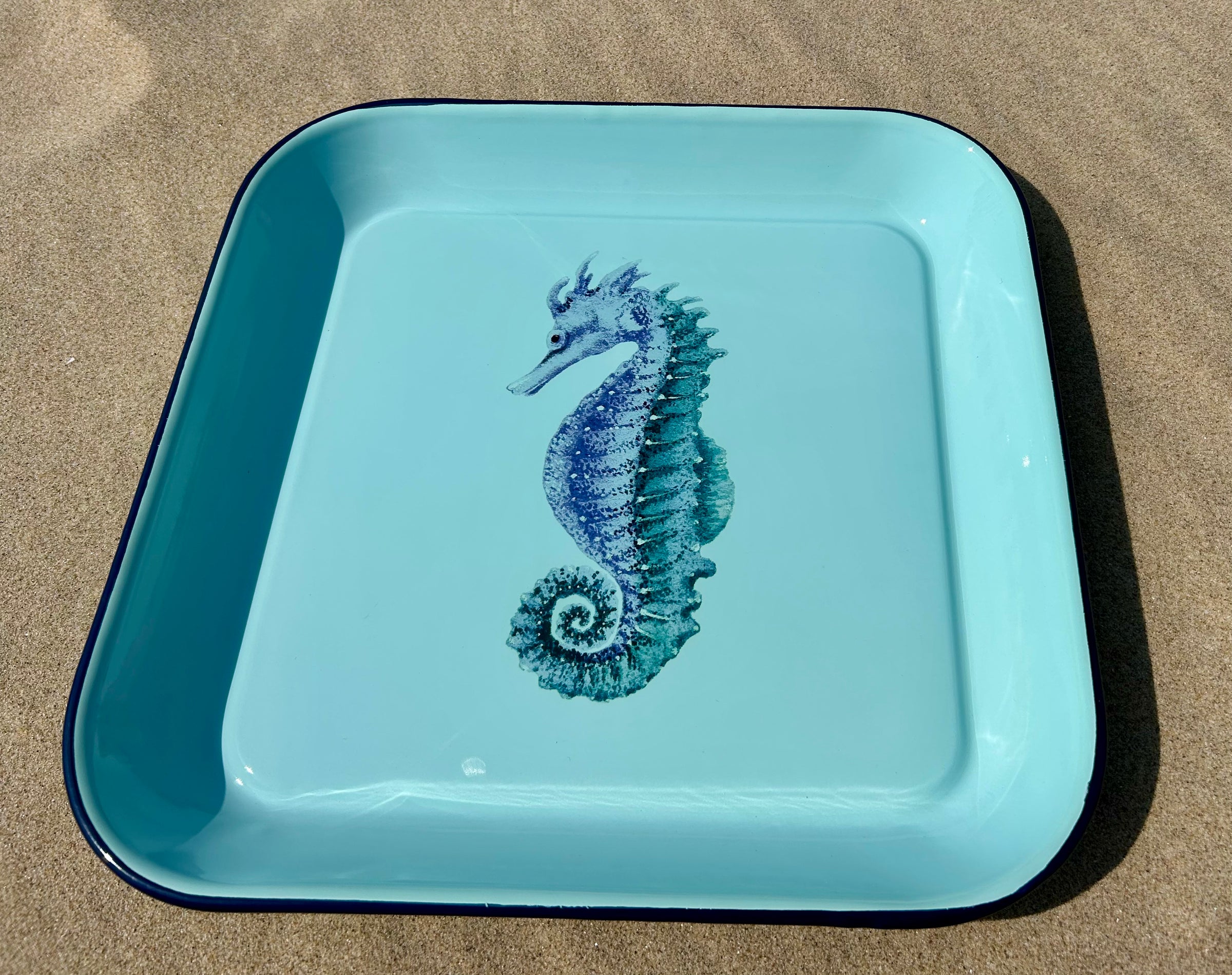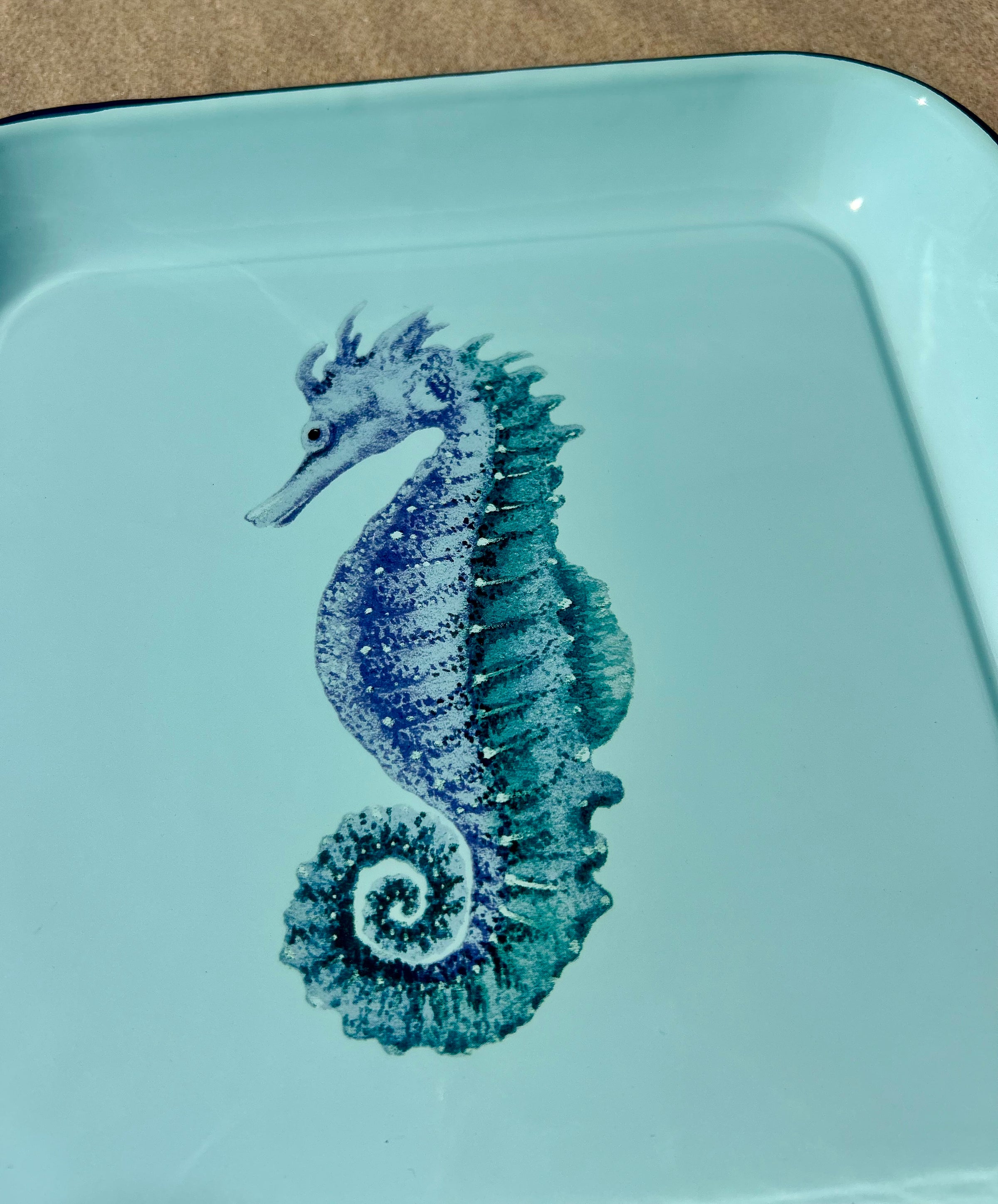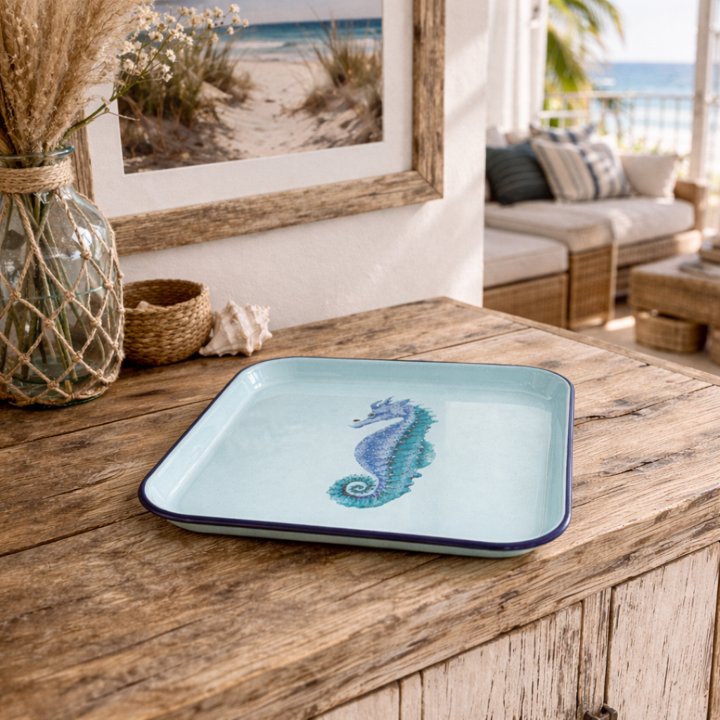 Apportez une touche d’élégance marine à votre table avec ce plateau carré en tôle émaillée bleue, sublimé par un délicat décor hippocampe. Idéal pour servir boissons, café ou apéritifs, il s’intègre parfaitement dans une décoration bord de mer, maison de vacances ou esprit côtier chic.