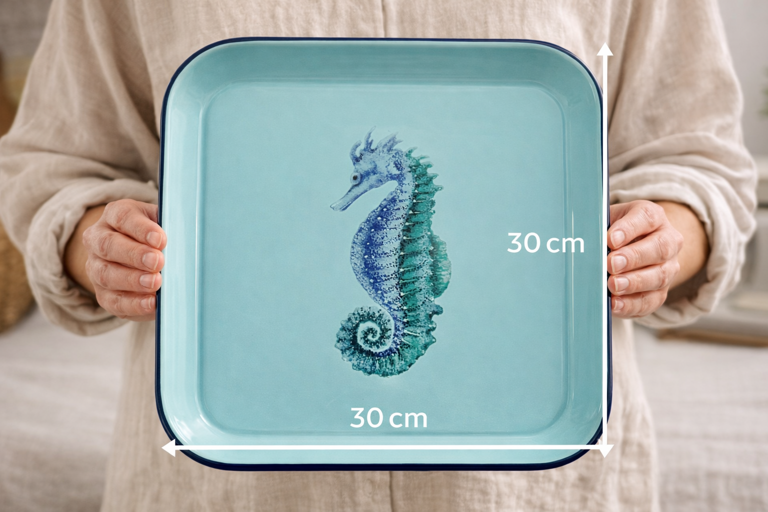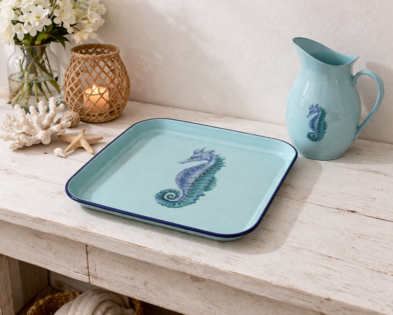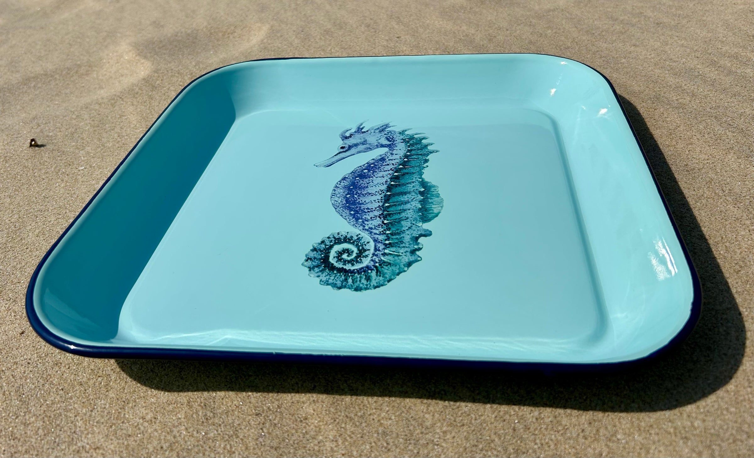 Apportez une touche d’élégance marine à votre table avec ce plateau carré en tôle émaillée bleue, sublimé par un délicat décor hippocampe. Idéal pour servir boissons, café ou apéritifs, il s’intègre parfaitement dans une décoration bord de mer, maison de vacances ou esprit côtier chic.